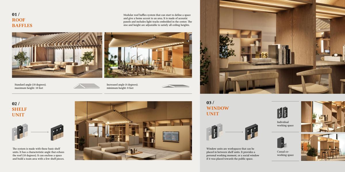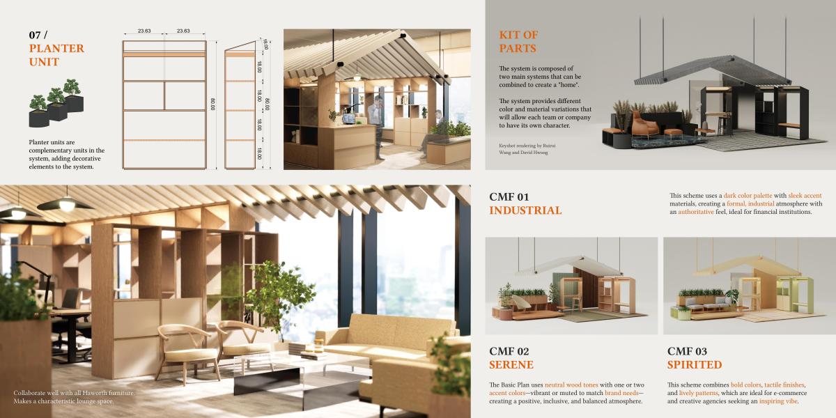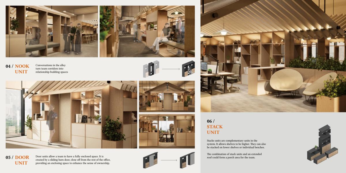 The Neighborhood Collection is a modular office system that helps teams reconnect in hybrid work environments. Inspired by neighborhoods, it uses customizable parts—shelves, roof baffles, doors, planters—to let teams design their own “house” within a shared “community.” By fostering comfort, ownership, and collaboration, it turns offices into places people want to return to, blending privacy and openness in a personalized, connected environment.