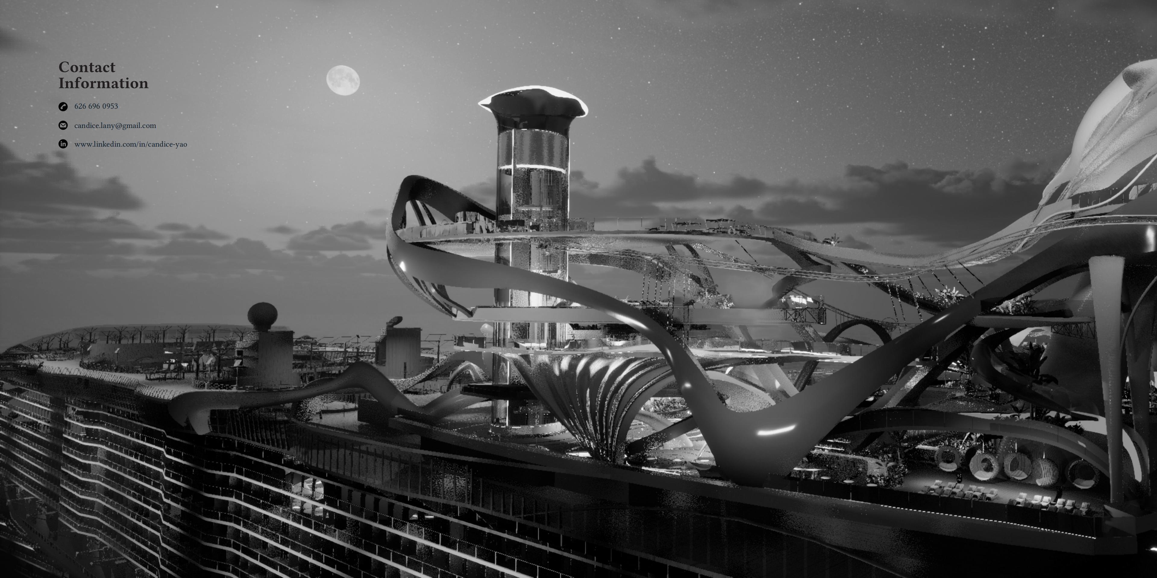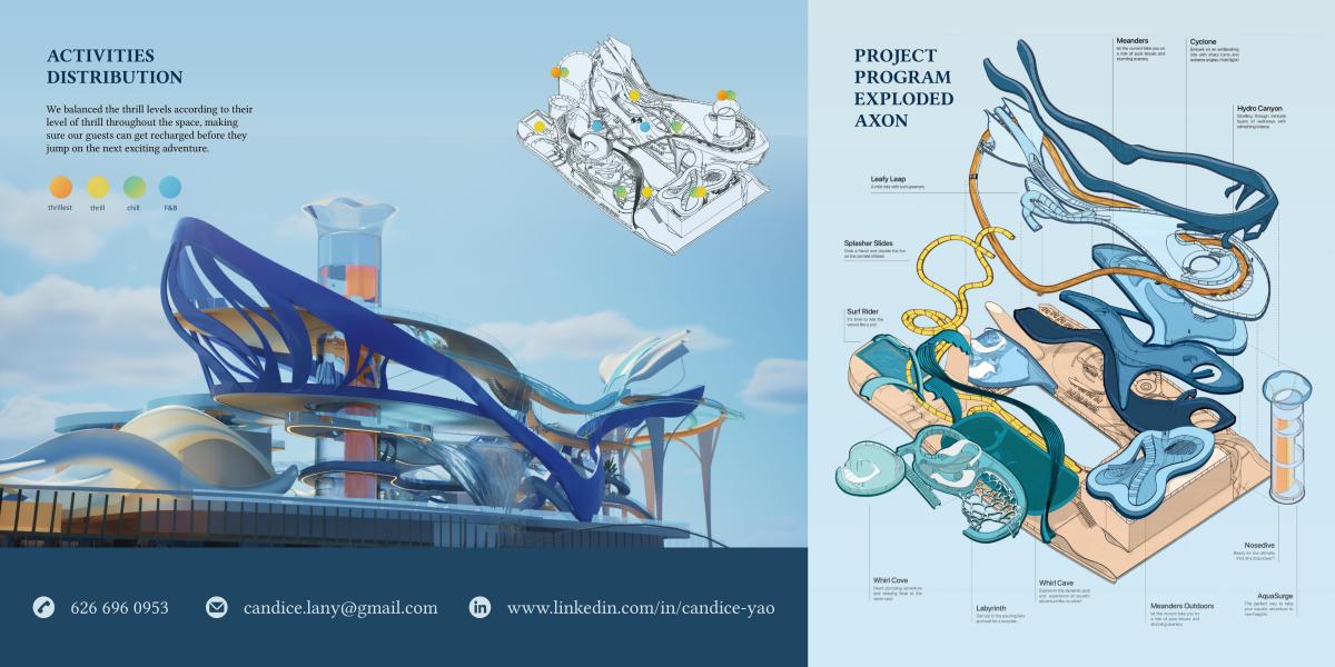 In this team project with Product Designer Tina Tang and Spatial Designer Robbie Li, I led brand elevation, spatial narrative, form language, program ideation, visual communication, 3D and physical modeling, rendering, and presentation. I also learned key considerations for water-based design—how to shape experiences around water—and how to plan entertainment spaces that balance excitement, safety, circulation, and guest comfort.