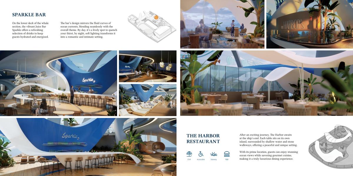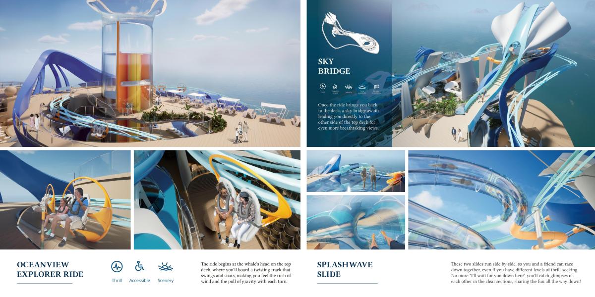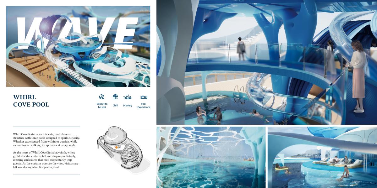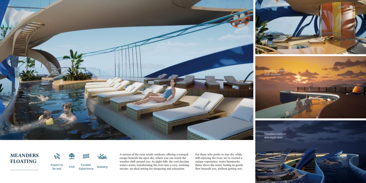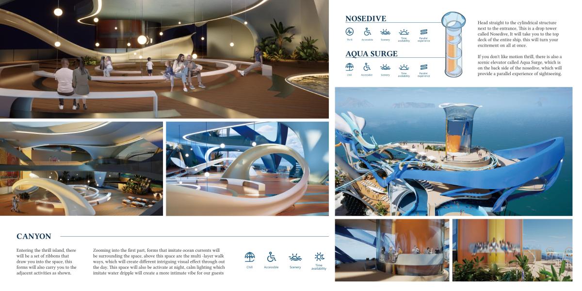 Thrill Island transforms a cruise ship deck into two multi-level water parks—Whale Park and Wave Park—featuring rides, slides, pools, scenic routes, and themed dining. Designed for guests of all ages, it blends ocean-inspired forms, varied thrill levels, and immersive spaces to offer both adventure and relaxation, creating memorable experiences that connect people and strengthen the brand.