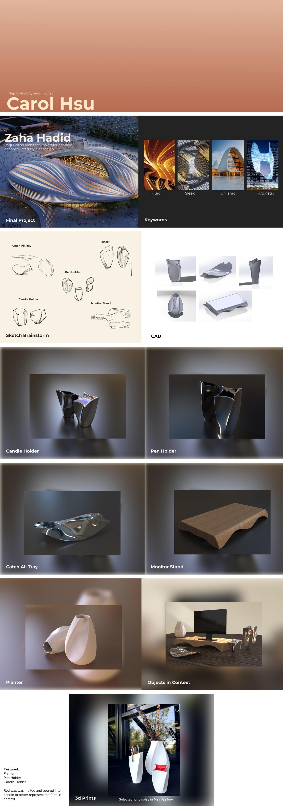 **Selected to be displayed in Main Gallery. Zaha Hadid is a world-renowned architect famous for her usage of sweeping shapes and bold, geometric lines combined with sleek material finishes to achieve a futuristic and minimalist appeal. This project includes creating desktop accessories inspired by her iconic style. Products were designed in Solidworks and 3d printed with a PLA filament.