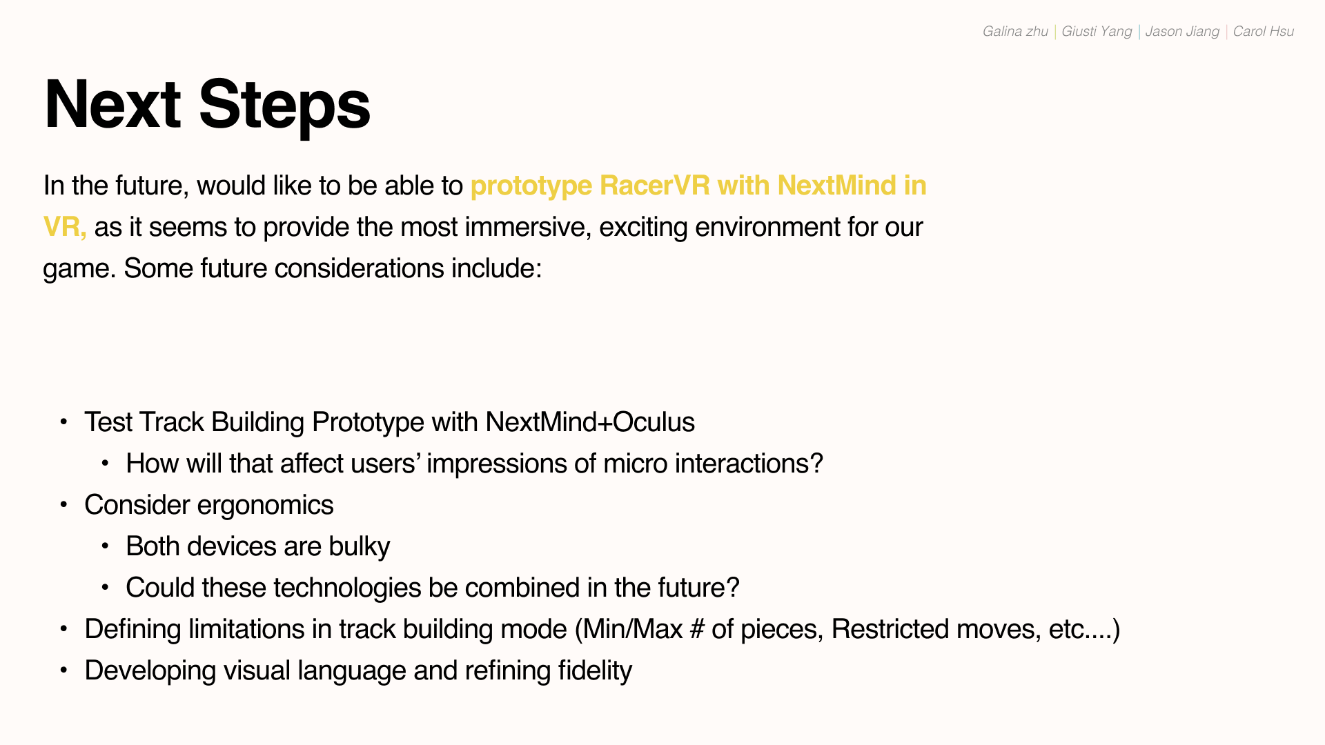 RacerXR is an immersive game concept for the VR curious of all skills levels to build and race custom racetracks. This project was explored primarily for conducting HCI usability research and testing. Final deliverables include qualitative and quantitative analysis, heuristic analysis, prototypes for testing, and design validations.