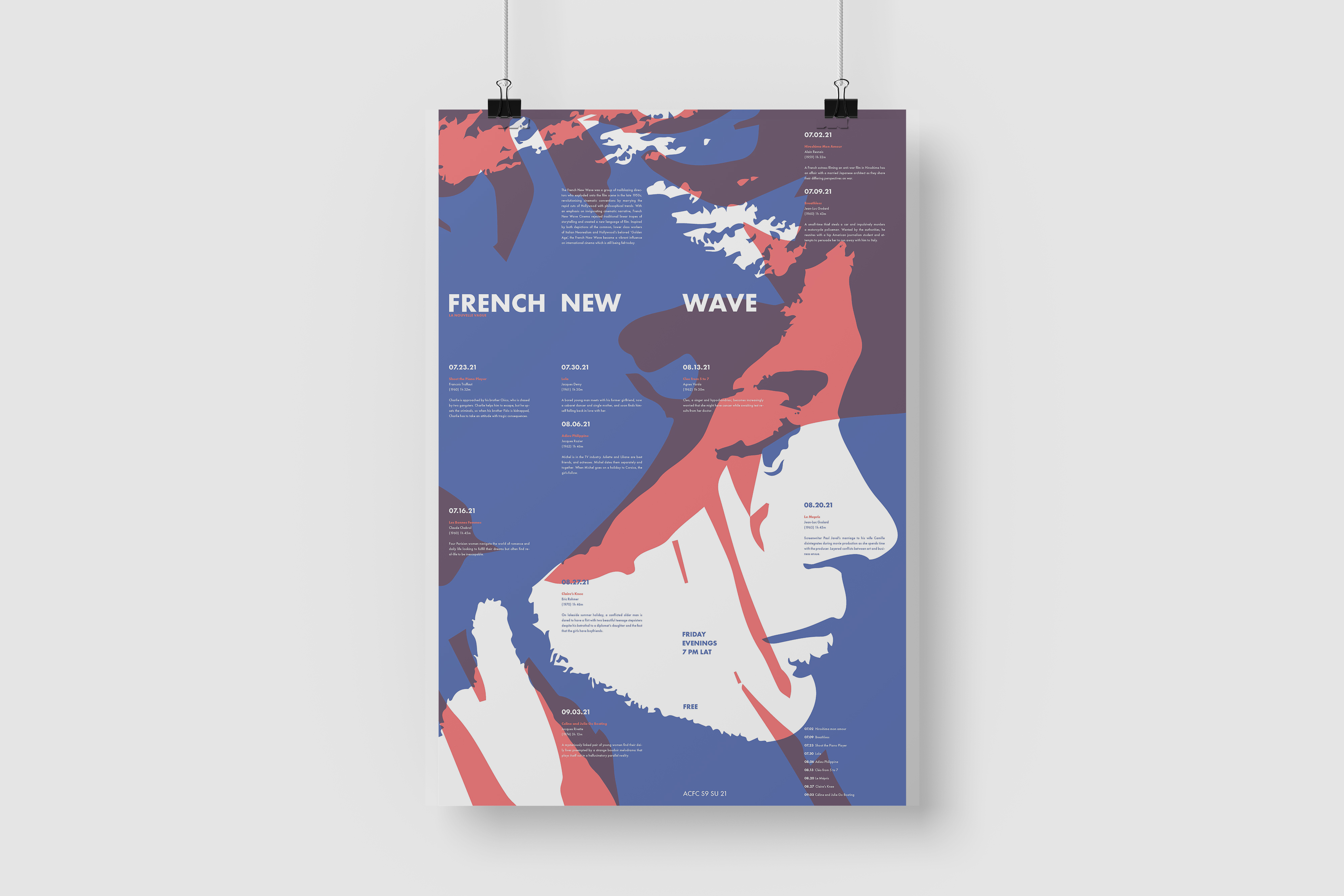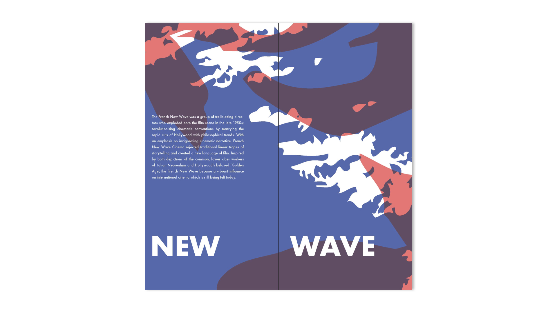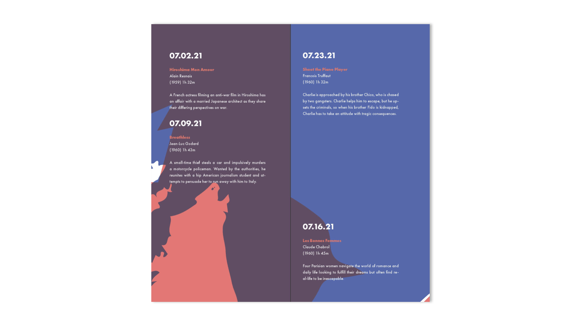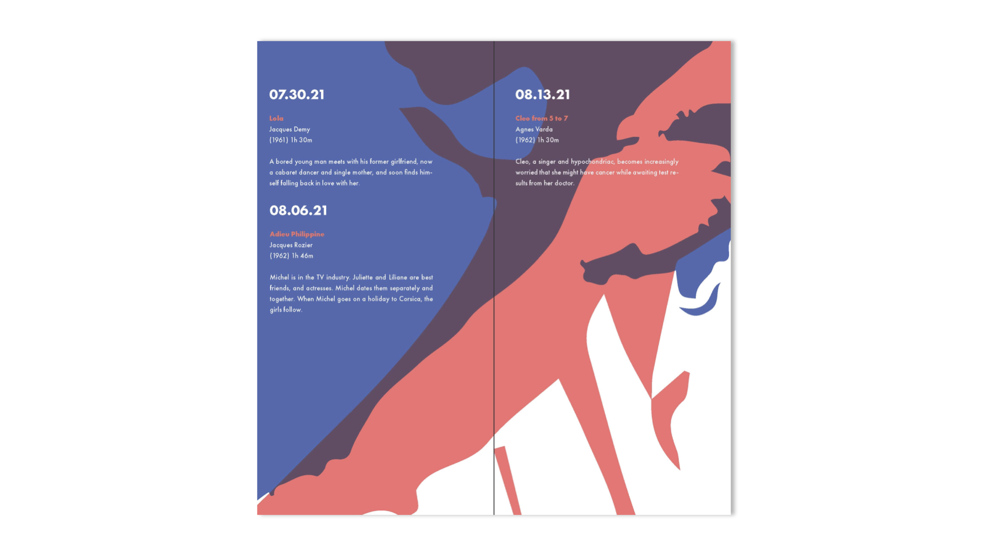 This calendar poster/brochure focuses on presenting 10 movies from the New French Wave. The imagery is a collage of movie stills from the 10 movies presented in the poster, aiming to capture the clashing ideas of filmmaking in this era through the contrasting colors.