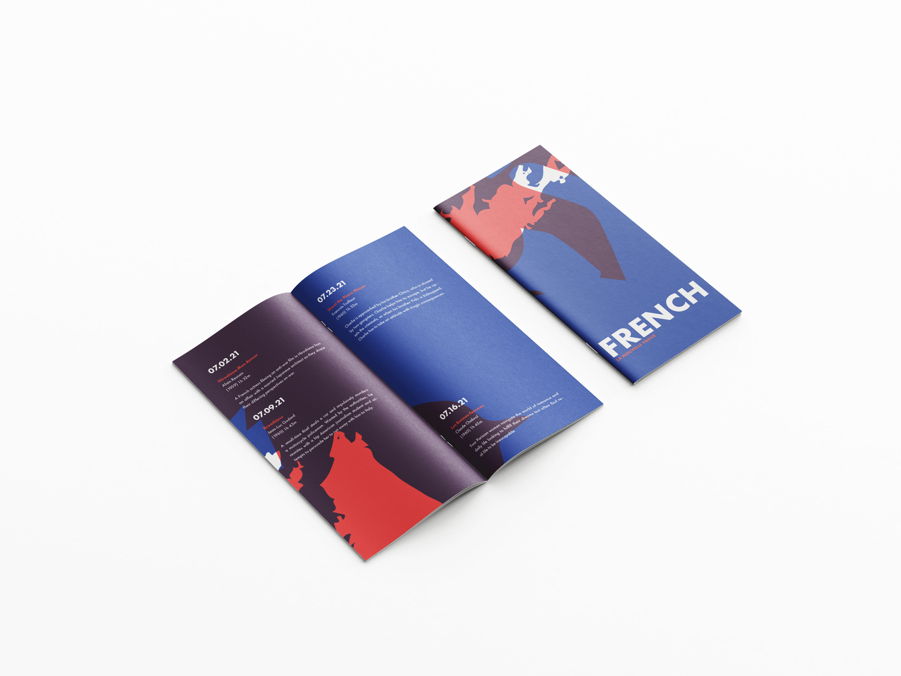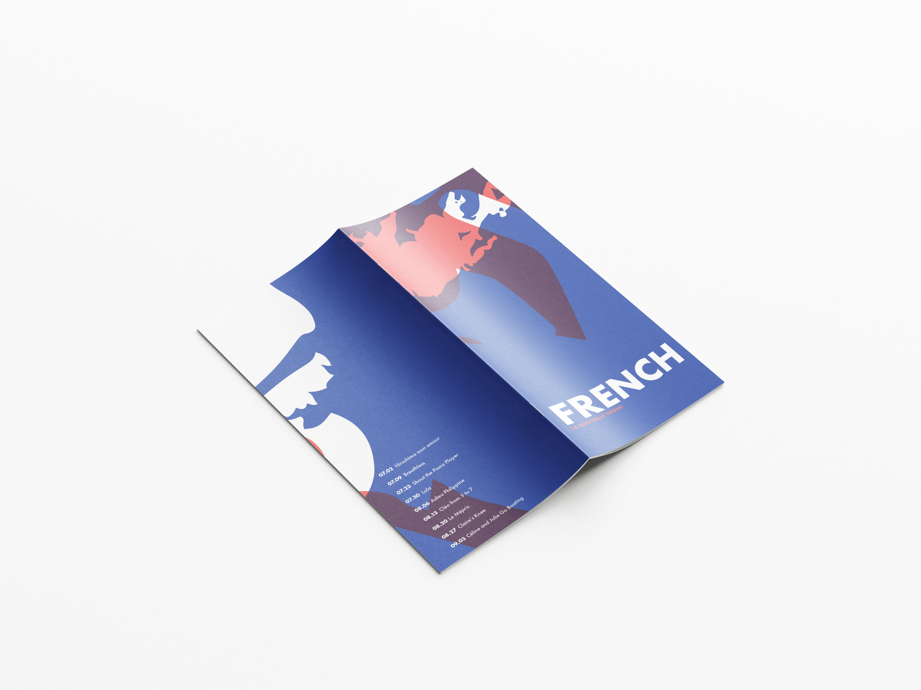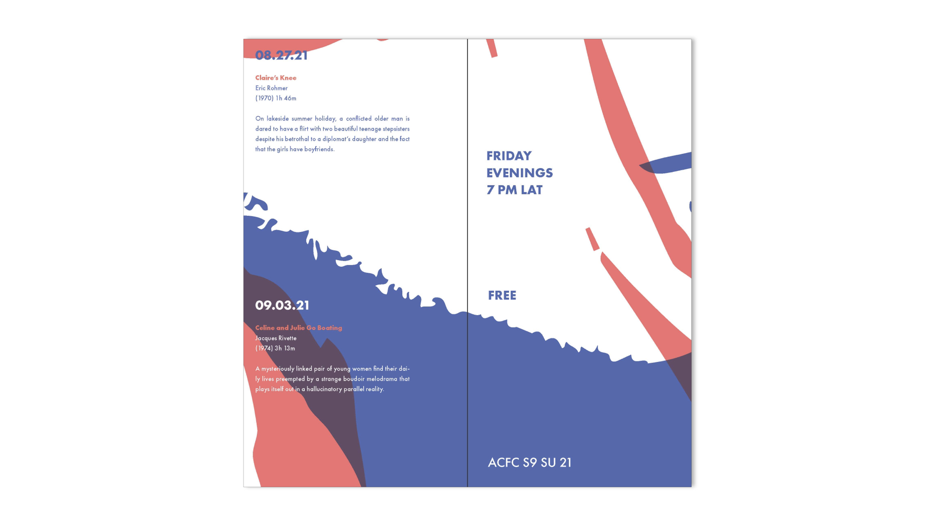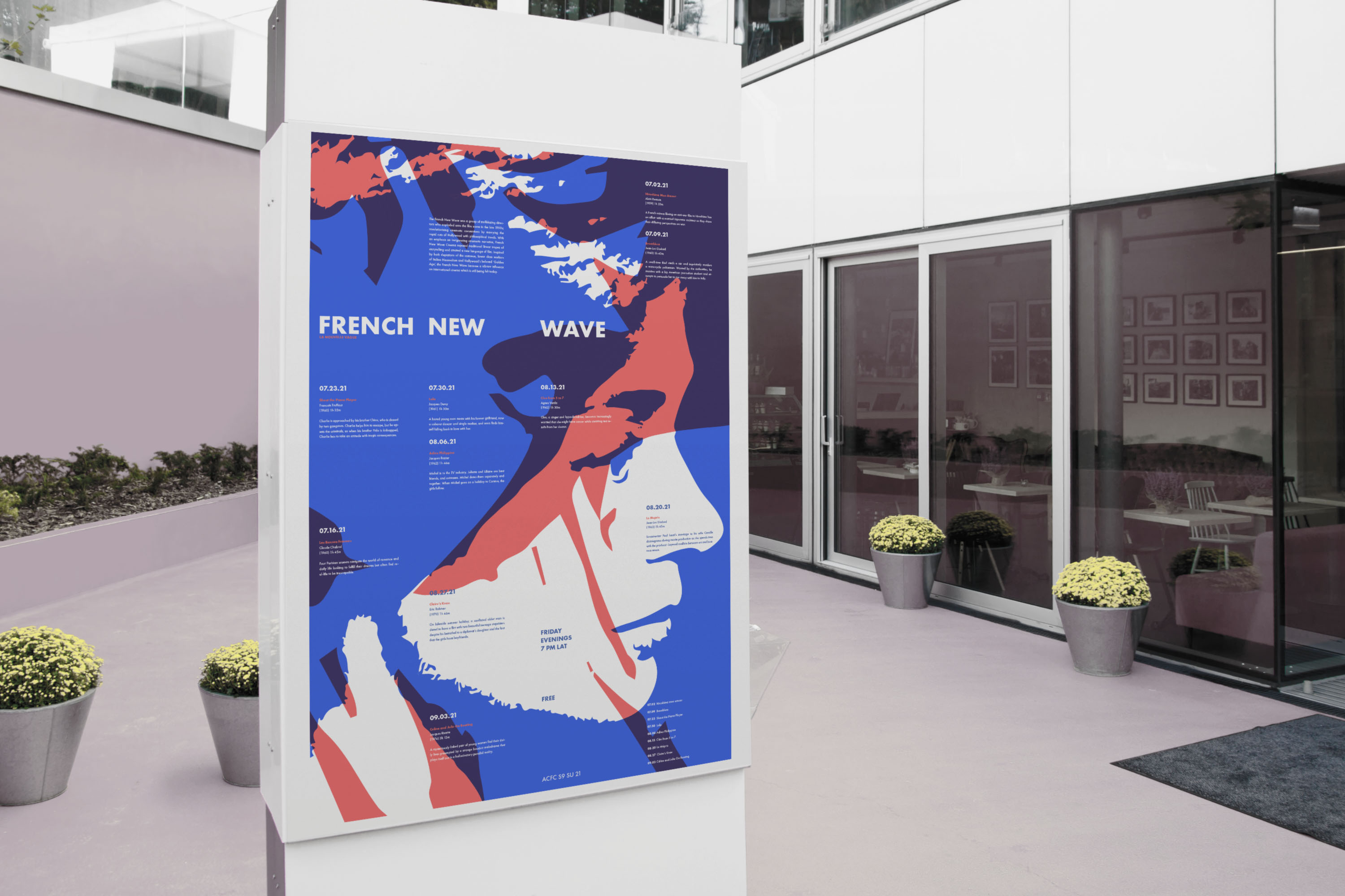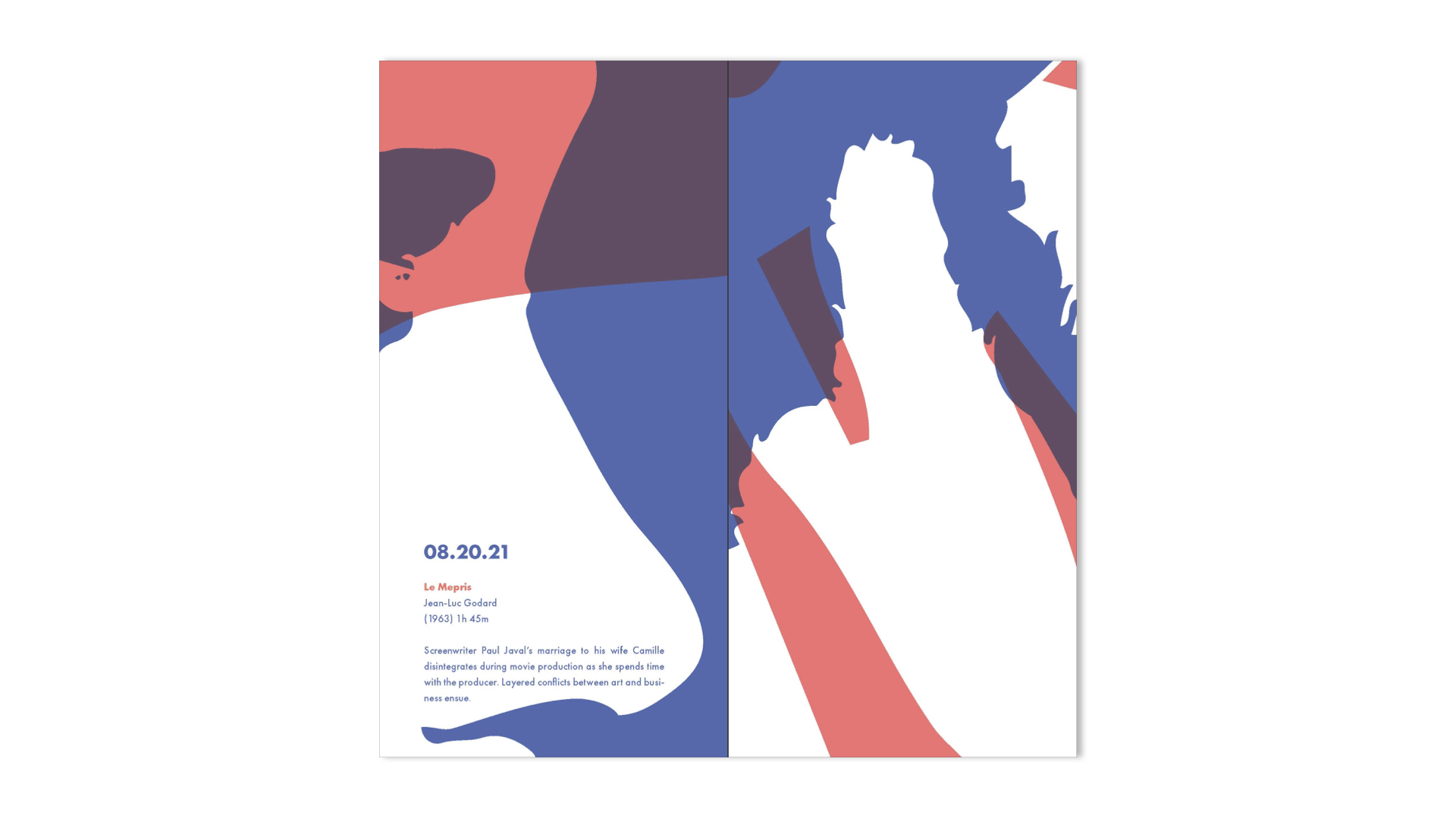This calendar poster/brochure focuses on presenting 10 movies from the New French Wave. The imagery is a collage of movie stills from the 10 movies presented in the poster, aiming to capture the clashing ideas of filmmaking in this era through the contrasting colors.