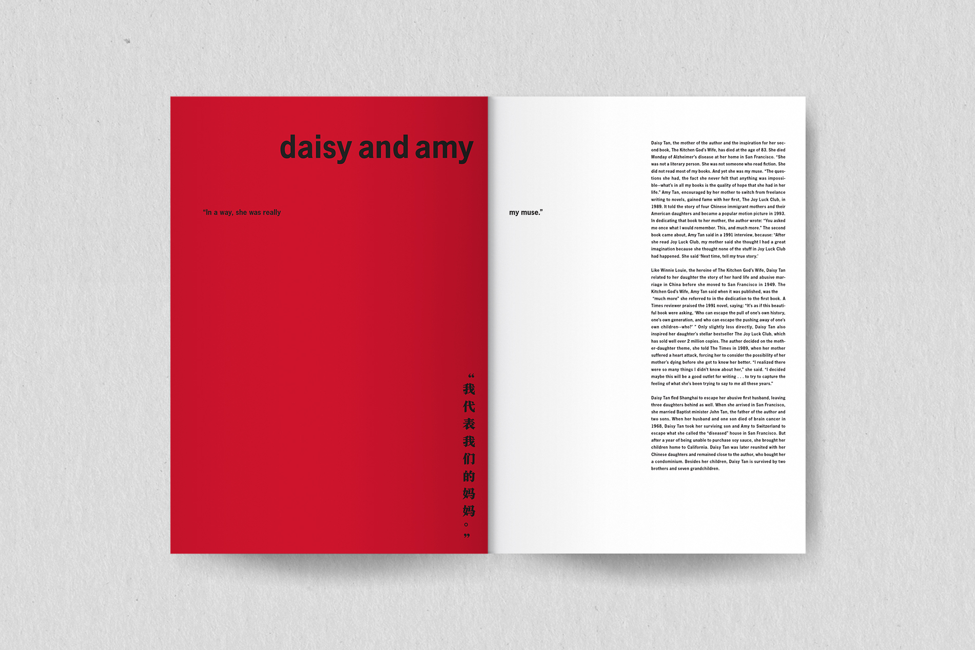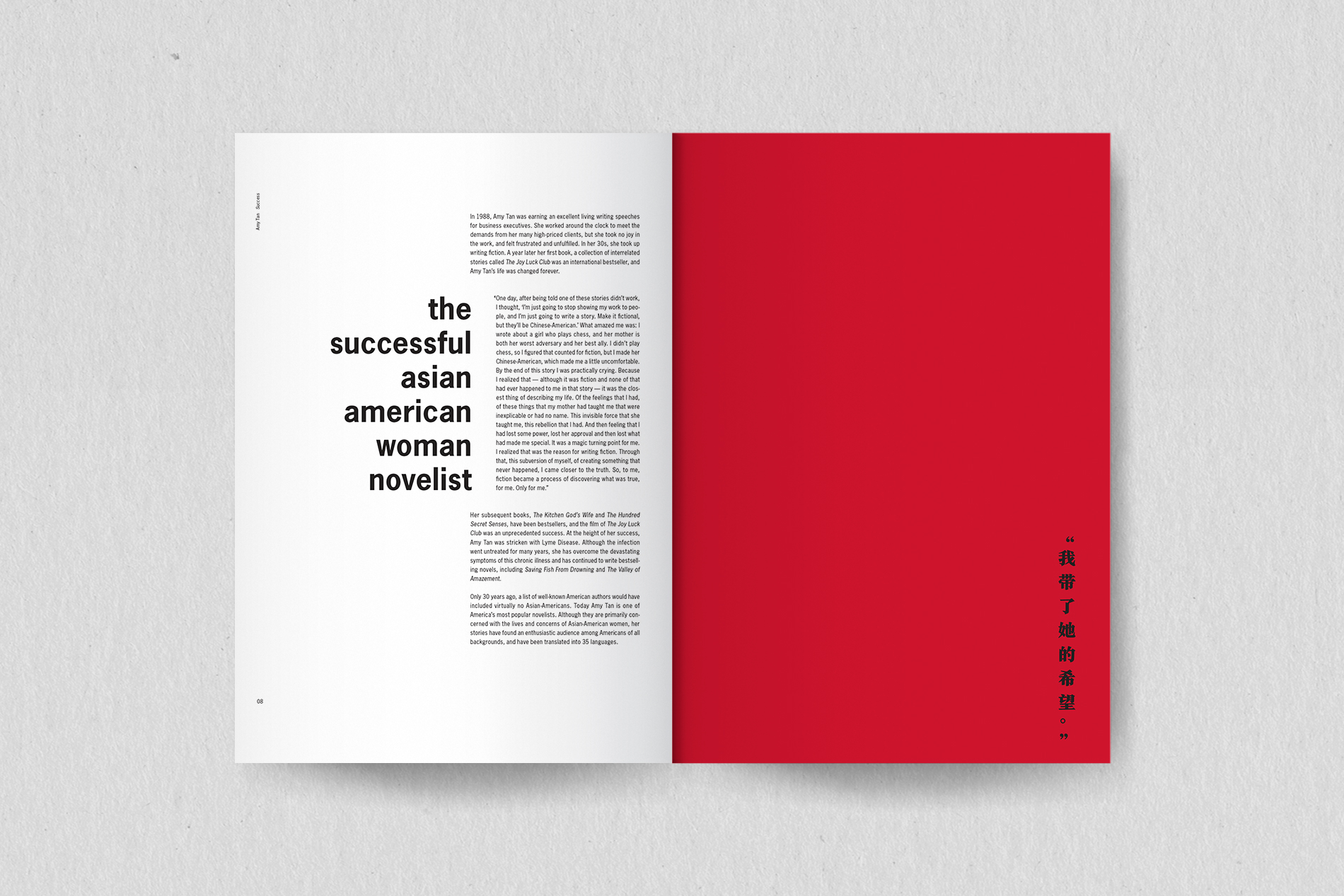The book presents essays, novels, poems, and/or magazines written by and/or about the author, Amy Tan. She is an influential writer in the Asian American community, representing the Chinese culture that she was inspired by her mother. I choose Amy Tan because I felt connected to her background and I wanted to bring more attention to the Asian American community.