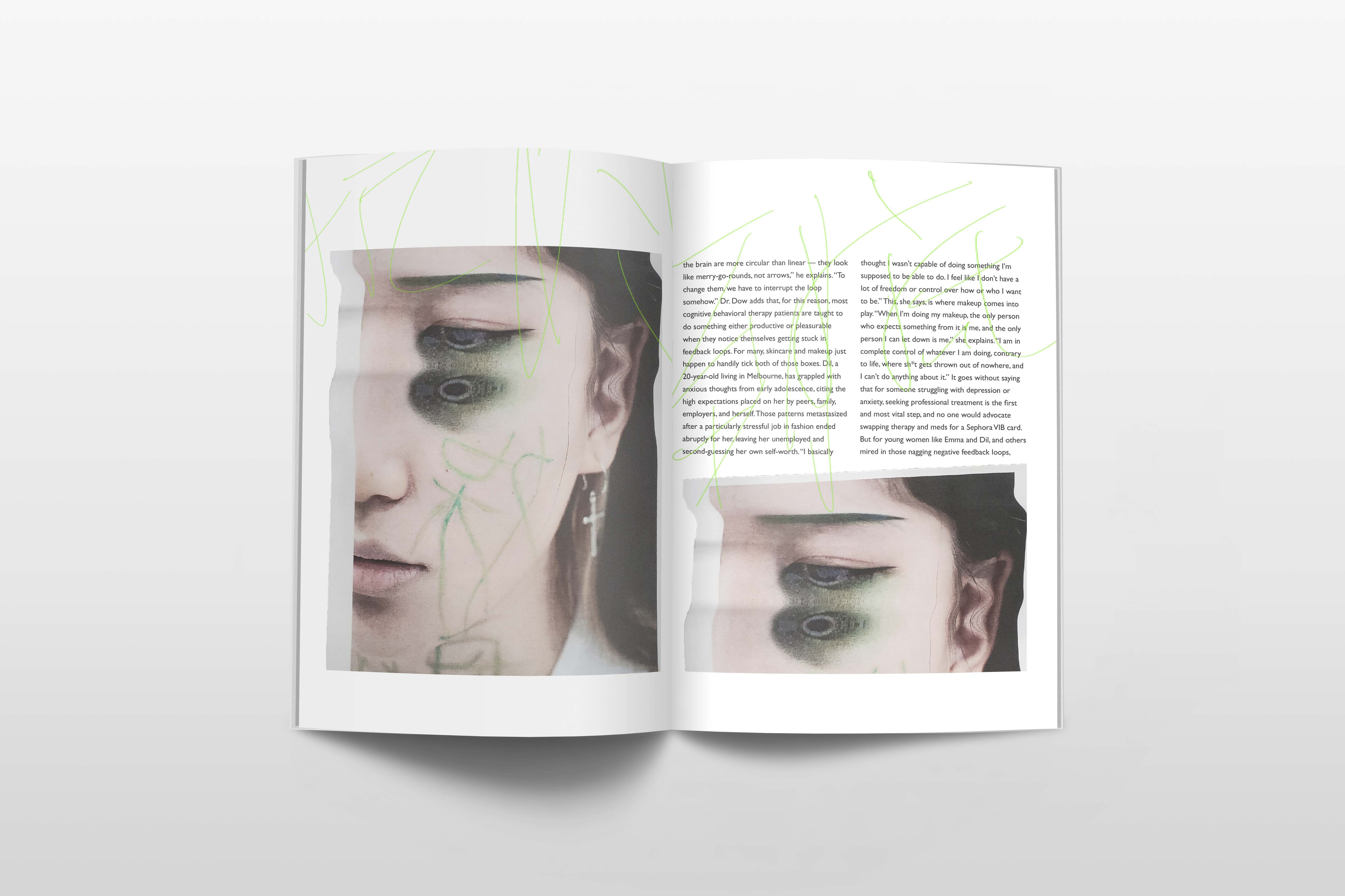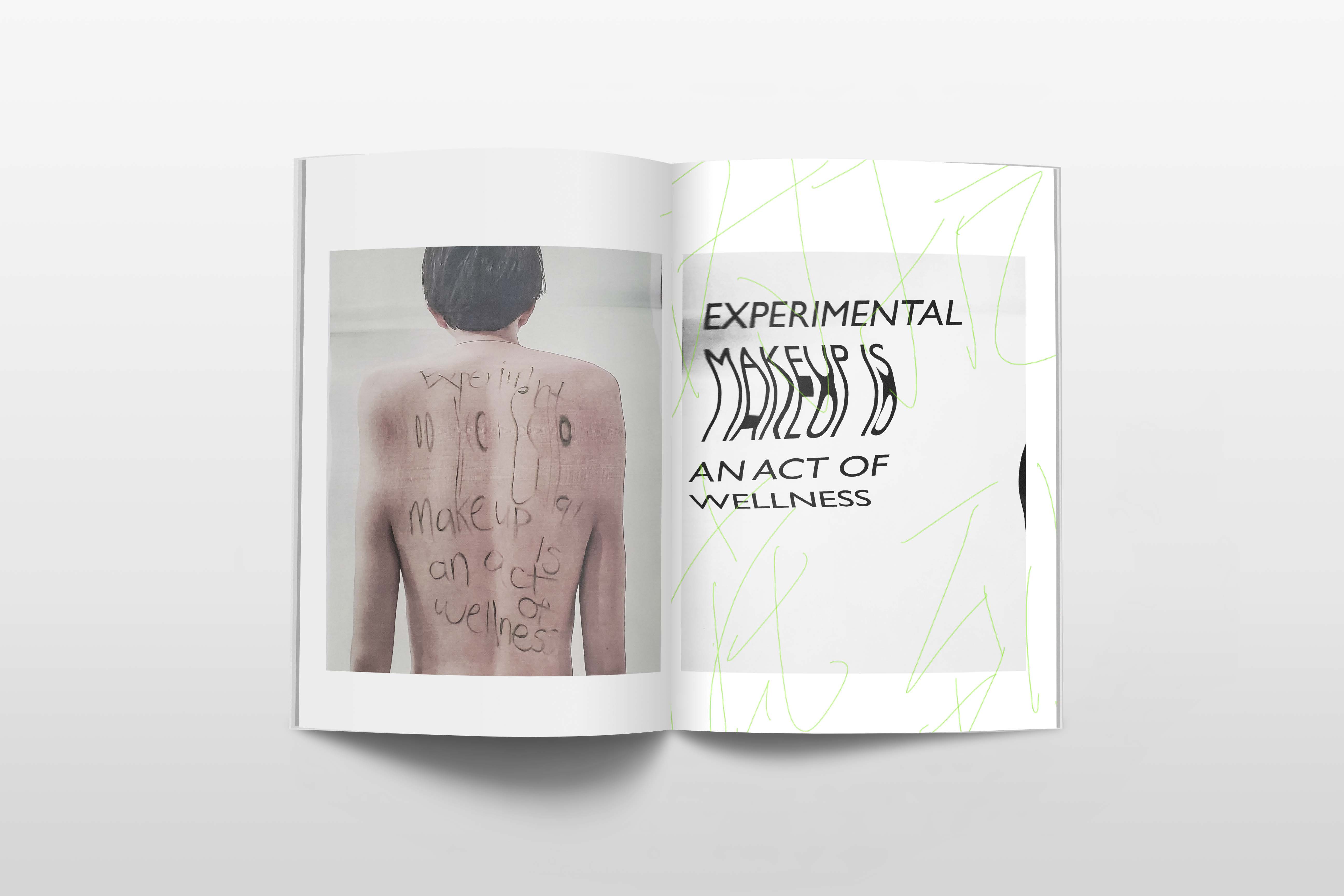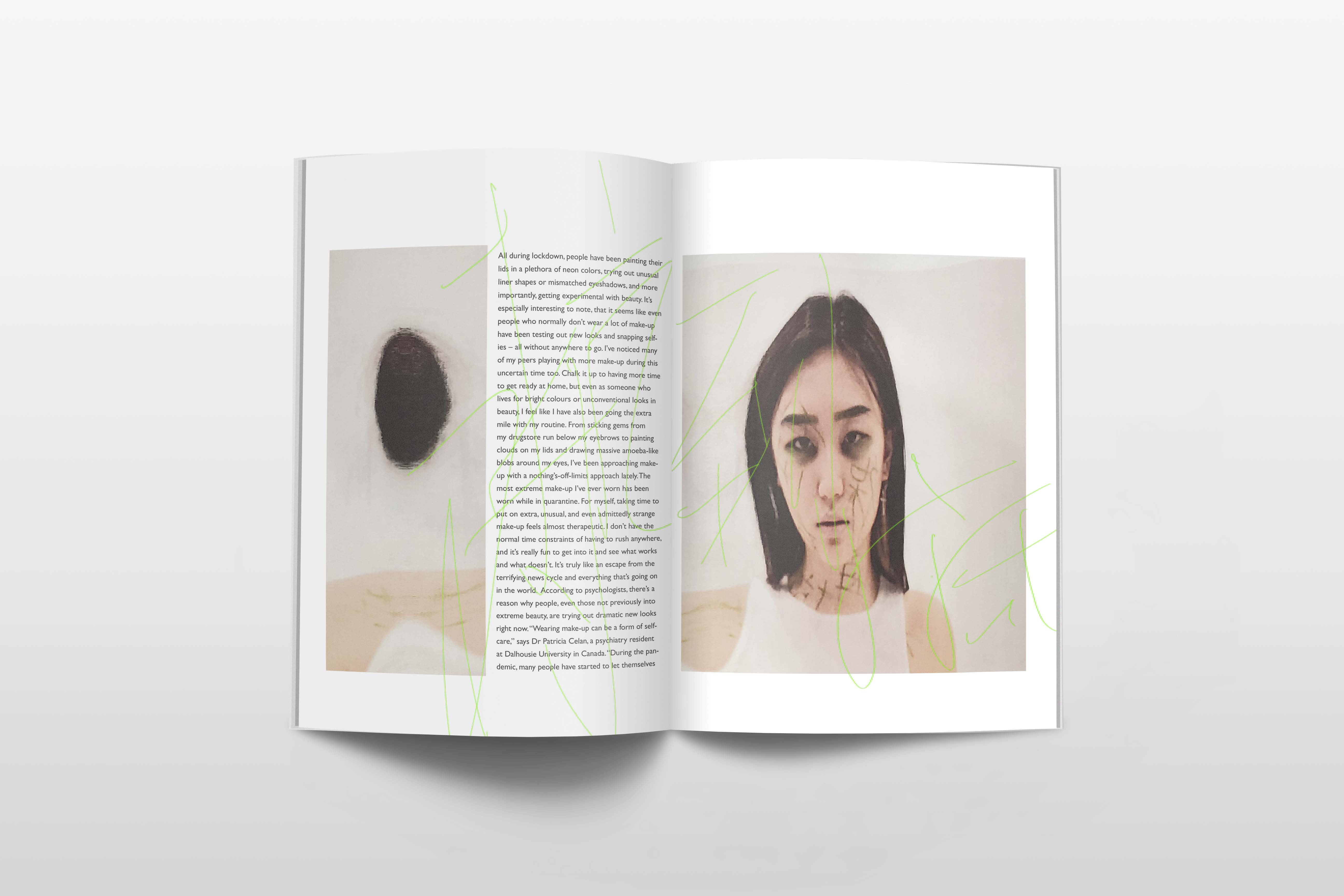Process of image creating. The makeup is inspired by experimental makeup, which focuses on self-expression. This makeup represents my breaking through of societal normality. For instance, instead of wearing eyeshadow on my eyelid, I apply it to my undereye. I also used face paint to paint Chinese calligraphy on myself.