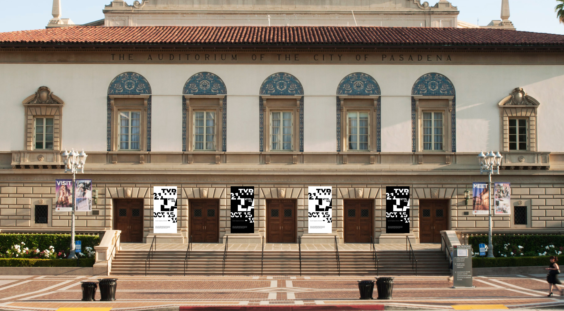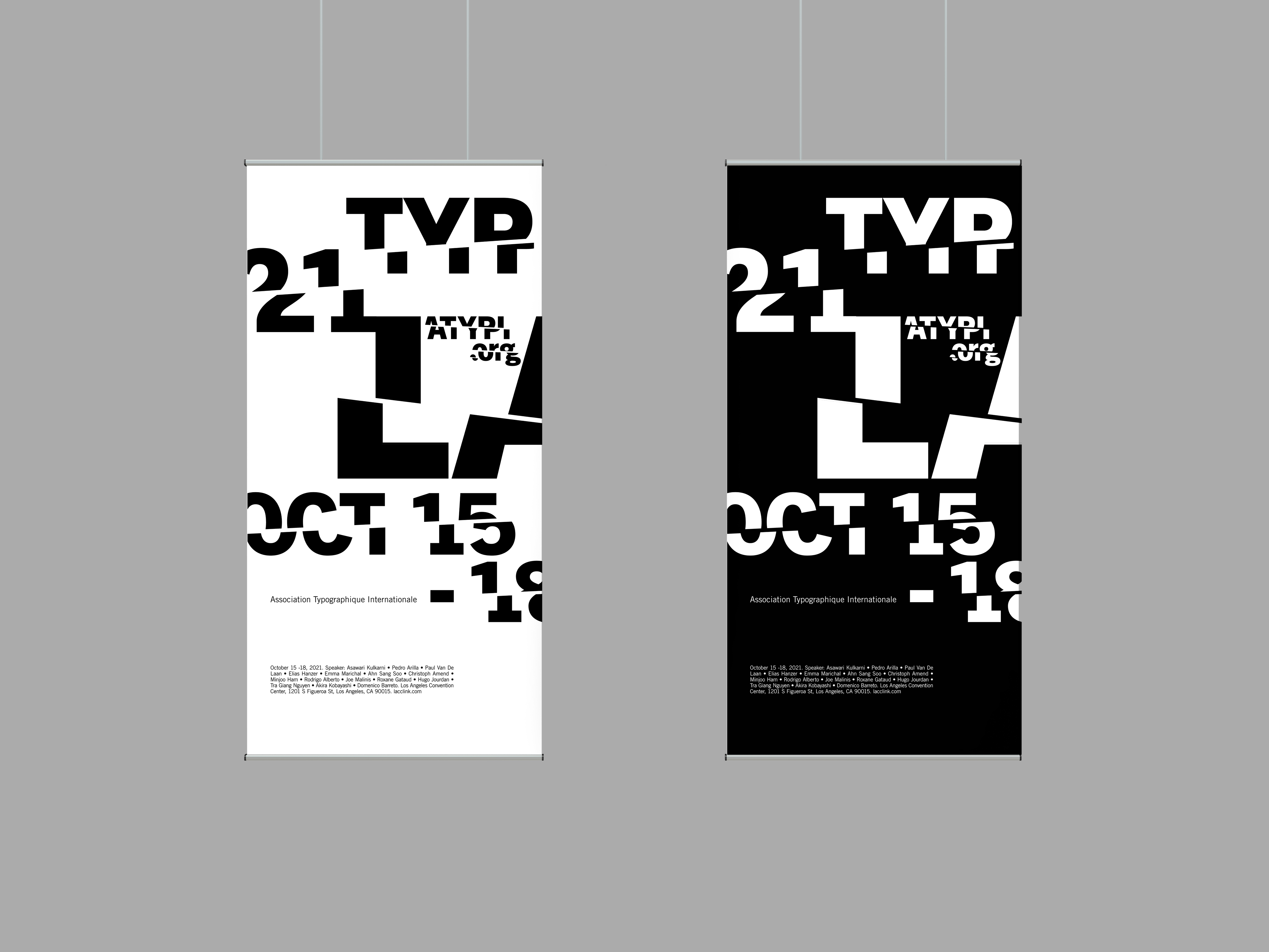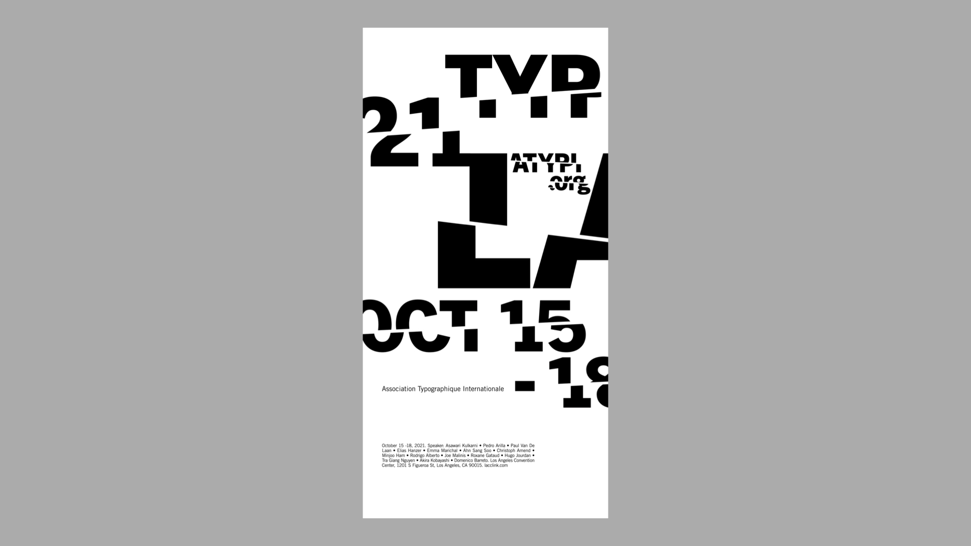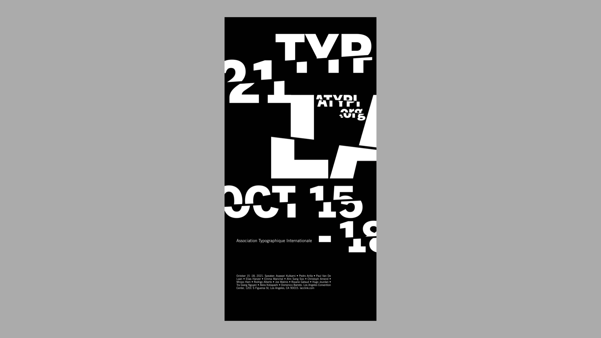 The typographic wordmark is created for a Typographic Conference hosted in Los Angeles featuring different graphic designers and typographers. The typographic conference identity will be used on the two black and white event posters, and other applications such as T-shirts, buttons, and tote bags.