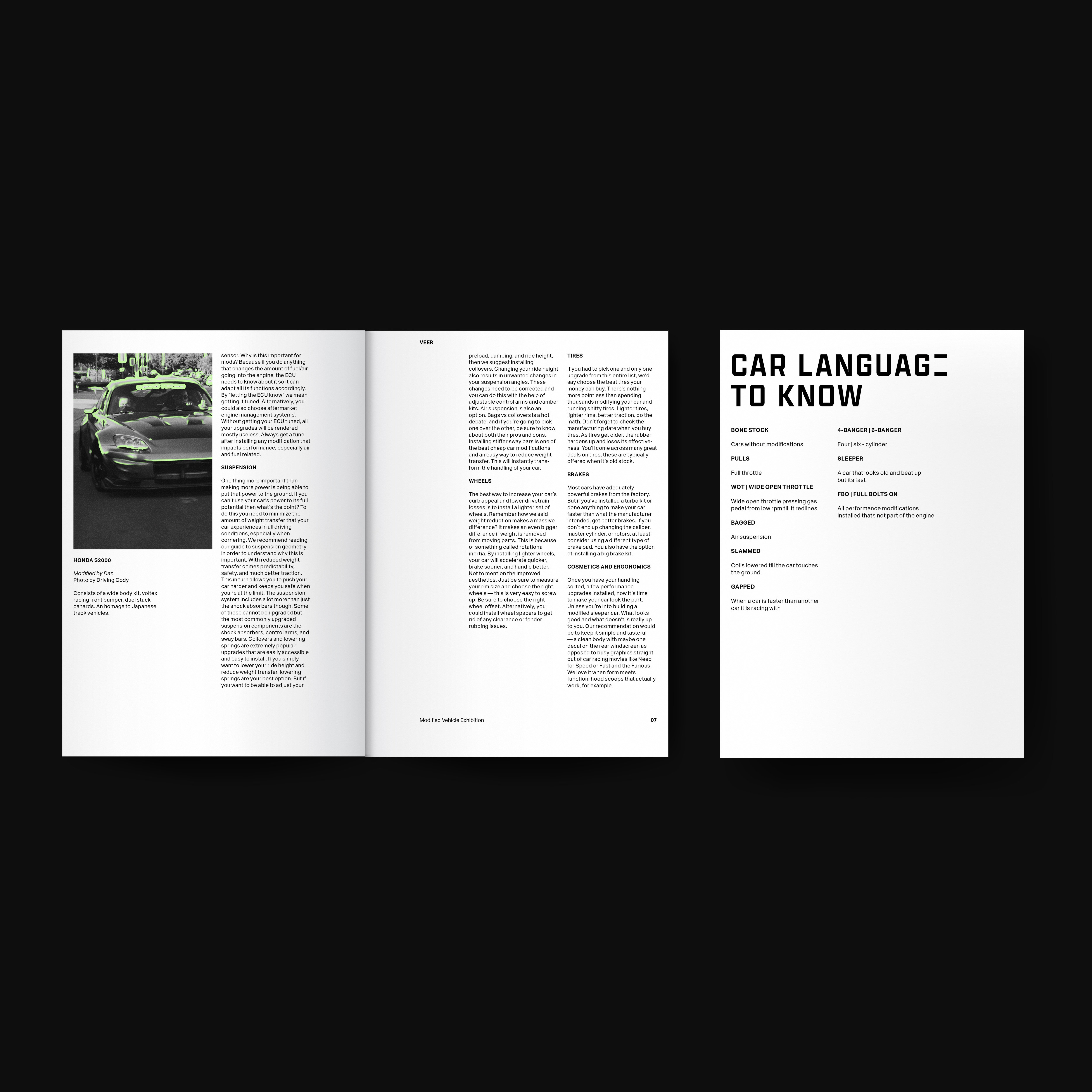 VEER is a hypothetical modified car exhibition at LACMA. This project explores interactive graphics and motion driven by user research. The goal of the project is to empower car enthusiasts by providing a safe learning space and easily accessible through online forum.