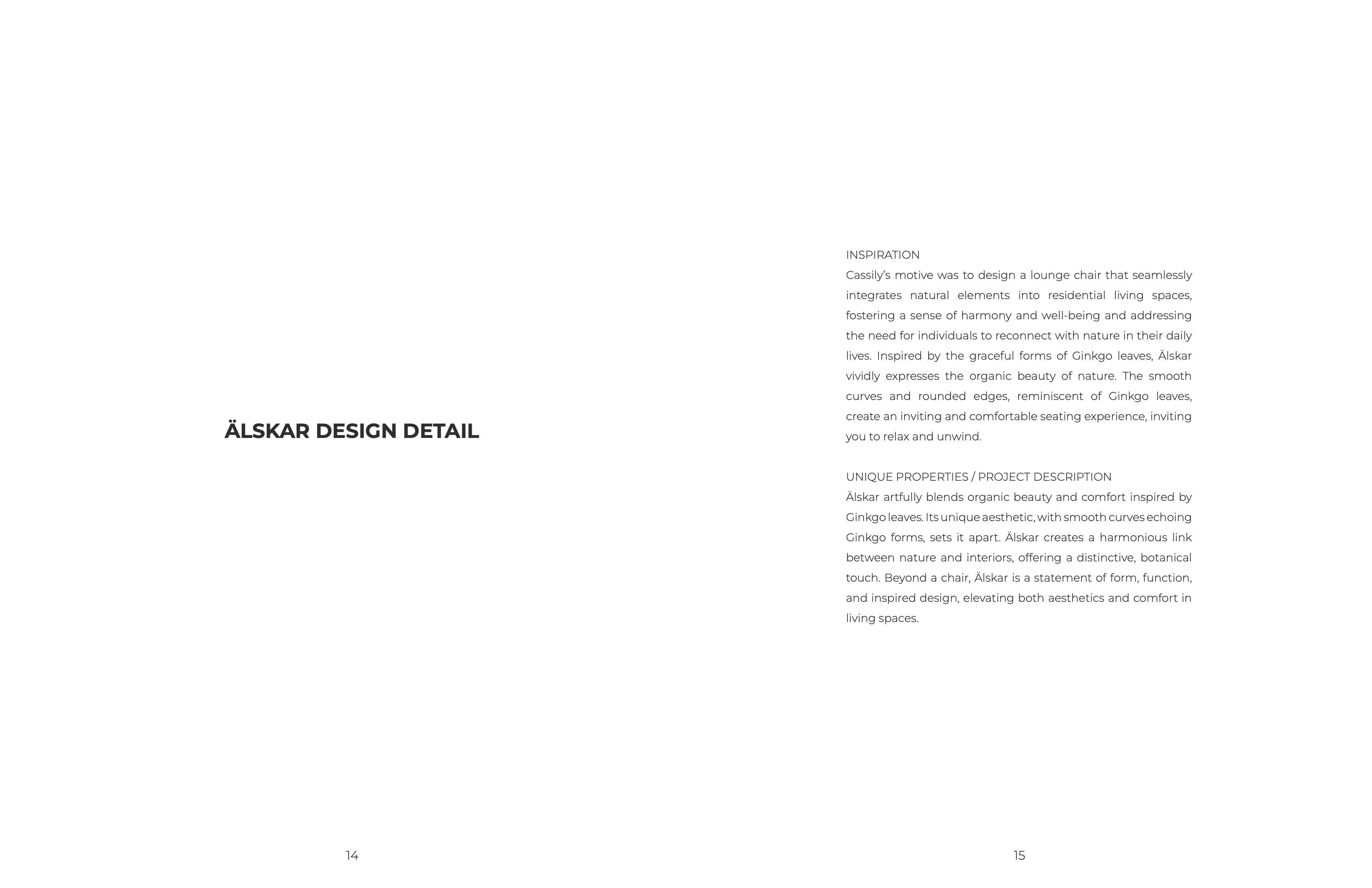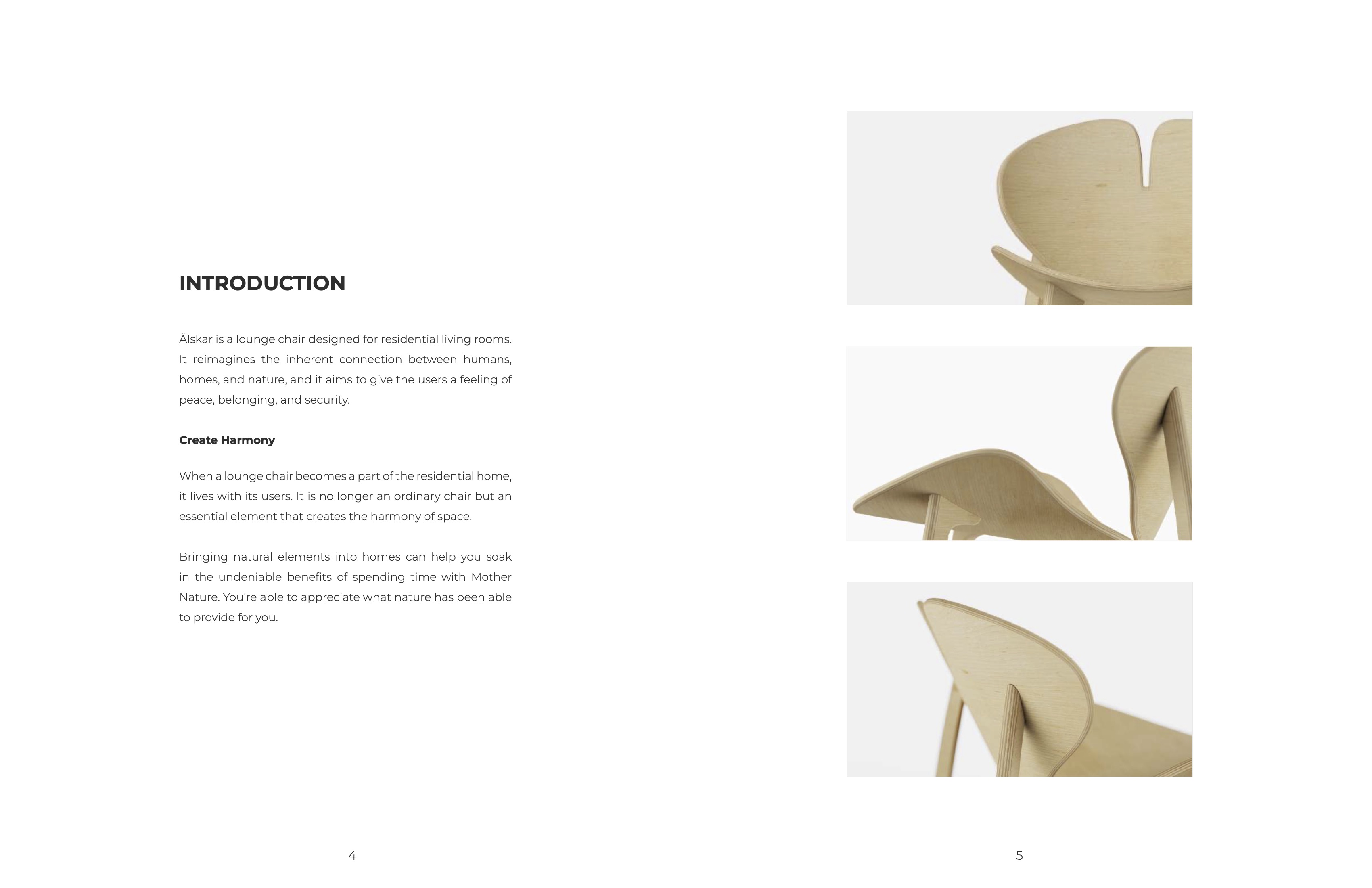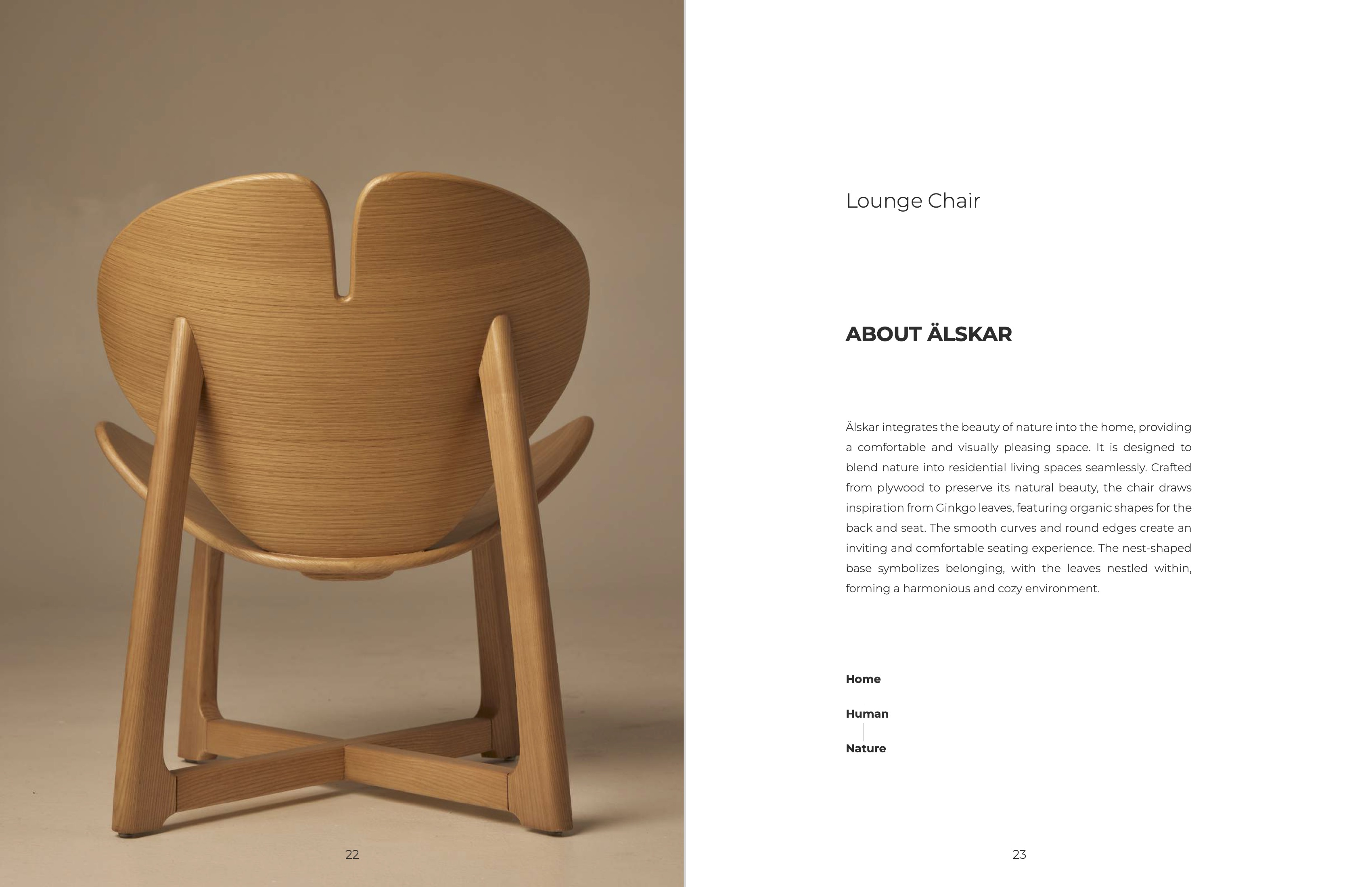 Älskar is a lounge chair designed for residential living rooms. It reimagines the inherent connection between humans, homes, and nature and aims to give the users a feeling of peace, belonging, and security.