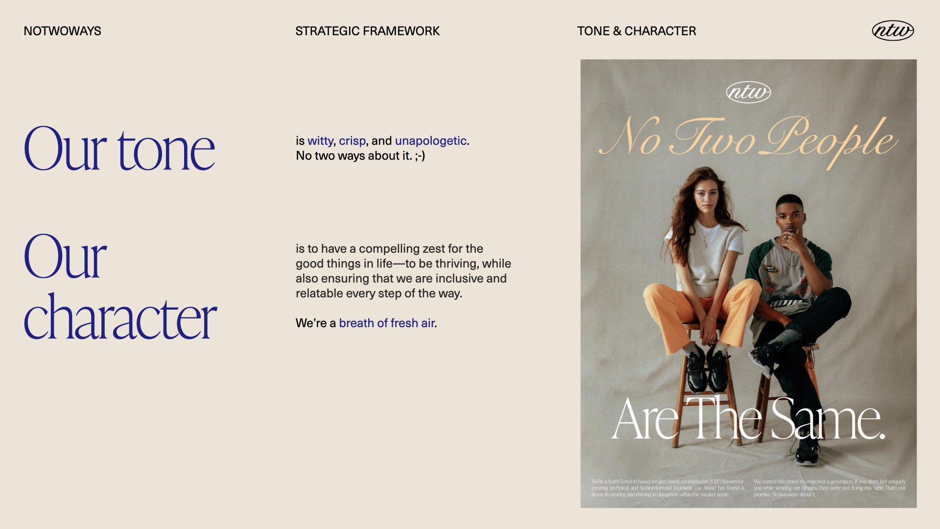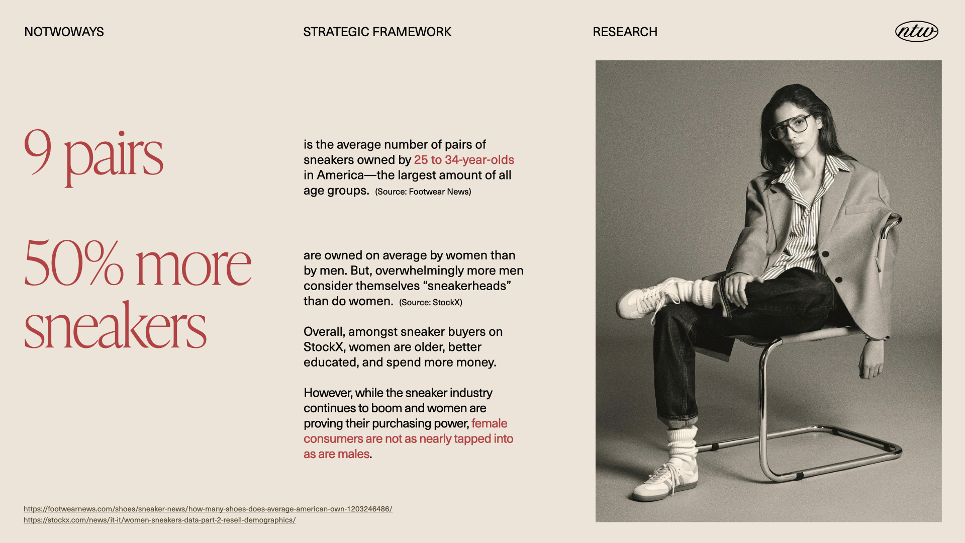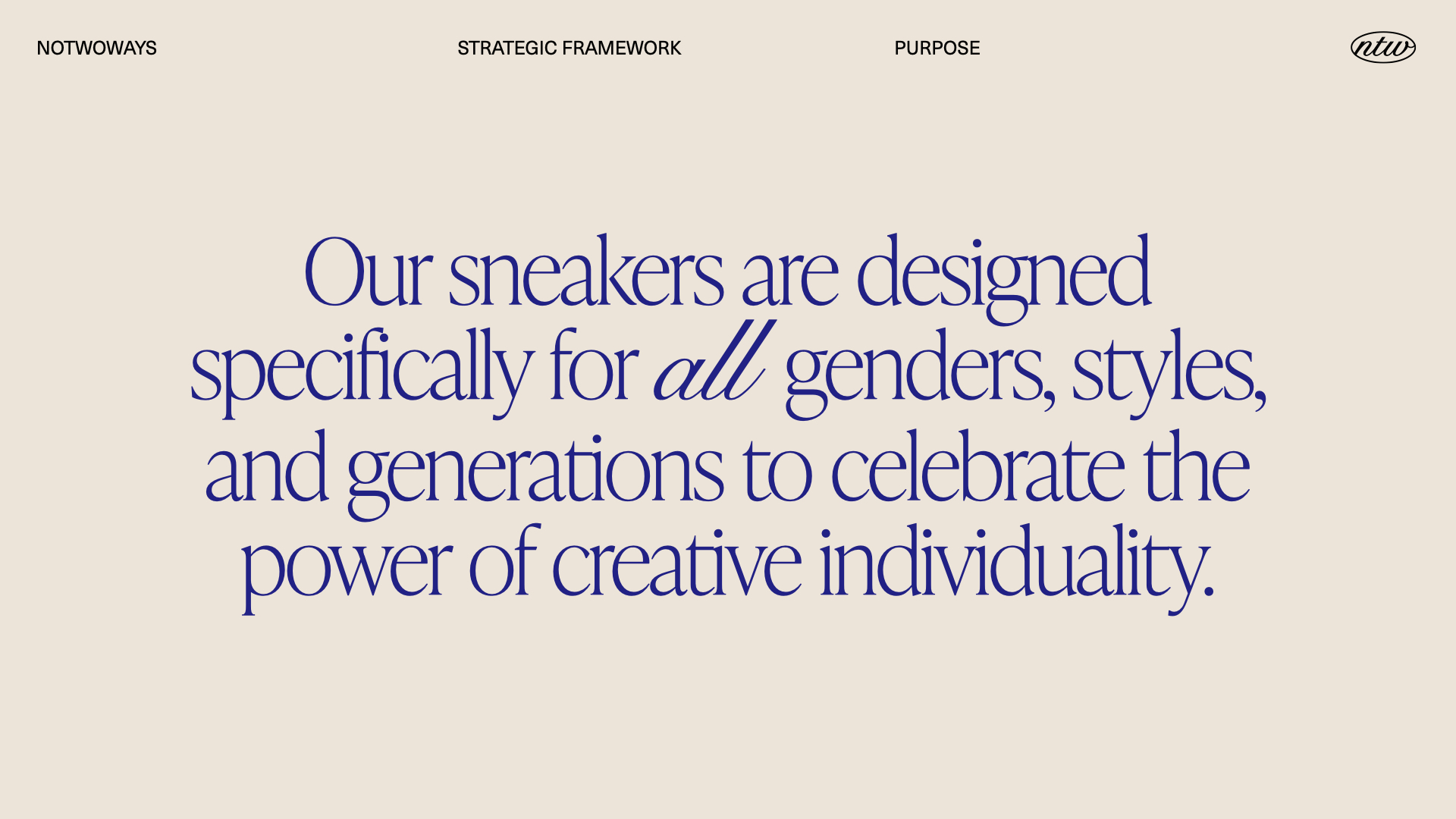 notwoways is a London-based sneaker brand that elevates the art of footwear design with all genders, styles, and backgrounds in mind. To better position them in the industry, I pinpointed a design target that is more inclusive of their female audience—focusing on the spending power of women in the world of sneakers and proposing a new visual identity to go with it.