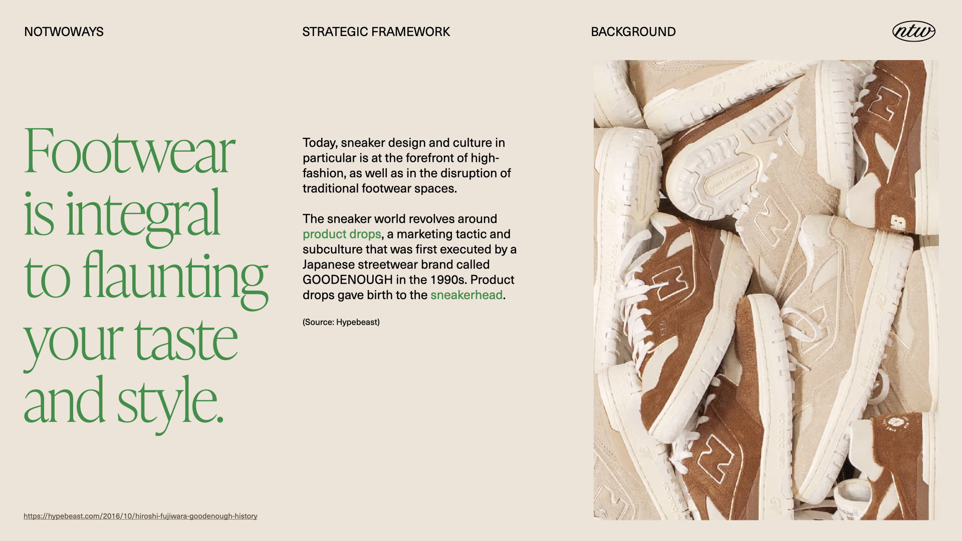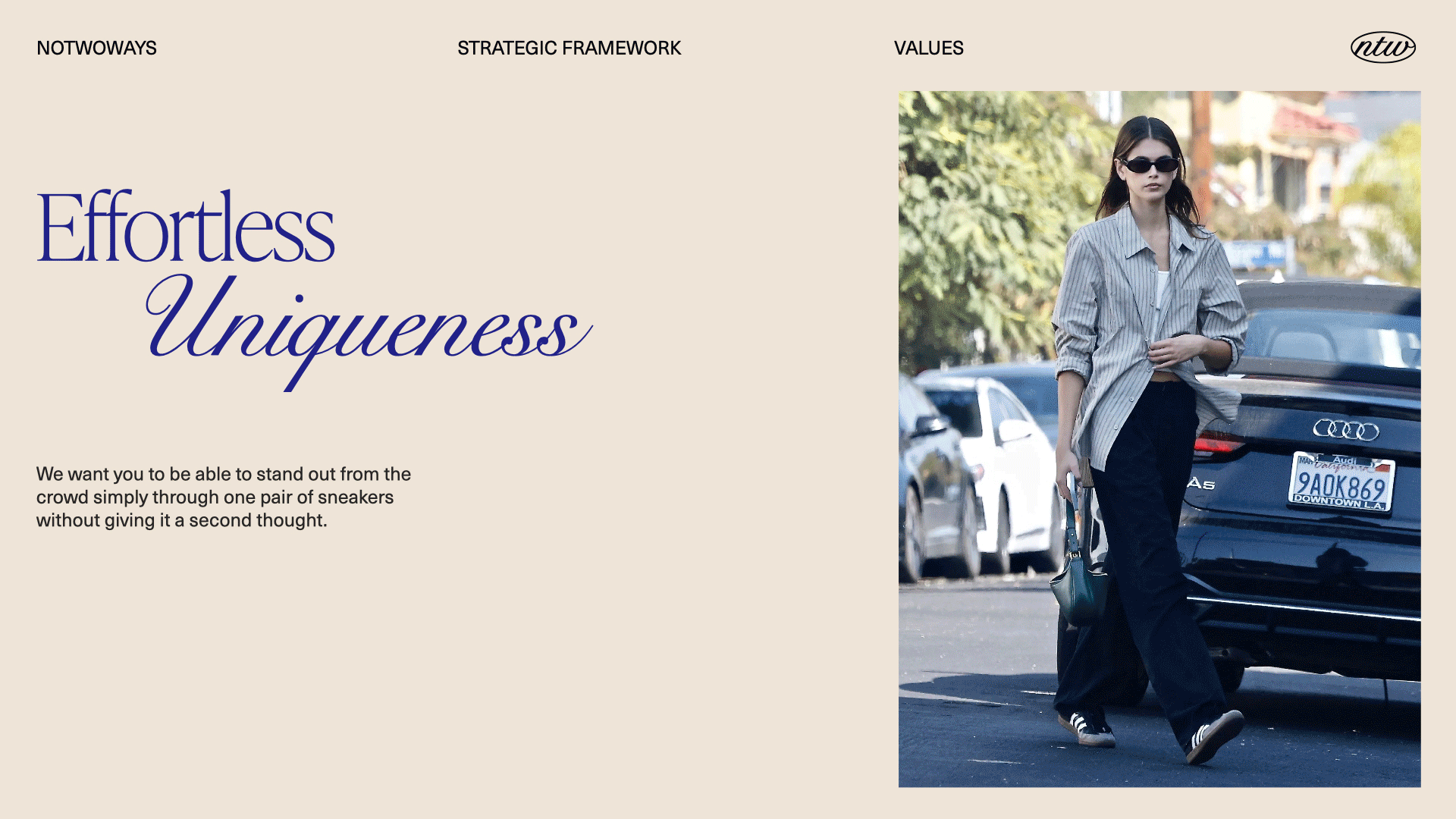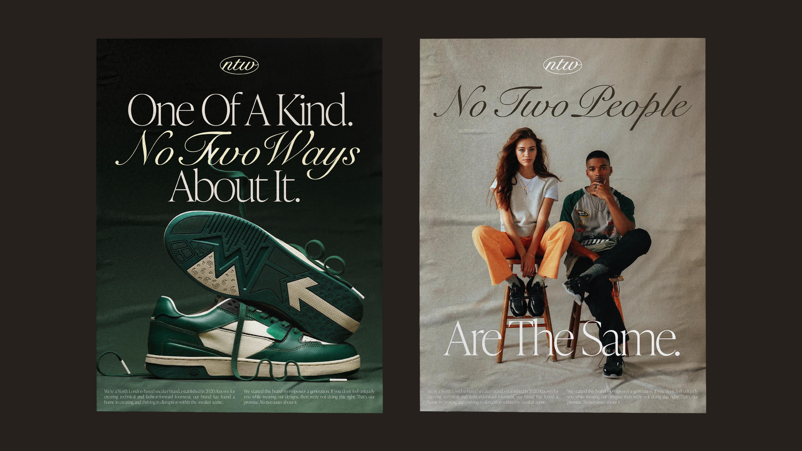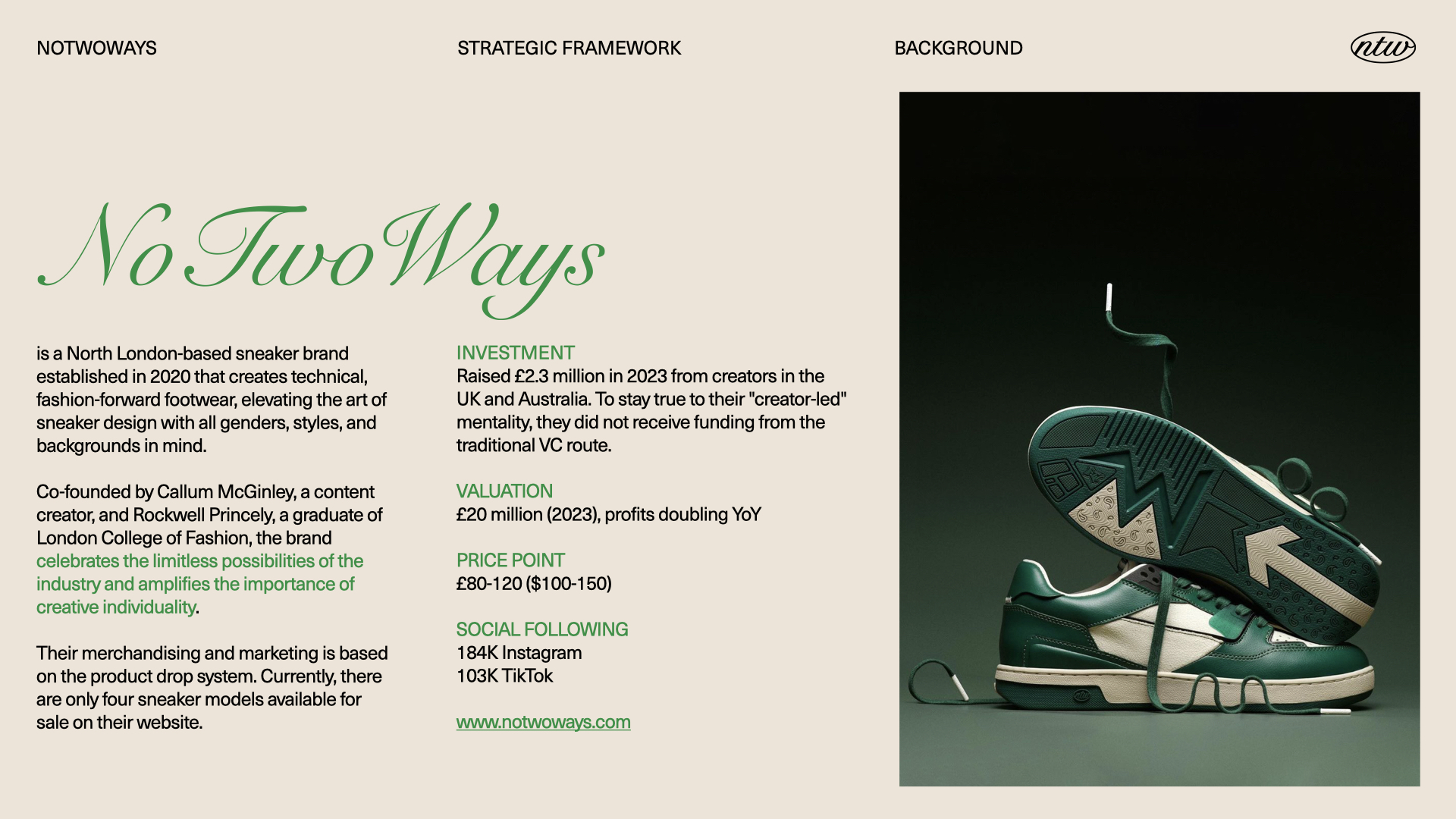 notwoways is a London-based sneaker brand that elevates the art of footwear design with all genders, styles, and backgrounds in mind. To better position them in the industry, I pinpointed a design target that is more inclusive of their female audience—focusing on the spending power of women in the world of sneakers and proposing a new visual identity to go with it.