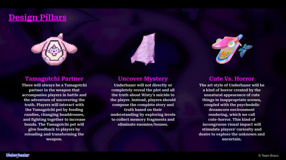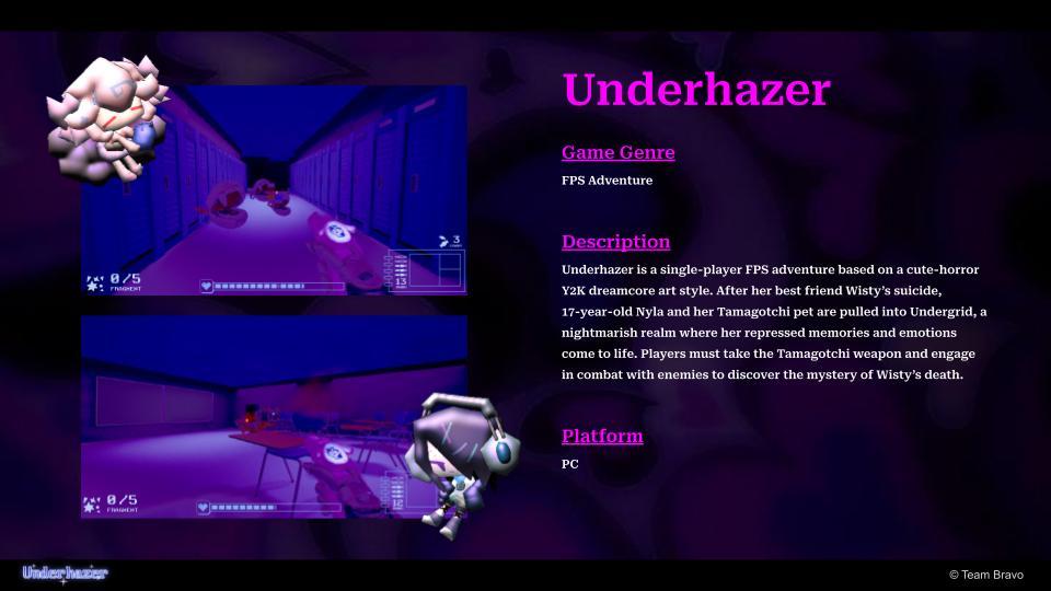 Underhazer is a single-player FPS adventure based on a cute-horror Y2K dreamcore art style. After her best friend Wisty's suicide, 17-year-old Nyla and her Tamagotchi pet are pulled into Undergrid, a nightmarish realm where her repressed memories and emotions come to life. Players must take the Tamagotchi weapon and engage in combat with enemies to discover the mystery of Wisty's death.