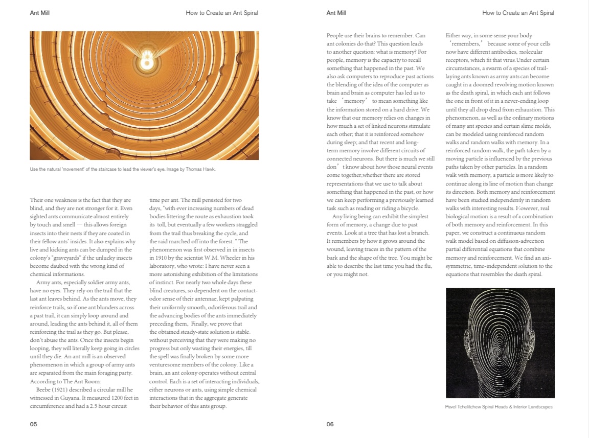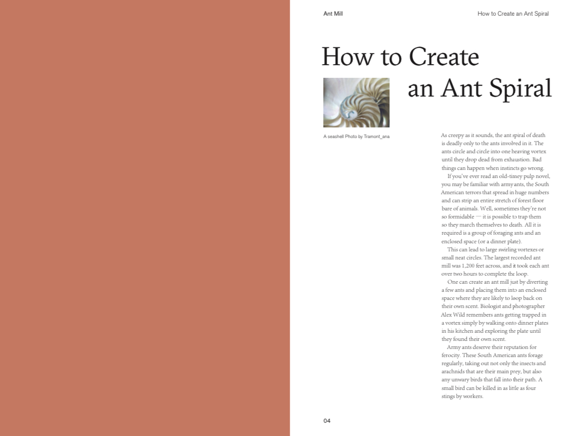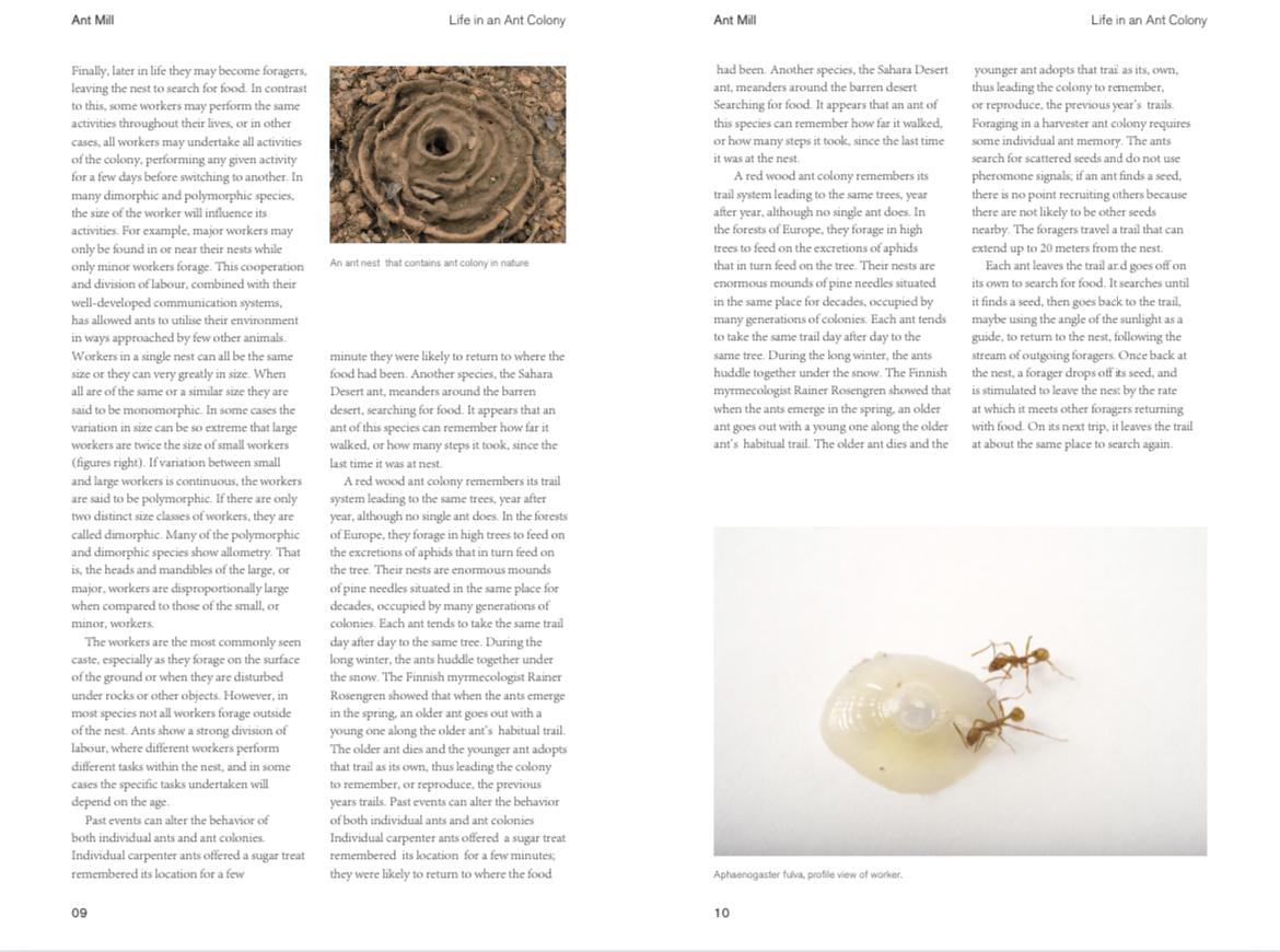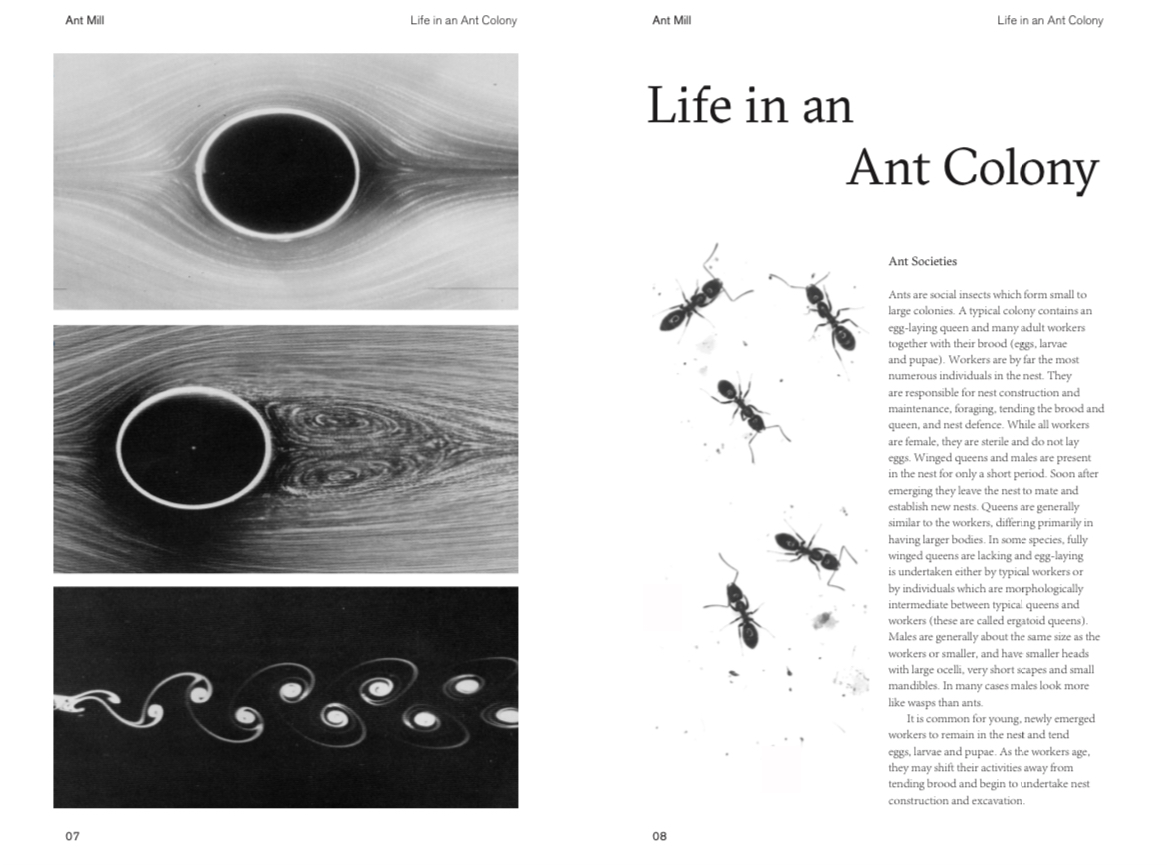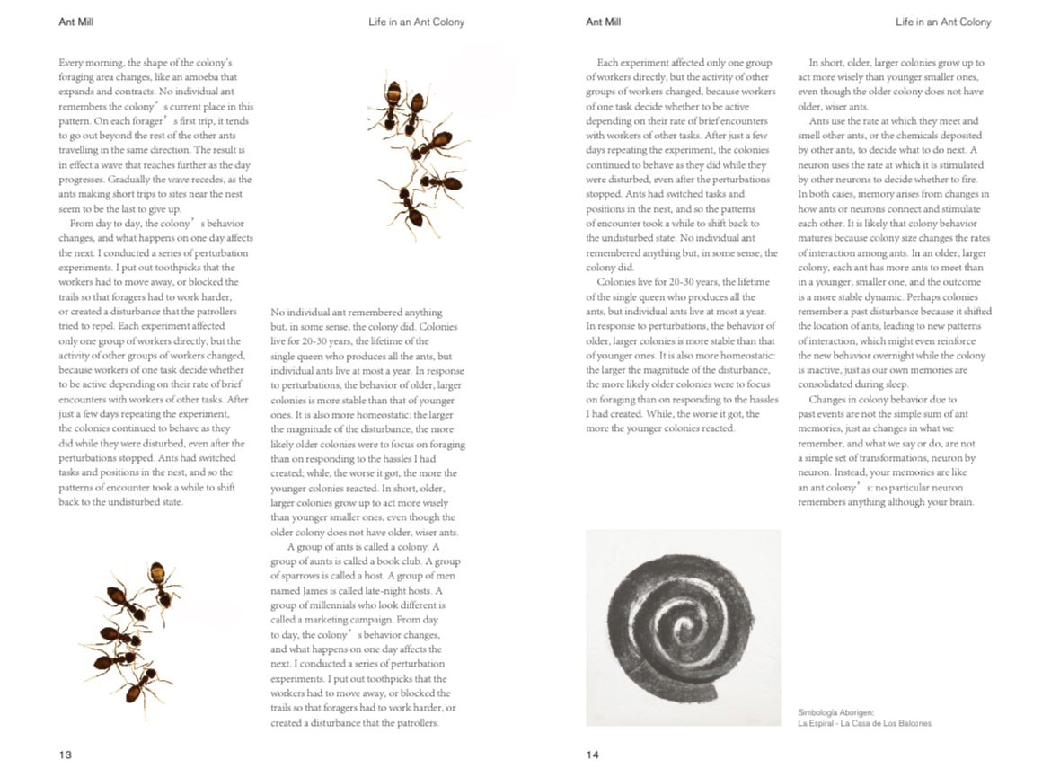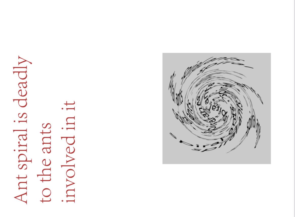 This zine triggers thinking through the theme of Ant mill, uses spiral as the visual theme, and explores some strange behaviors of creatures and abstract graphics of words.