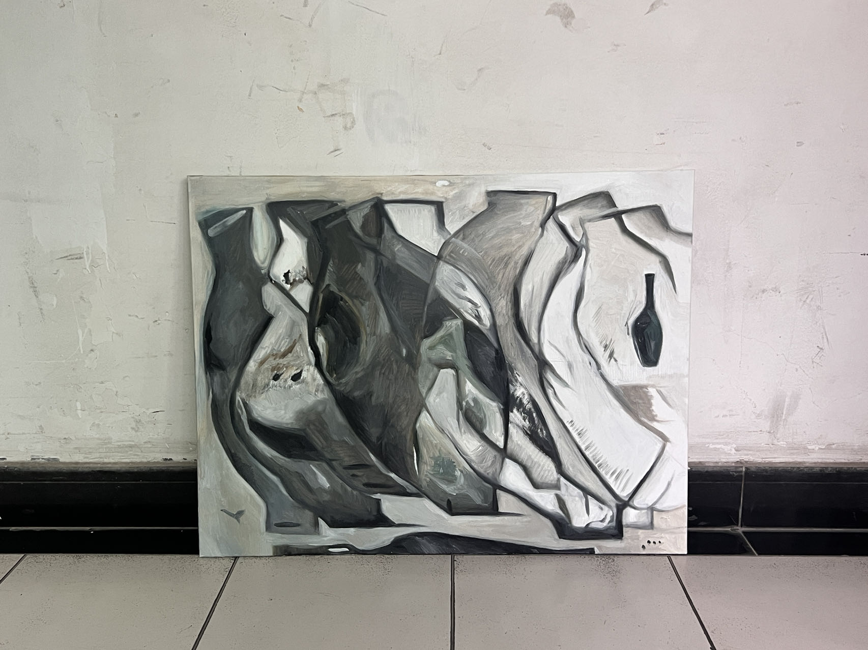 This portrait from the Liao series symbolizes how this person is like a vase in my heart, capable of containing everything. It reflects a shift in my emotions, from intense anger on the left to ease and acceptance on the right. Initially, I saw this person as a fragile child, represented by a flawed bottle, but later recognized their inherent wholeness, completing the bottle. The muted colors mirror my fluctuating state of mind, oscillating between pain and tranquility.