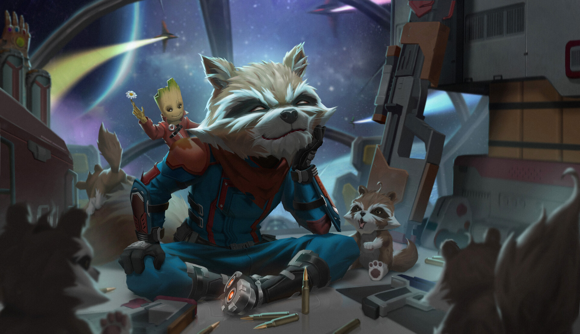 This is my first time drawing a non-human character. I want to draw an interesting illustration with a story. So I designed an interaction between Groot and the little raccoon, and then Rocket looked at them helplessly with some fun.