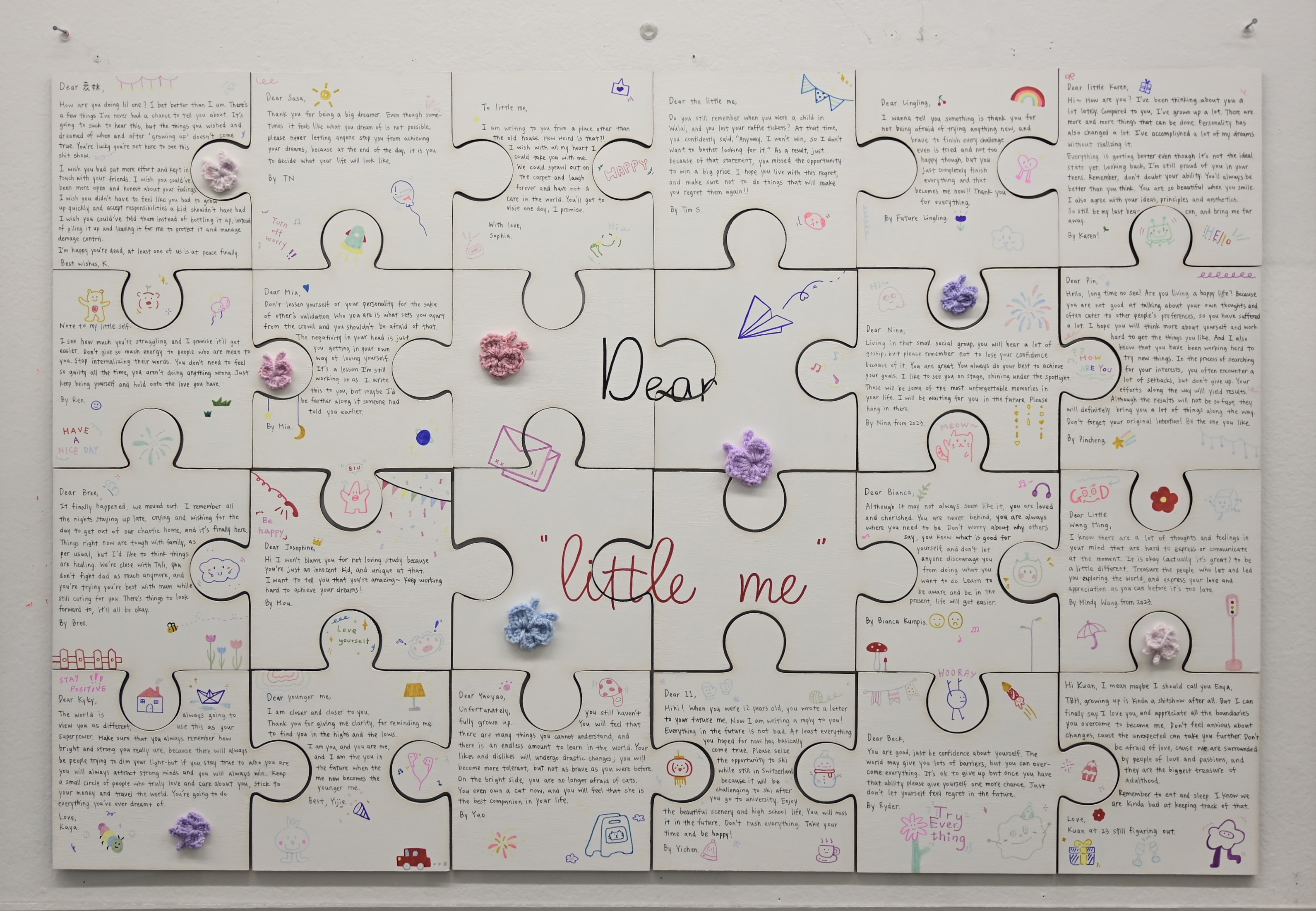 We often write essays in our childhood with the theme “A Letter to Our Future Selves.” But why doesn't anyone encourage us to write to our younger selves as we grow up? In our lifetime, we may have many regrets, some of which may be impossible to remedy fully. I invited 20 participants, including myself, to write a letter to their younger selves. I also added some illustrations, and crocheted butterflies to each puzzle piece because they represent transformation.