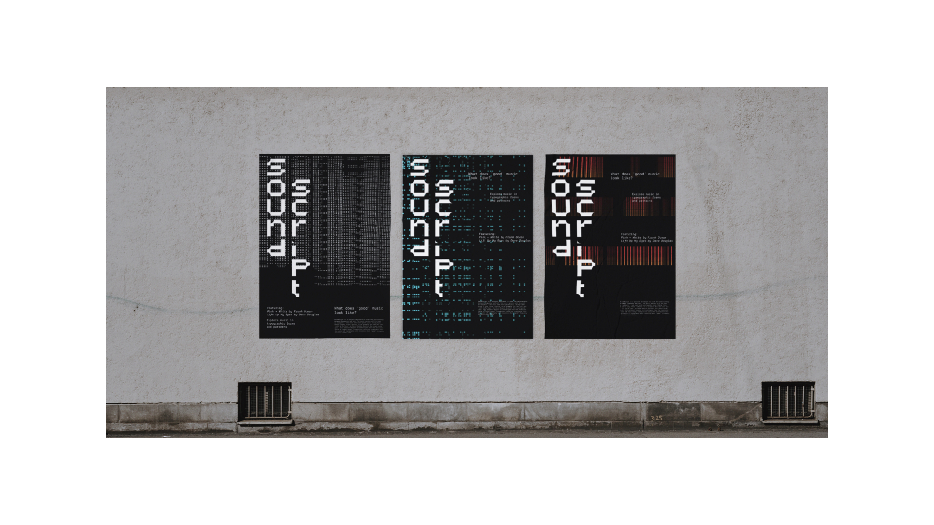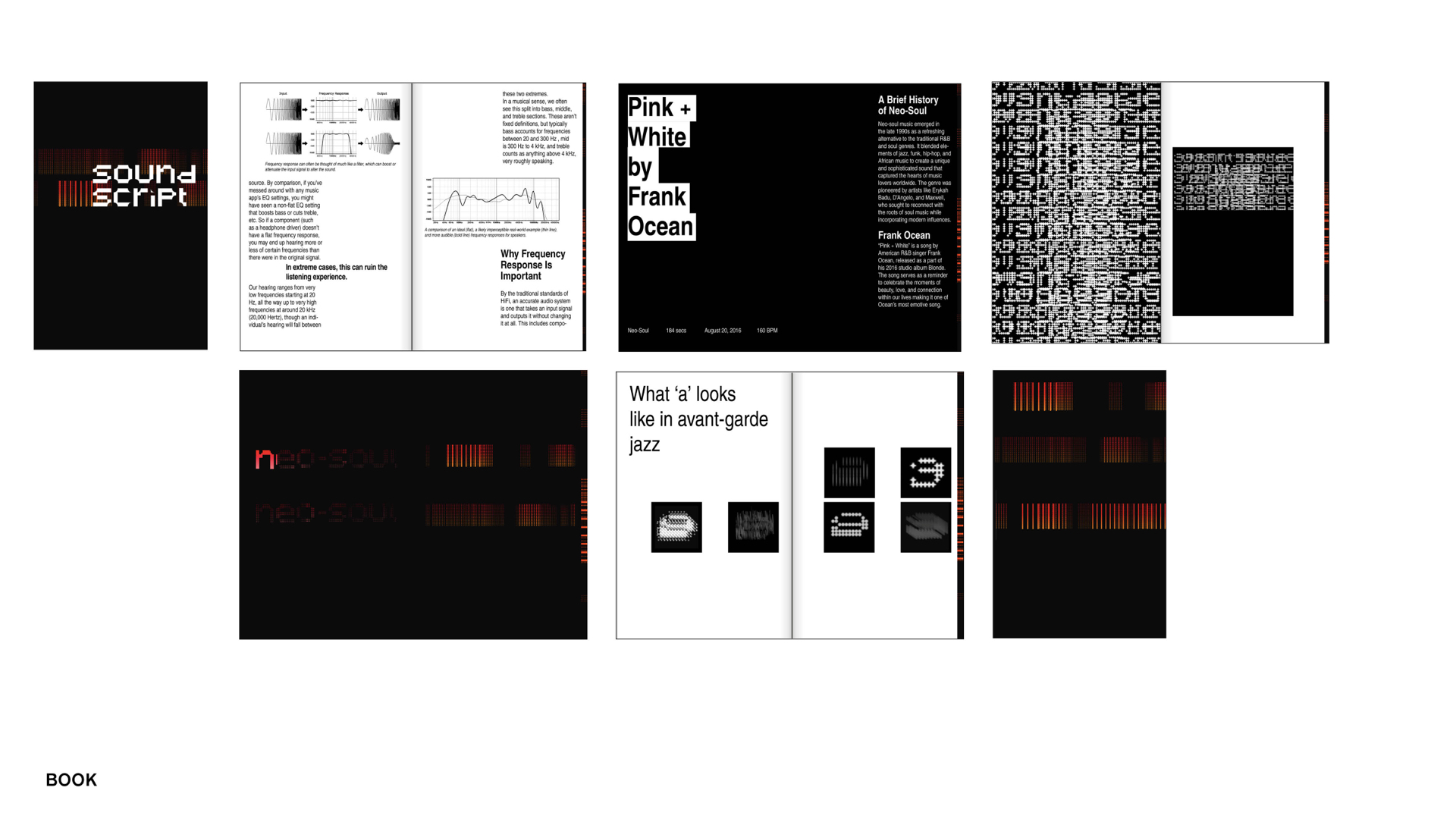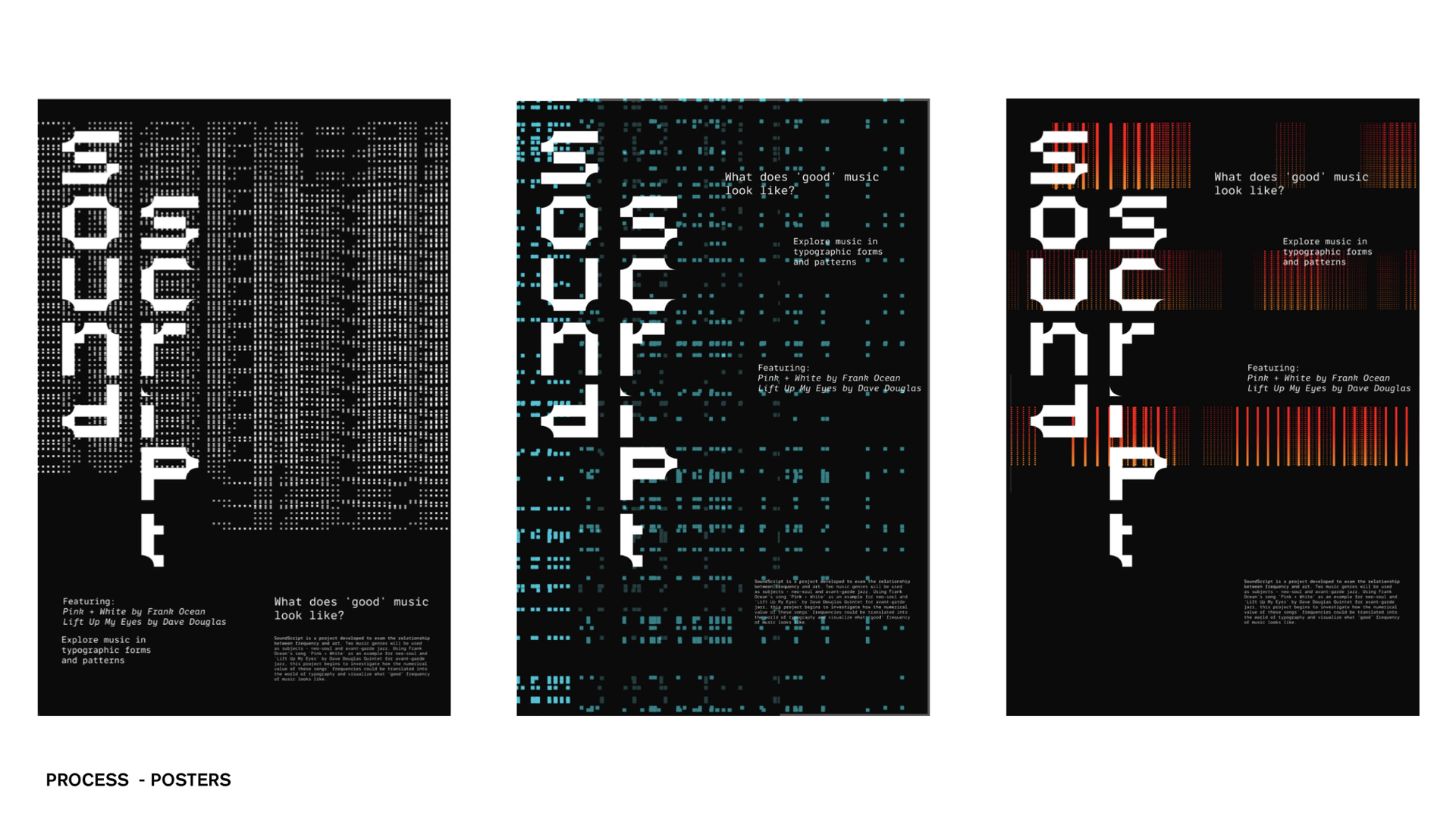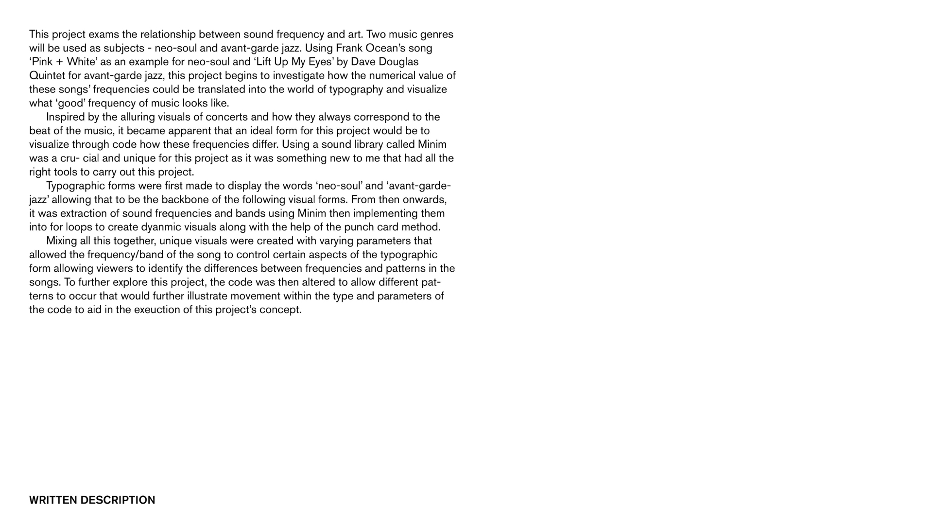 This project exams the relationship between sound frequency and art. Two music genres will be used as subjects - neo-soul and avant-garde jazz. Using Frank Ocean’s song ‘Pink + White’ as an example for neo-soul and ‘Lift Up My Eyes’ by Dave Douglas Quintet for avant-garde jazz, this project begins to investigate how the numerical value of these songs’ frequencies could be translated into the world of typography and visualize what ‘good’ frequency of music looks like.