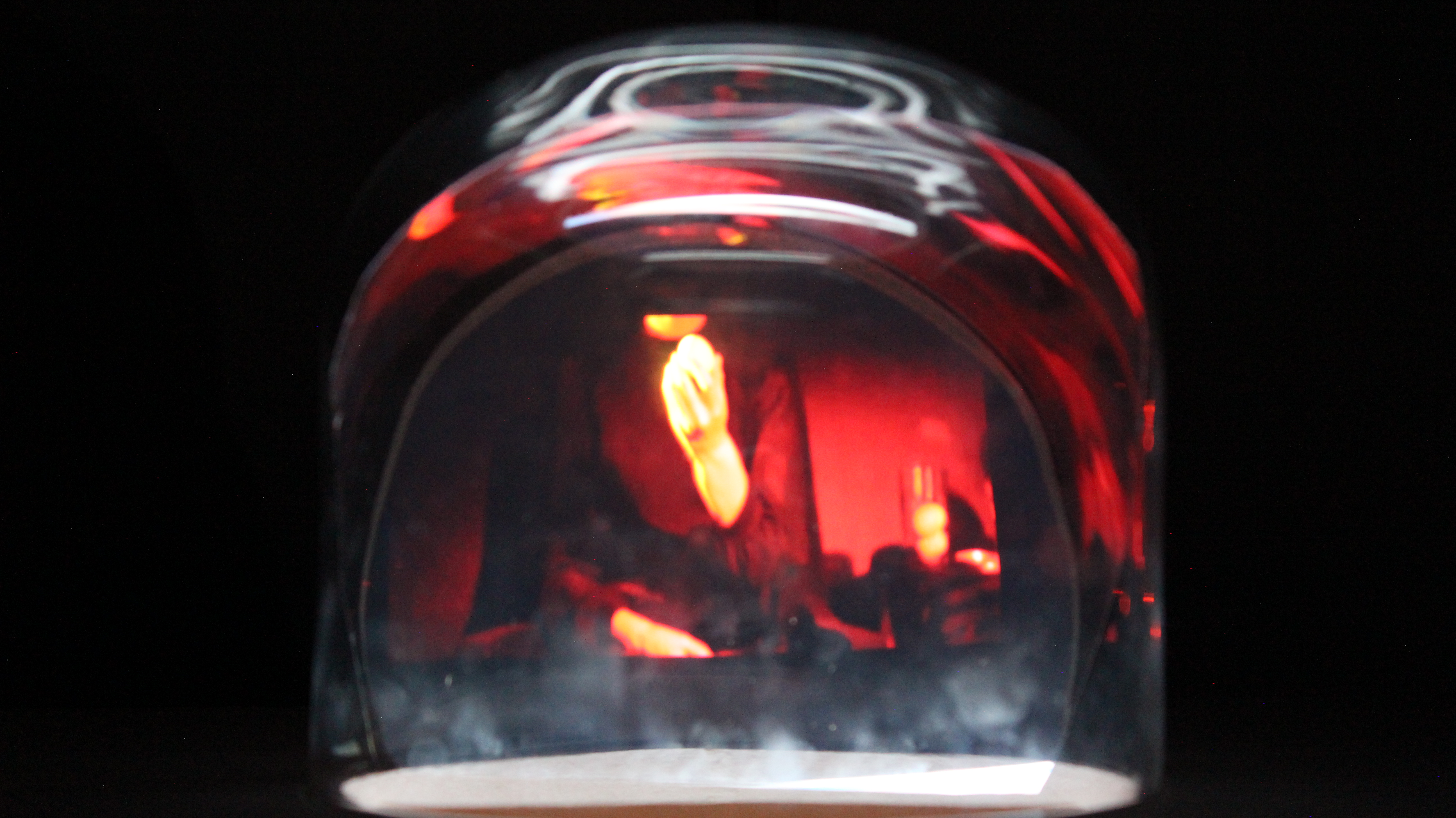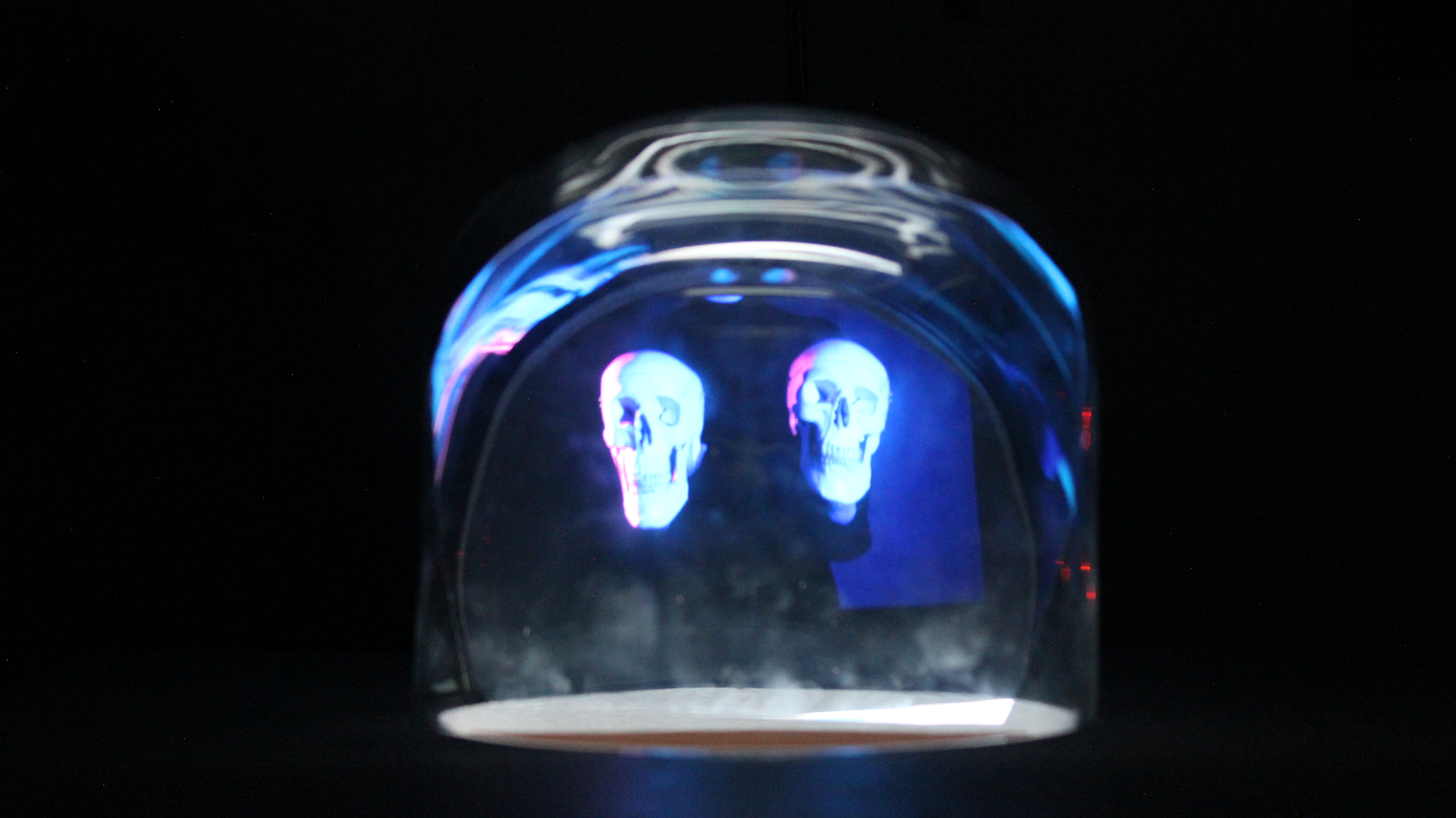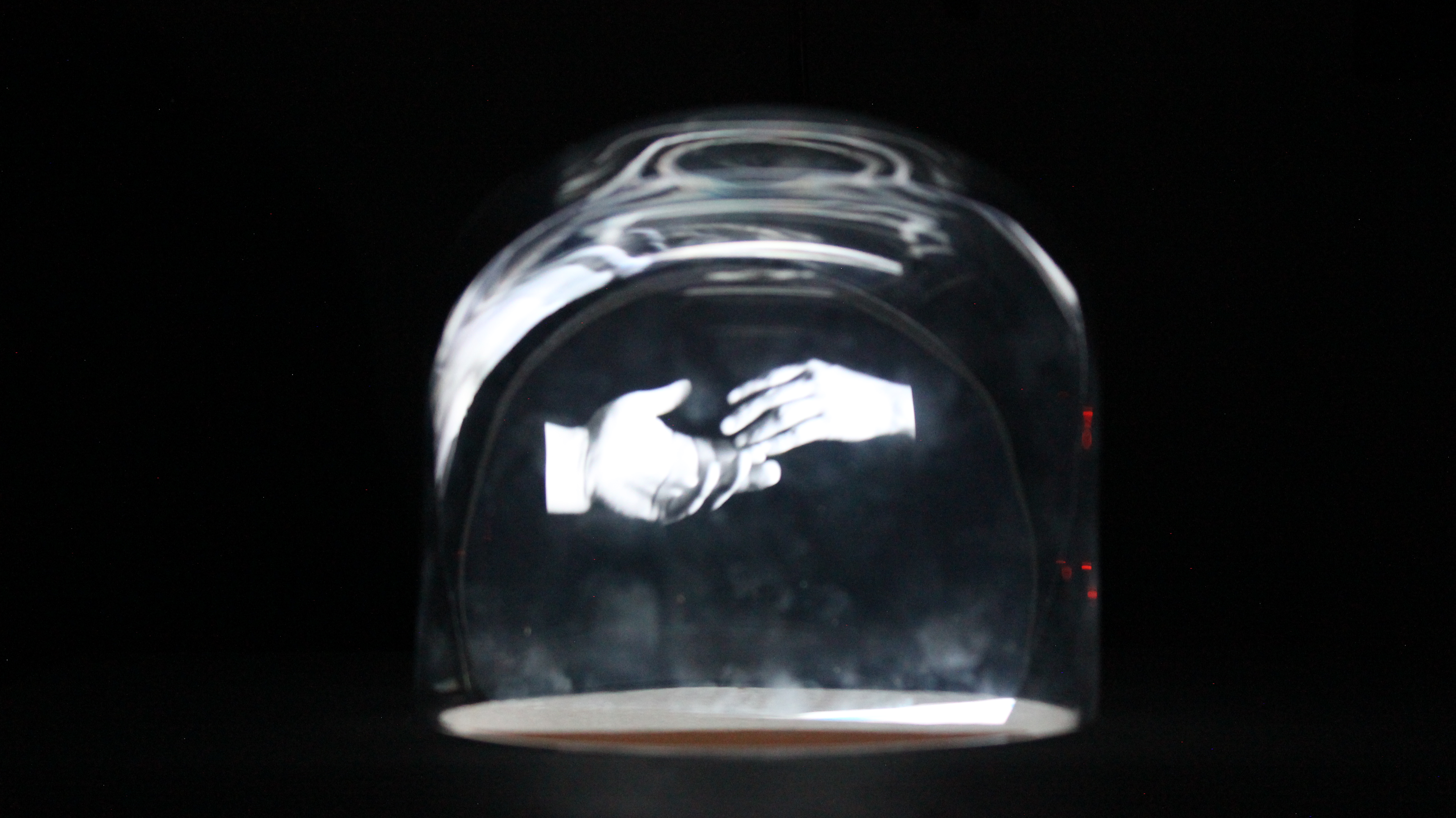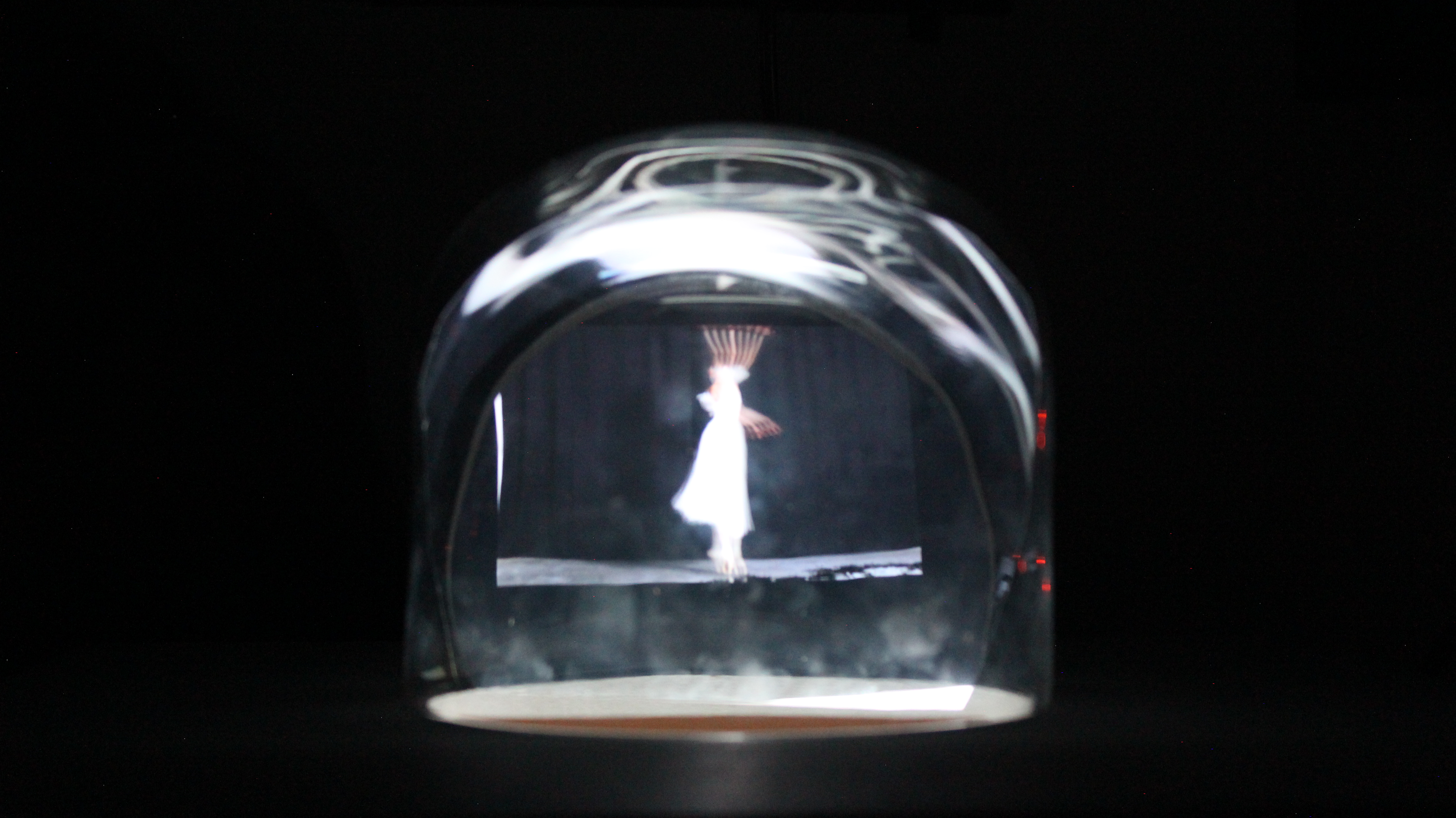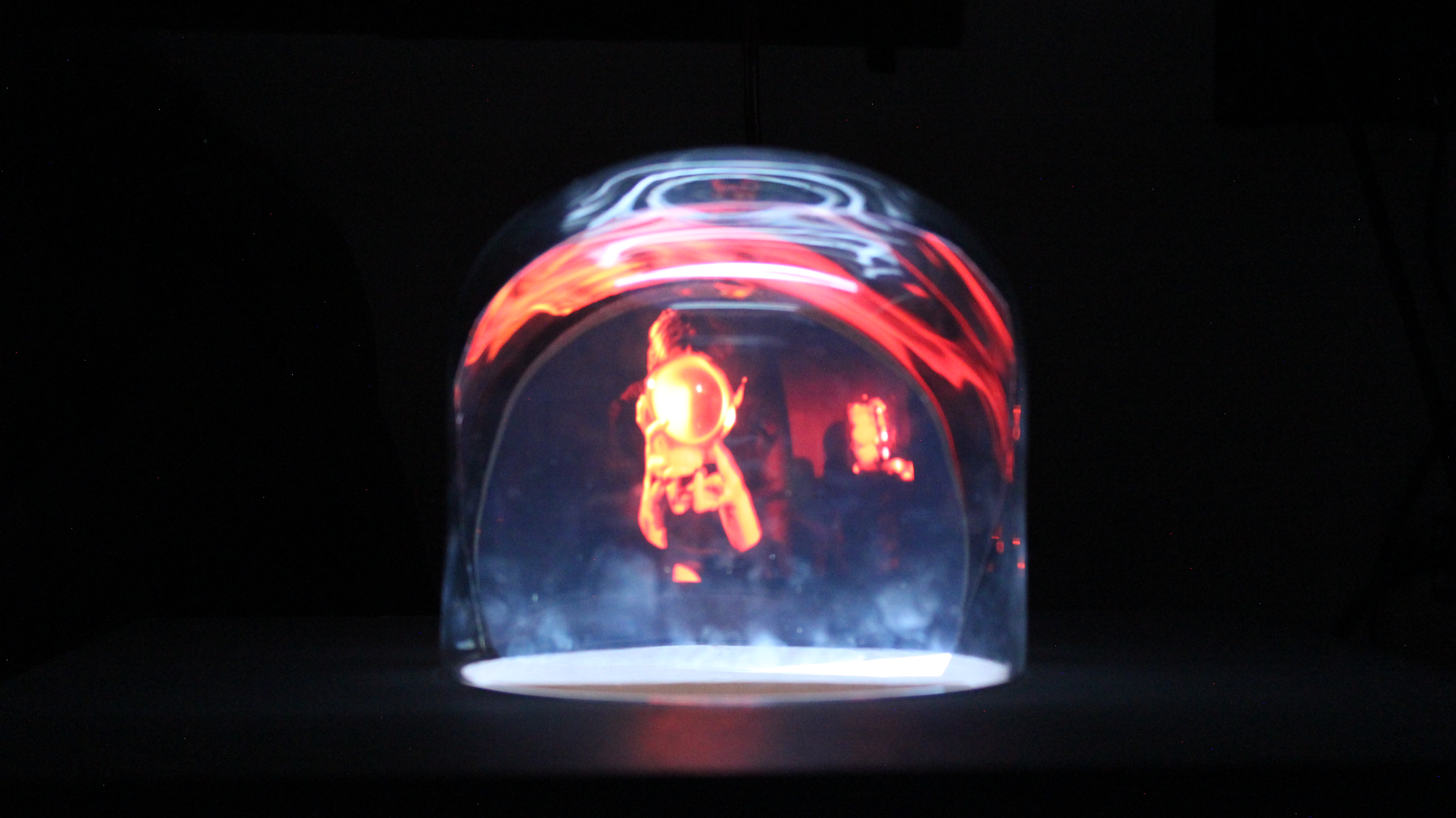 I used the poem to create a poetic narrative, a poetic cohesion to the framework of the video. To me, this results in a physical capture of a dream, of a premonition, of a vision, captured and encased in a bell jar. Hologram in bell jar. Dimensions 5" x 5" Duration: 8 min.
