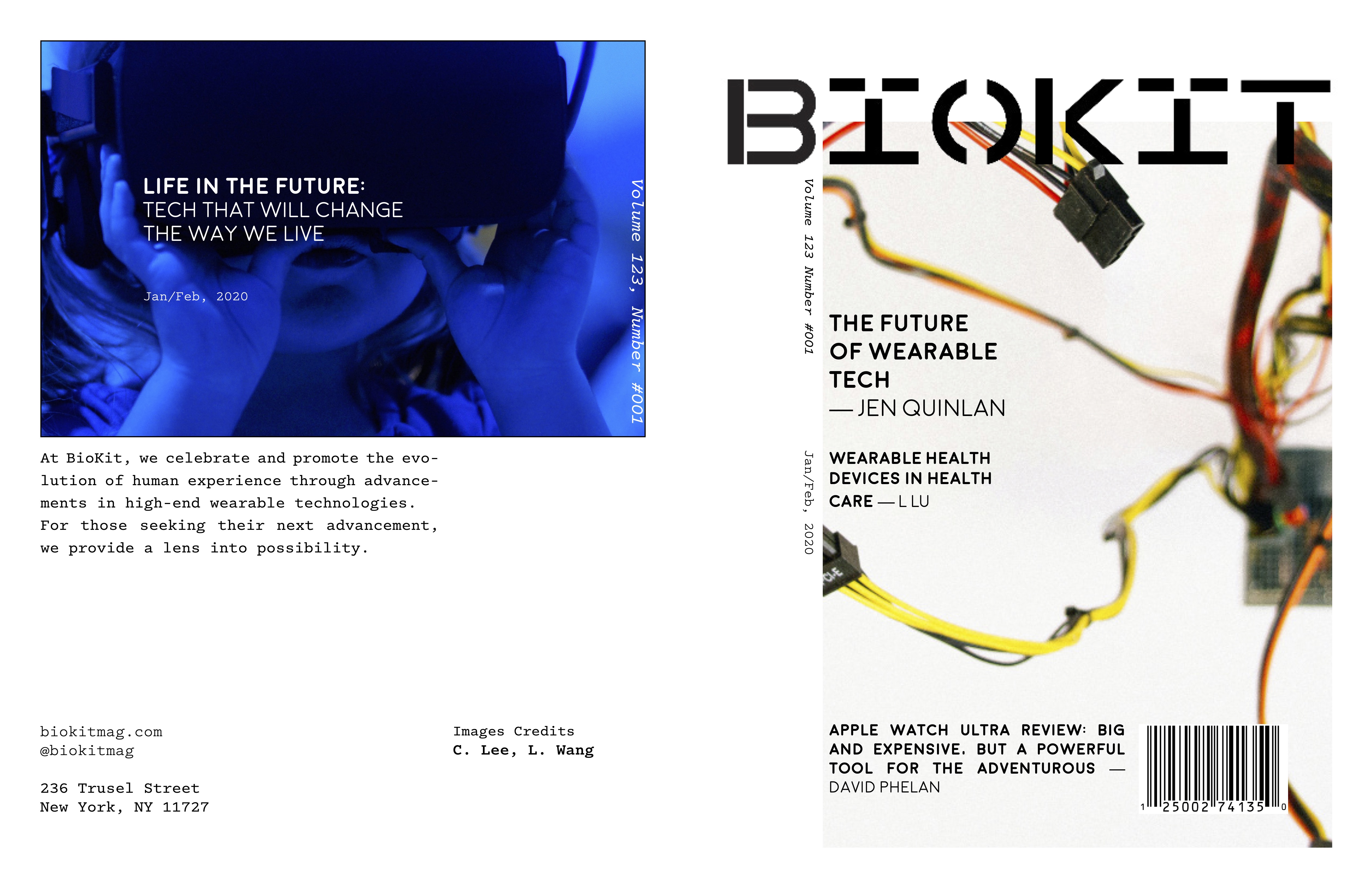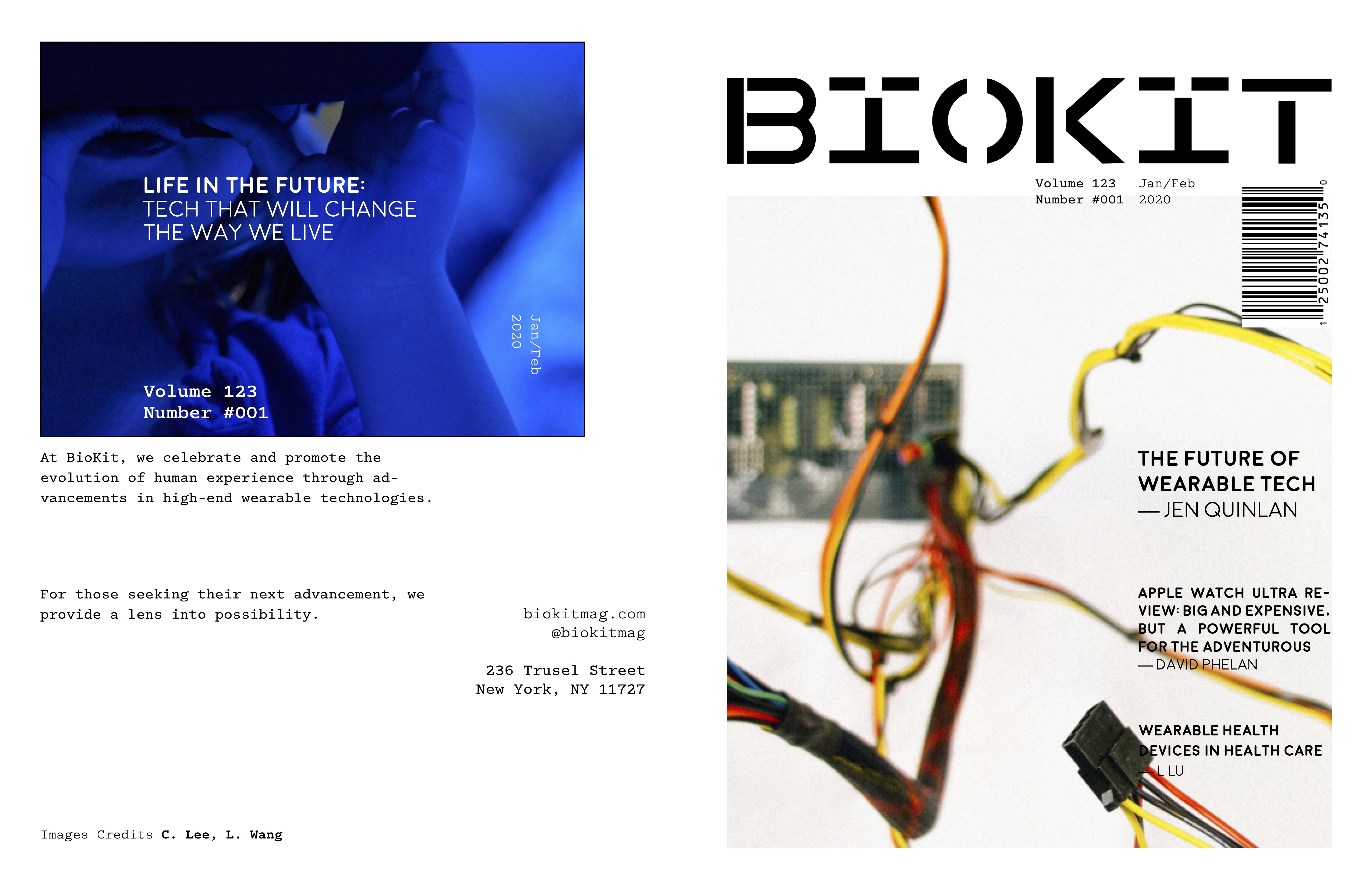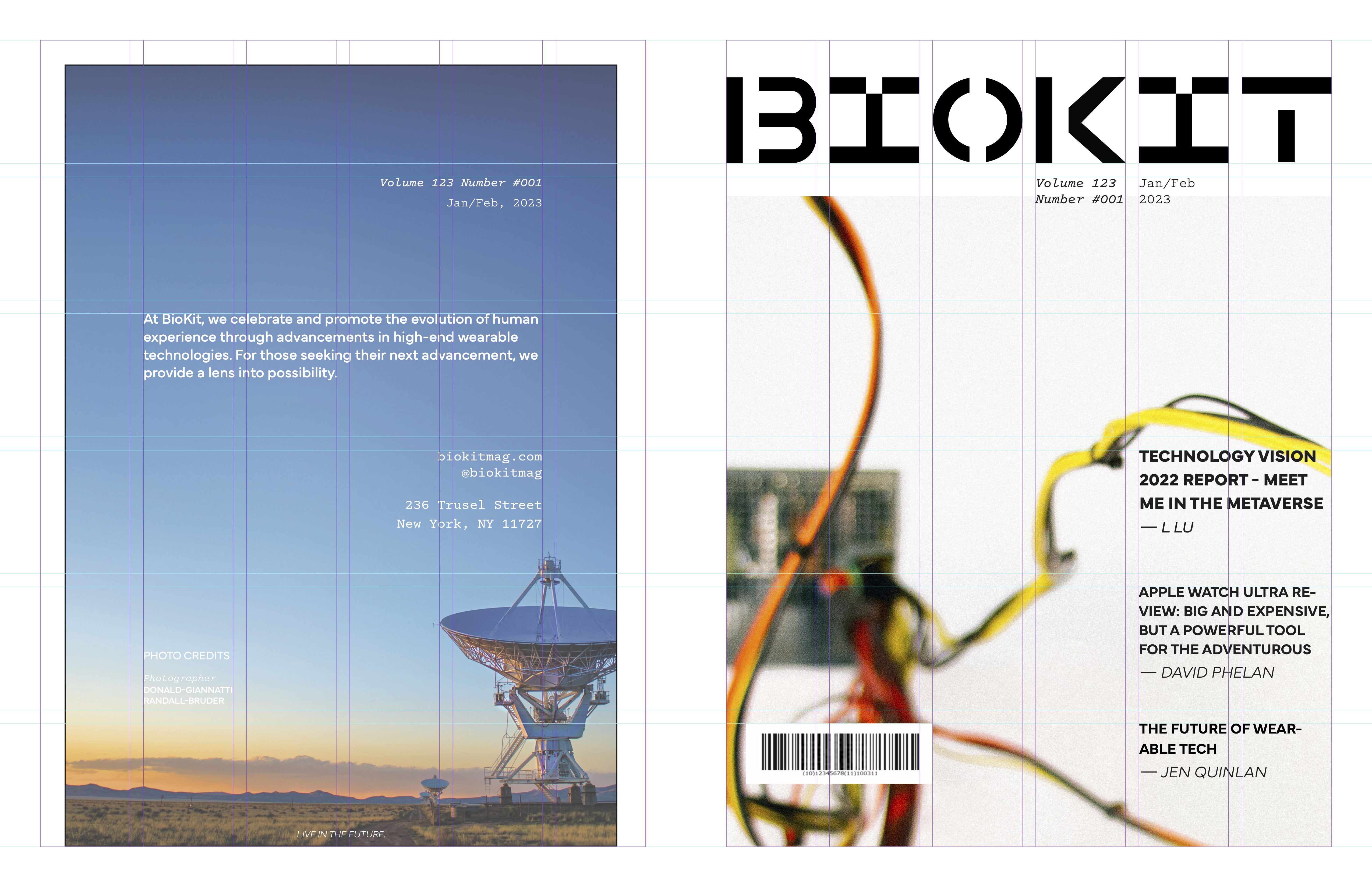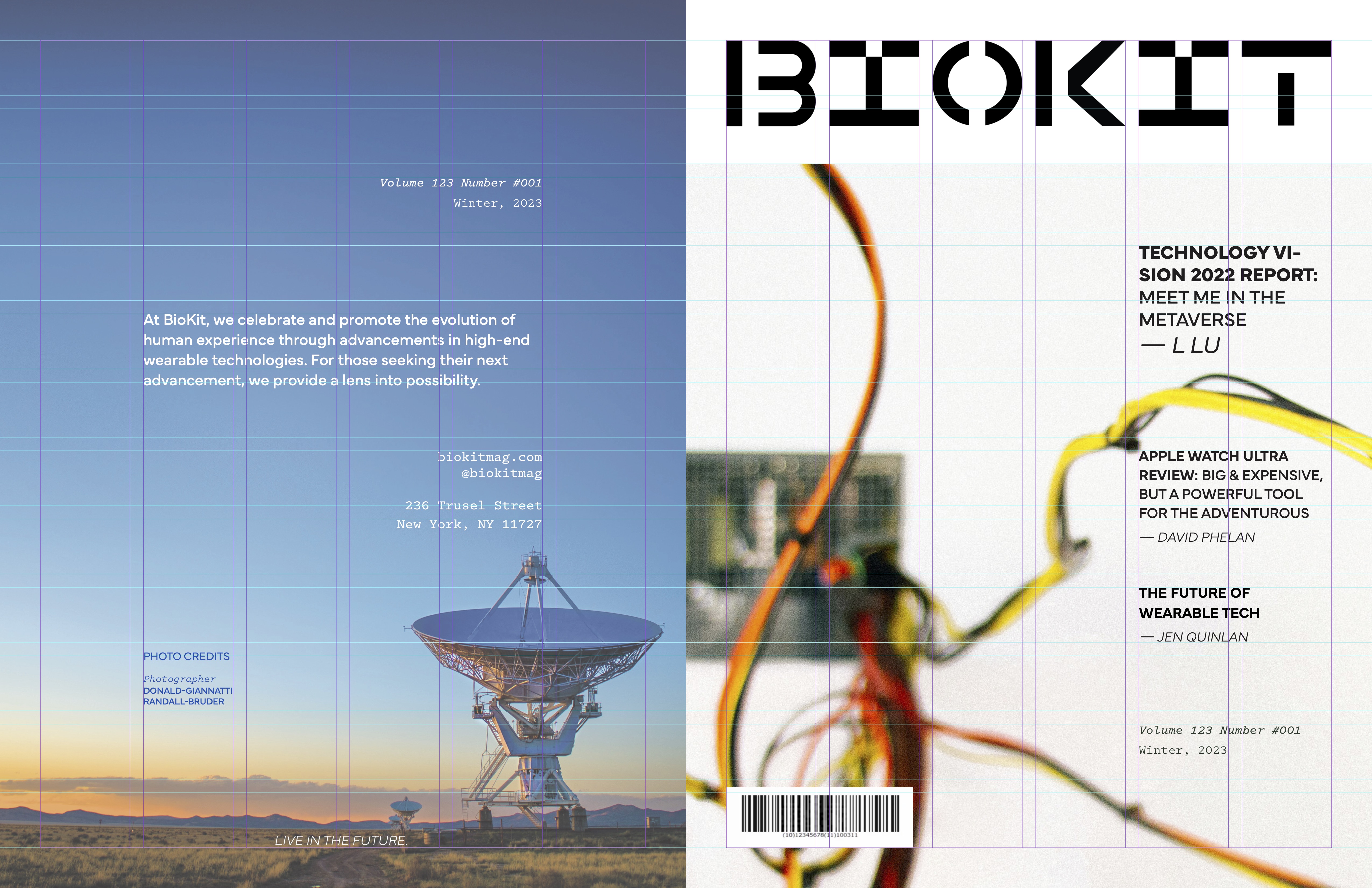 With Matt Sahlit's guidance, I use Adobe InDesign to design a magazine from its Masthead, Front & Back Cover, and Spread for a client "BIOKIT", a high-end, evolutionary, technological company.