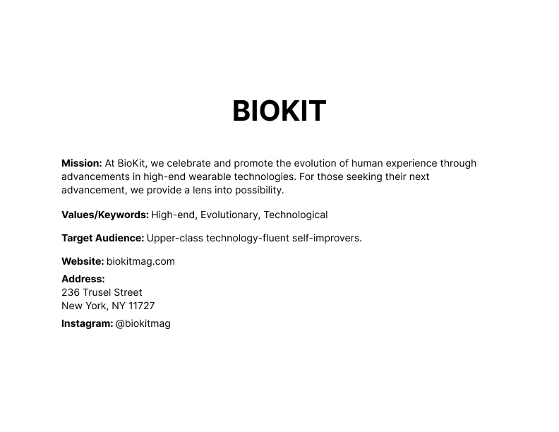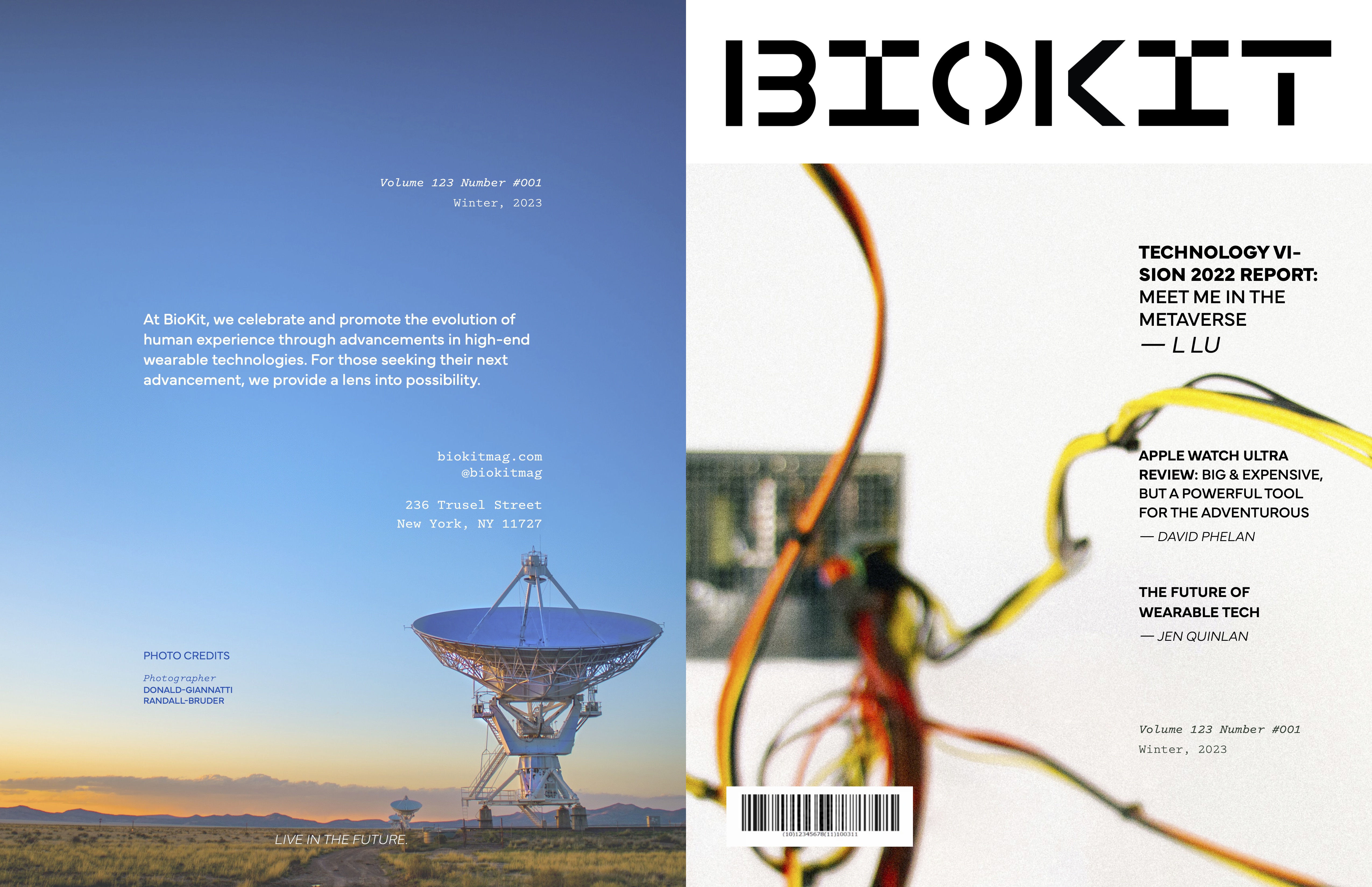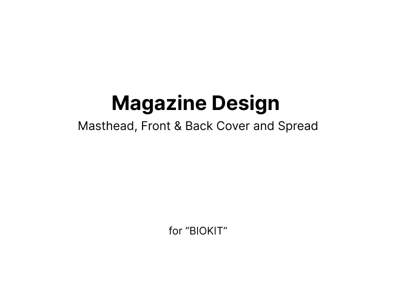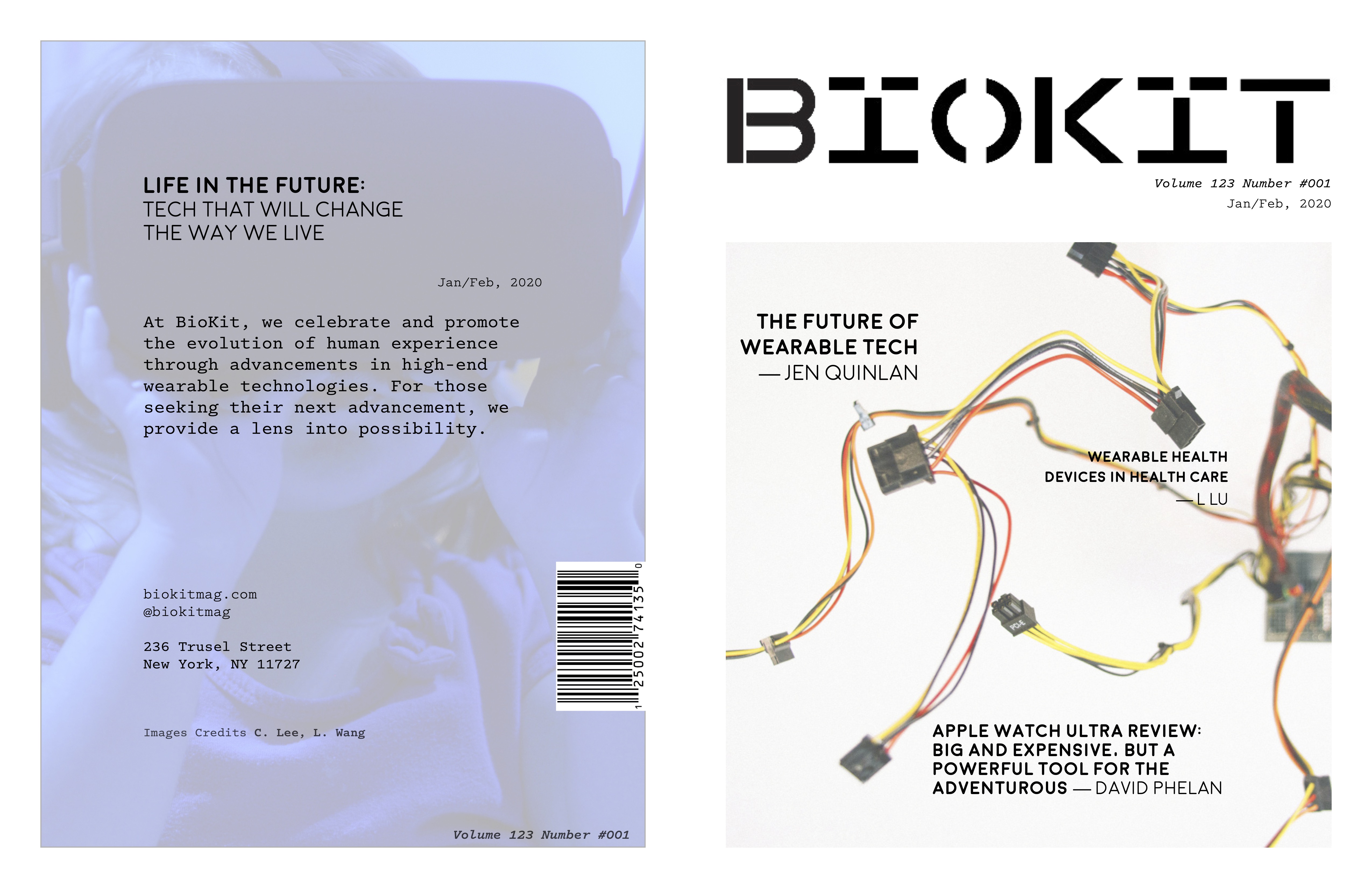 With Matt Sahlit's guidance, I use Adobe InDesign to design a magazine from its Masthead, Front & Back Cover, and Spread for a client "BIOKIT", a high-end, evolutionary, technological company.