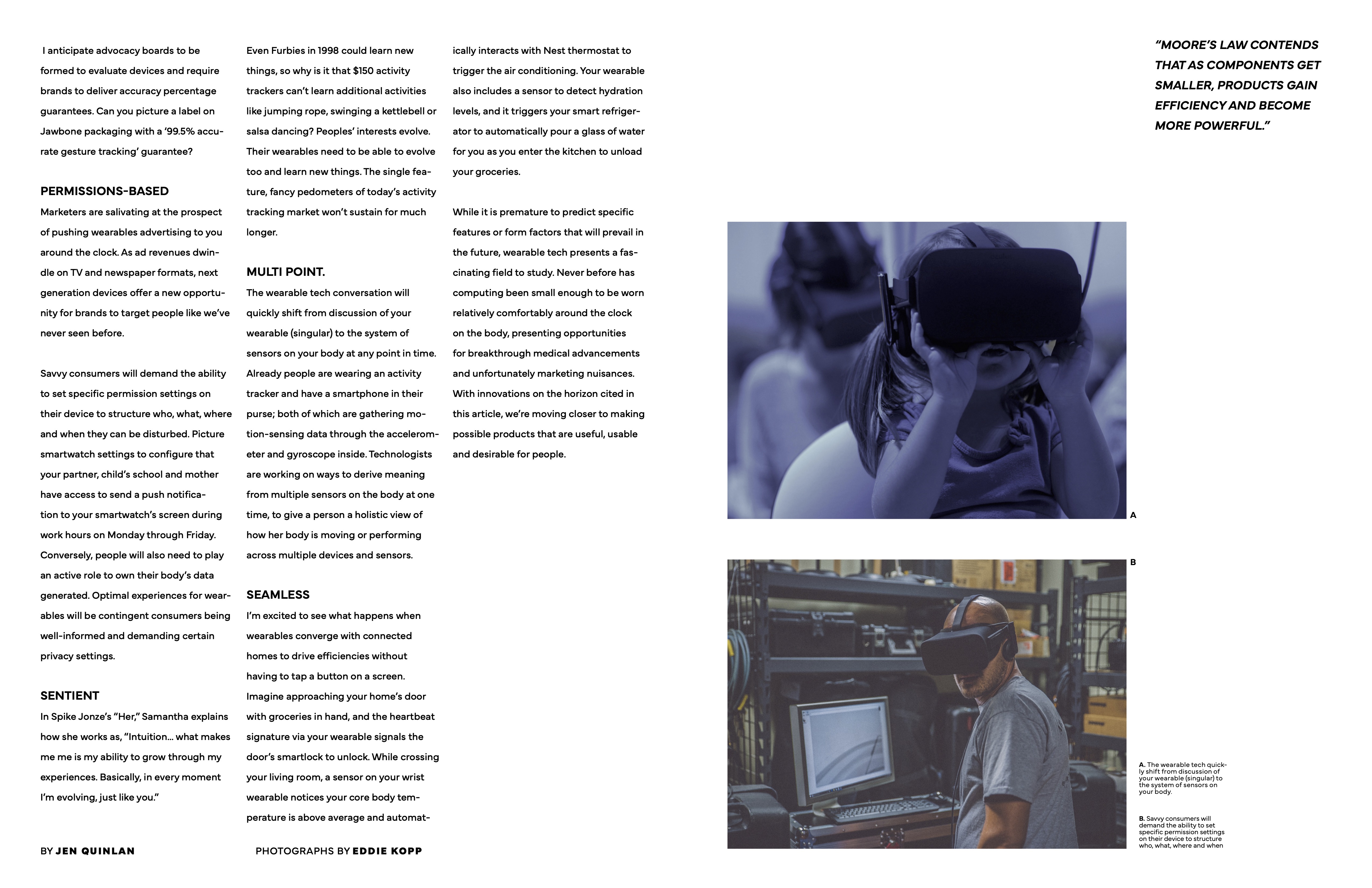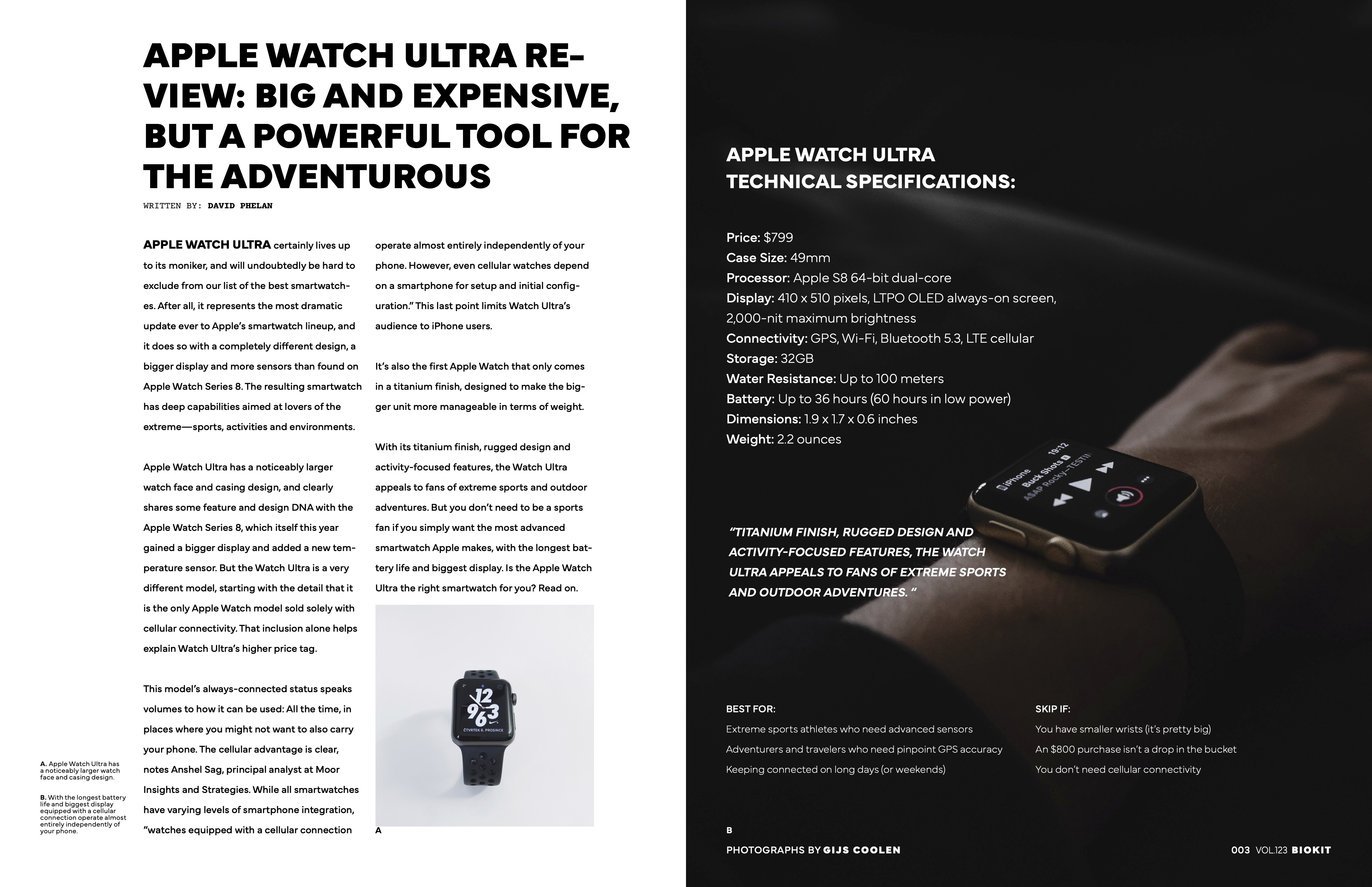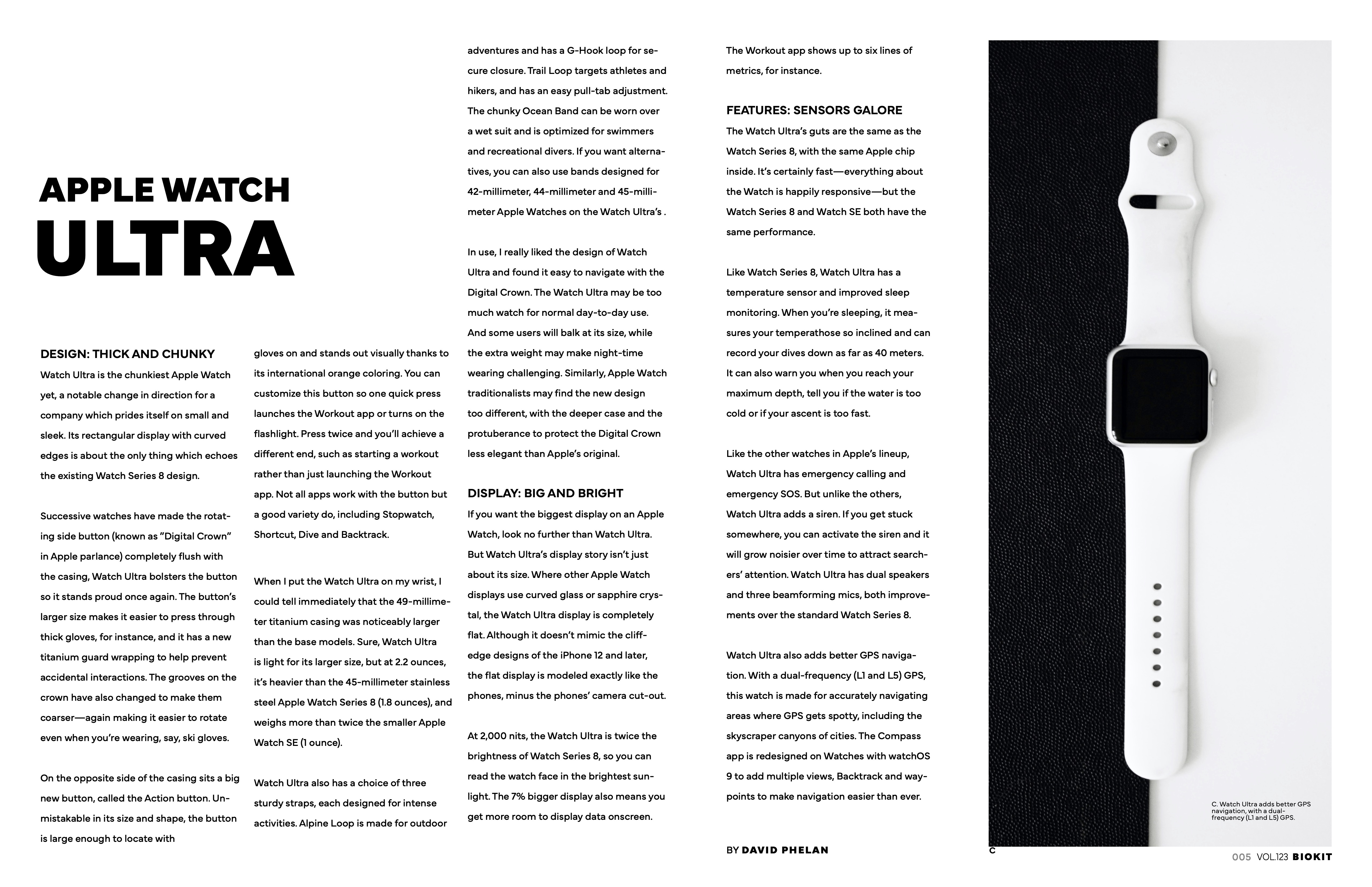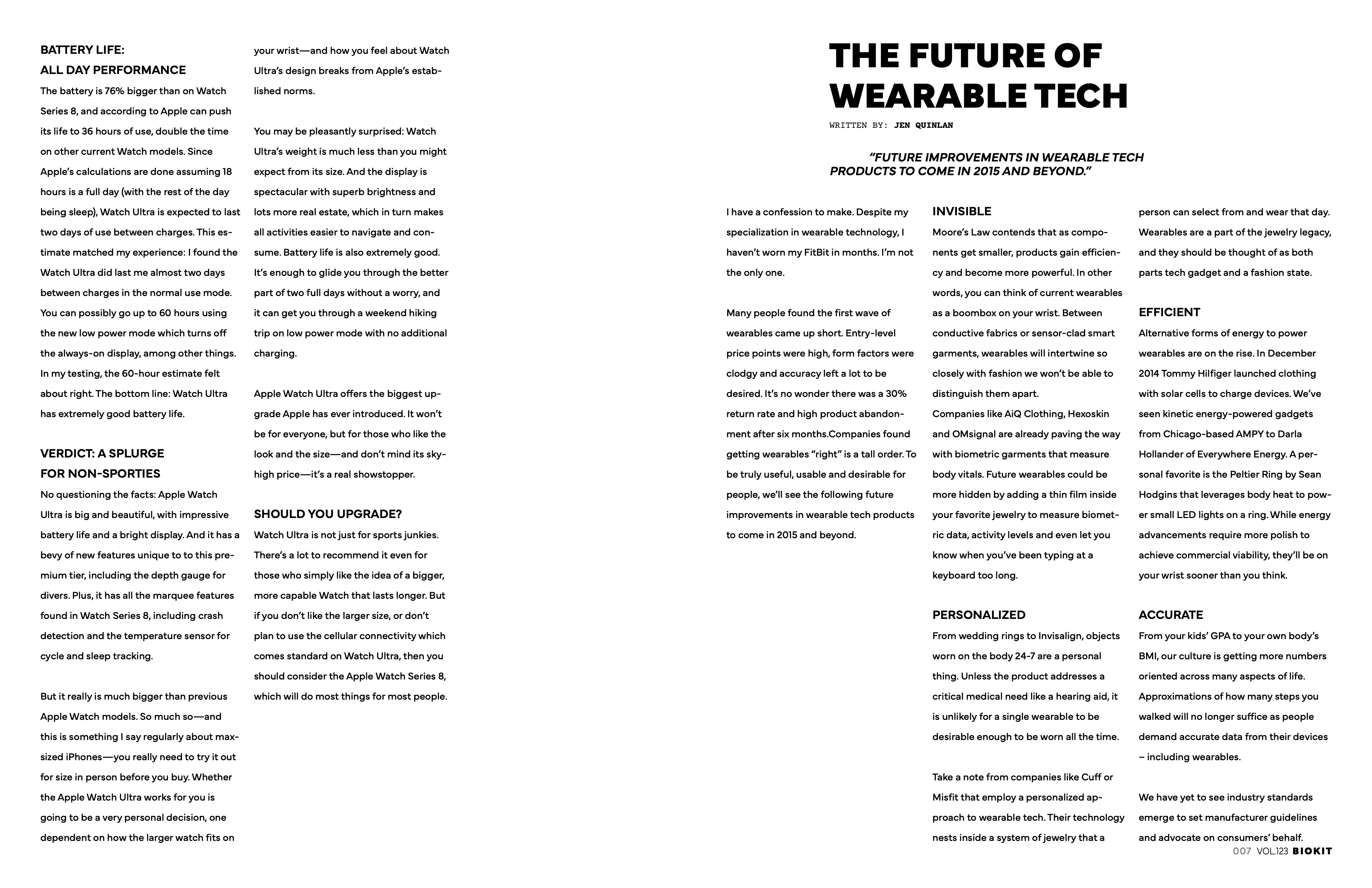 With Matt Sahlit's guidance, I use Adobe InDesign to design a magazine from its Masthead, Front & Back Cover, and Spread for a client "BIOKIT", a high-end, evolutionary, technological company.