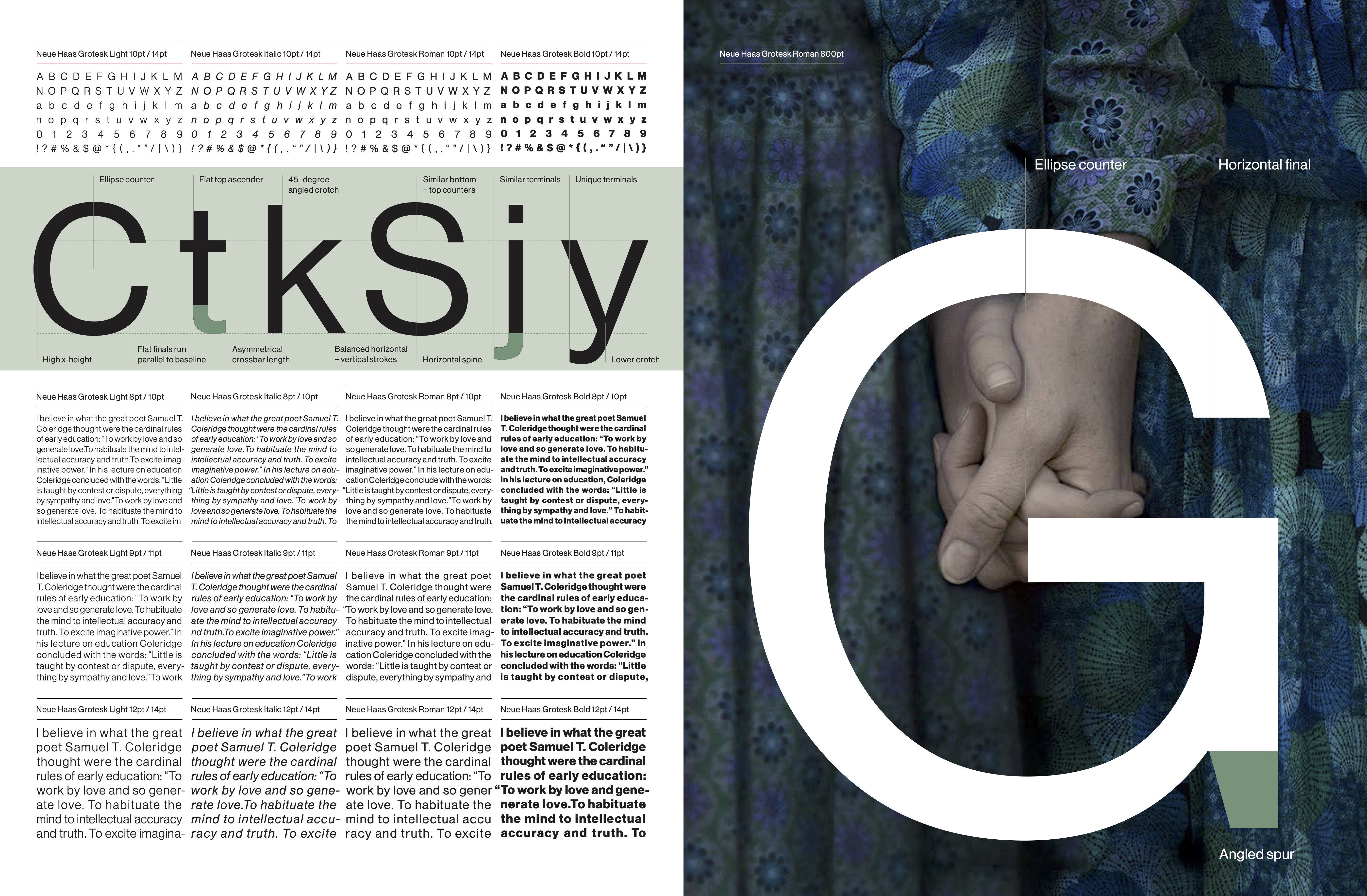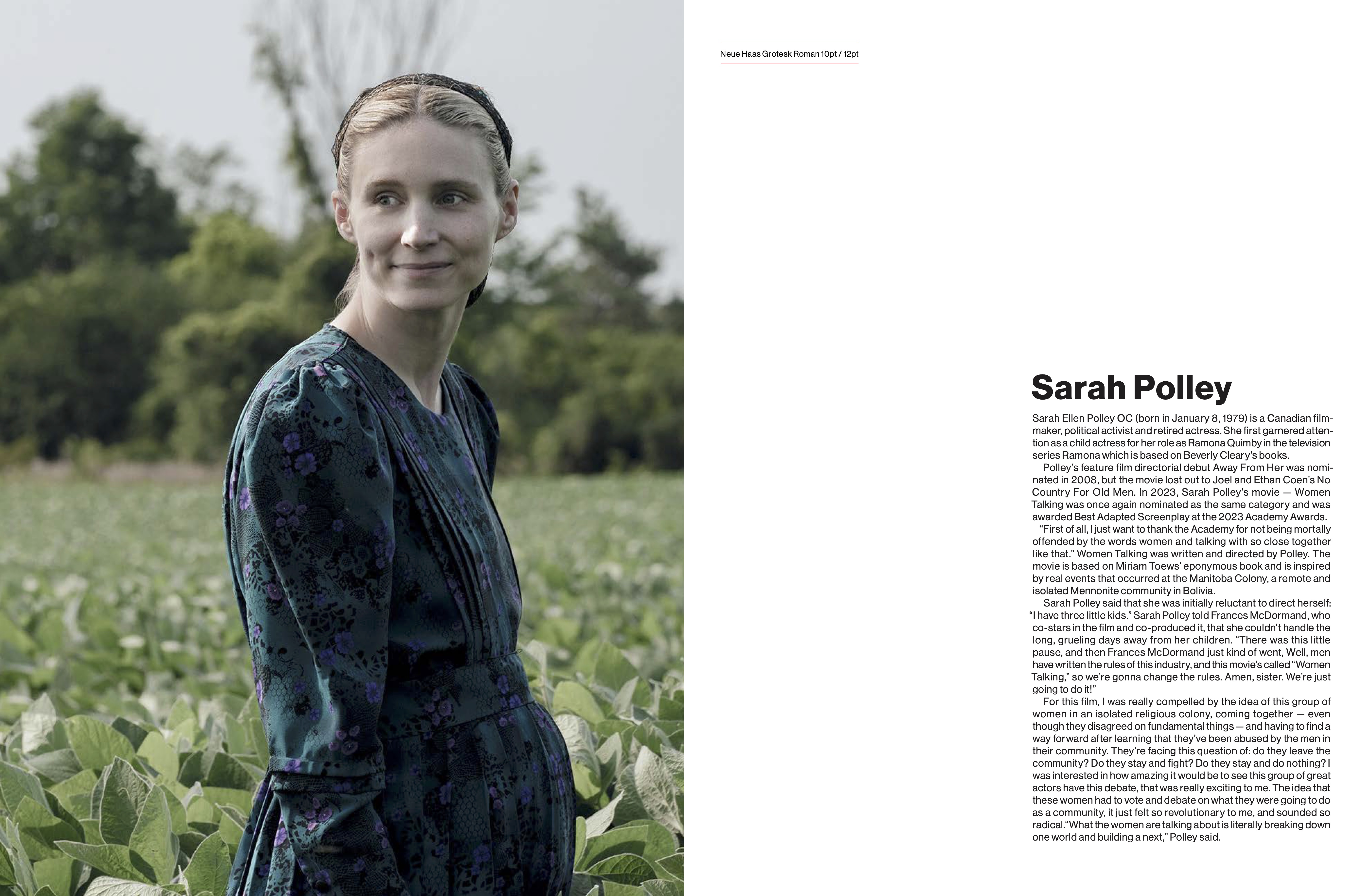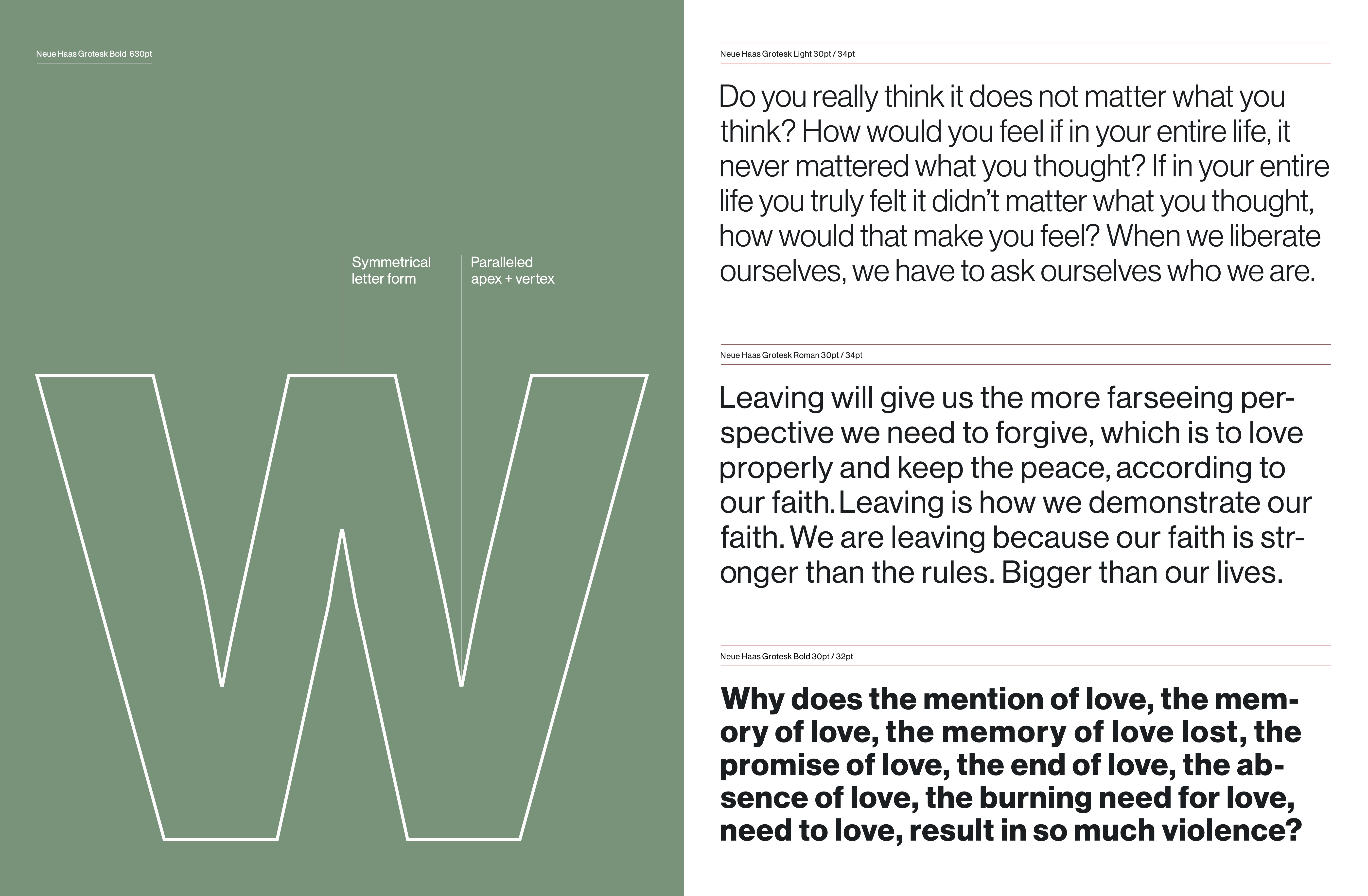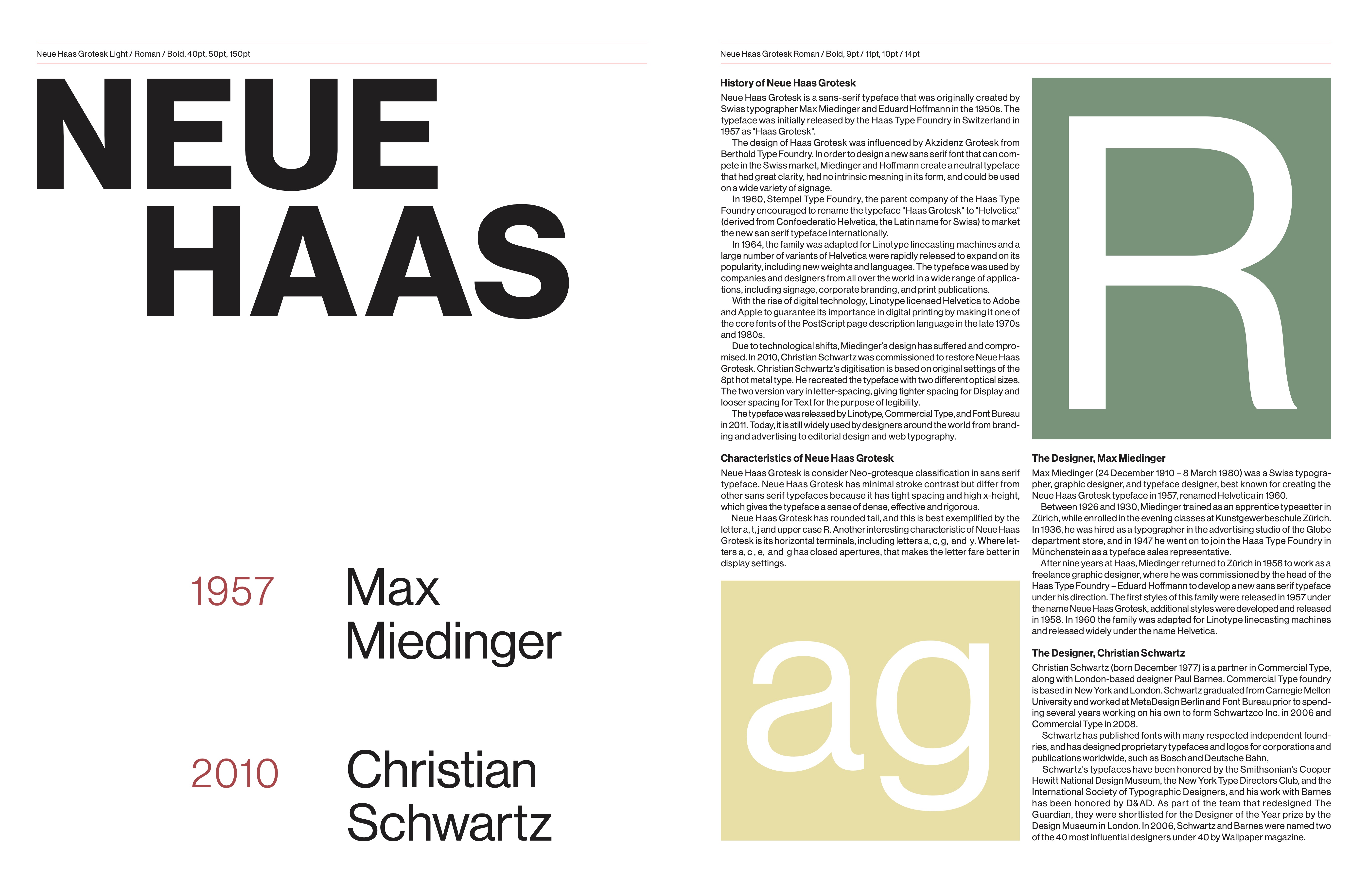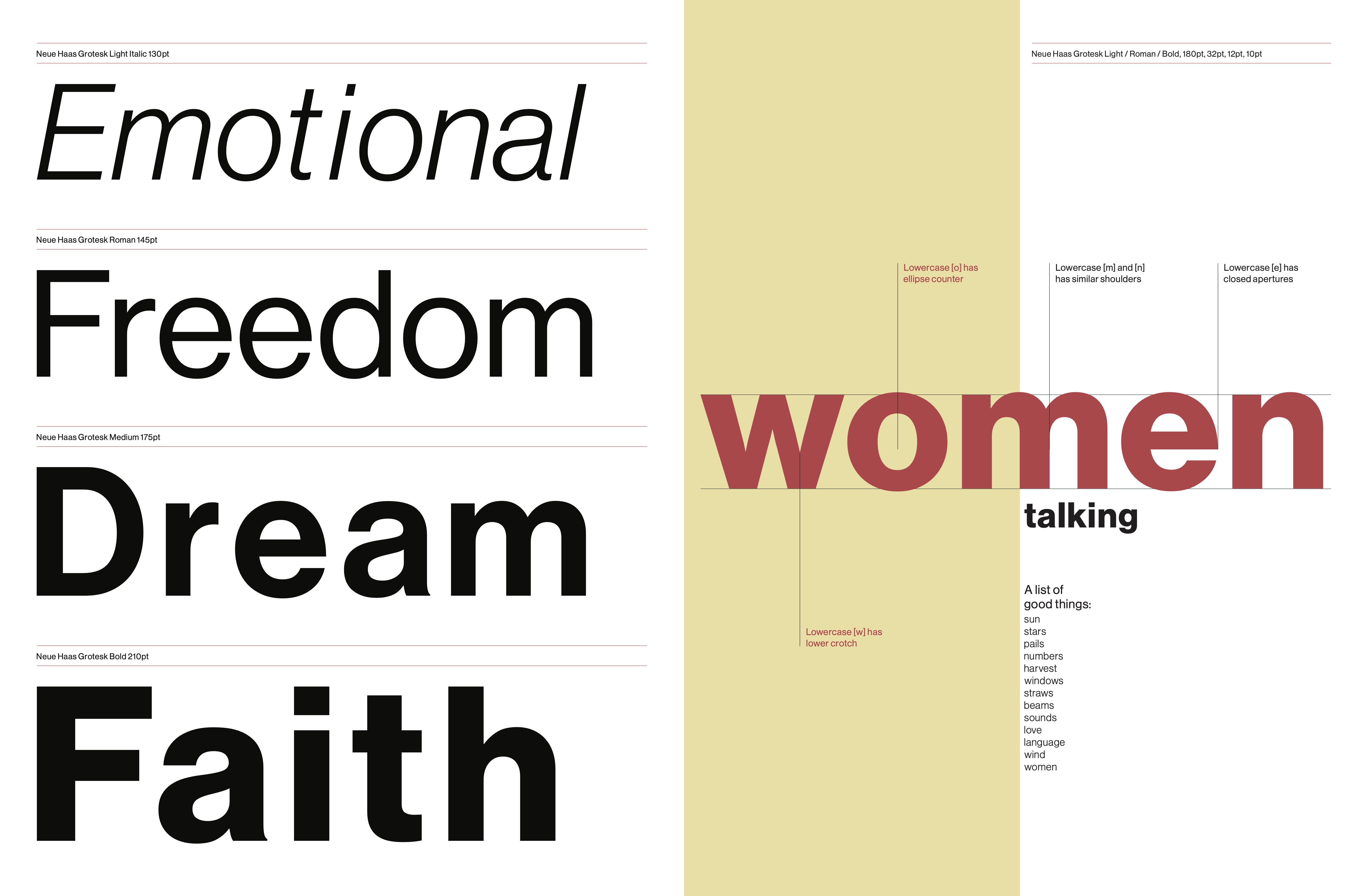 With Cheri Grey's guidance, I utilized InDesign to create a type specimen booklet showcasing the Neue Haas Grotesk typeface, which was designed by Max Miedinger (1957) and Christian Schwartz (2010). In this project, I also integrated references to the filmmaker Sarah Polley and her film "Women Talking," skillfully connecting the typeface with the cinematic work while maintaining its prominence in the design.