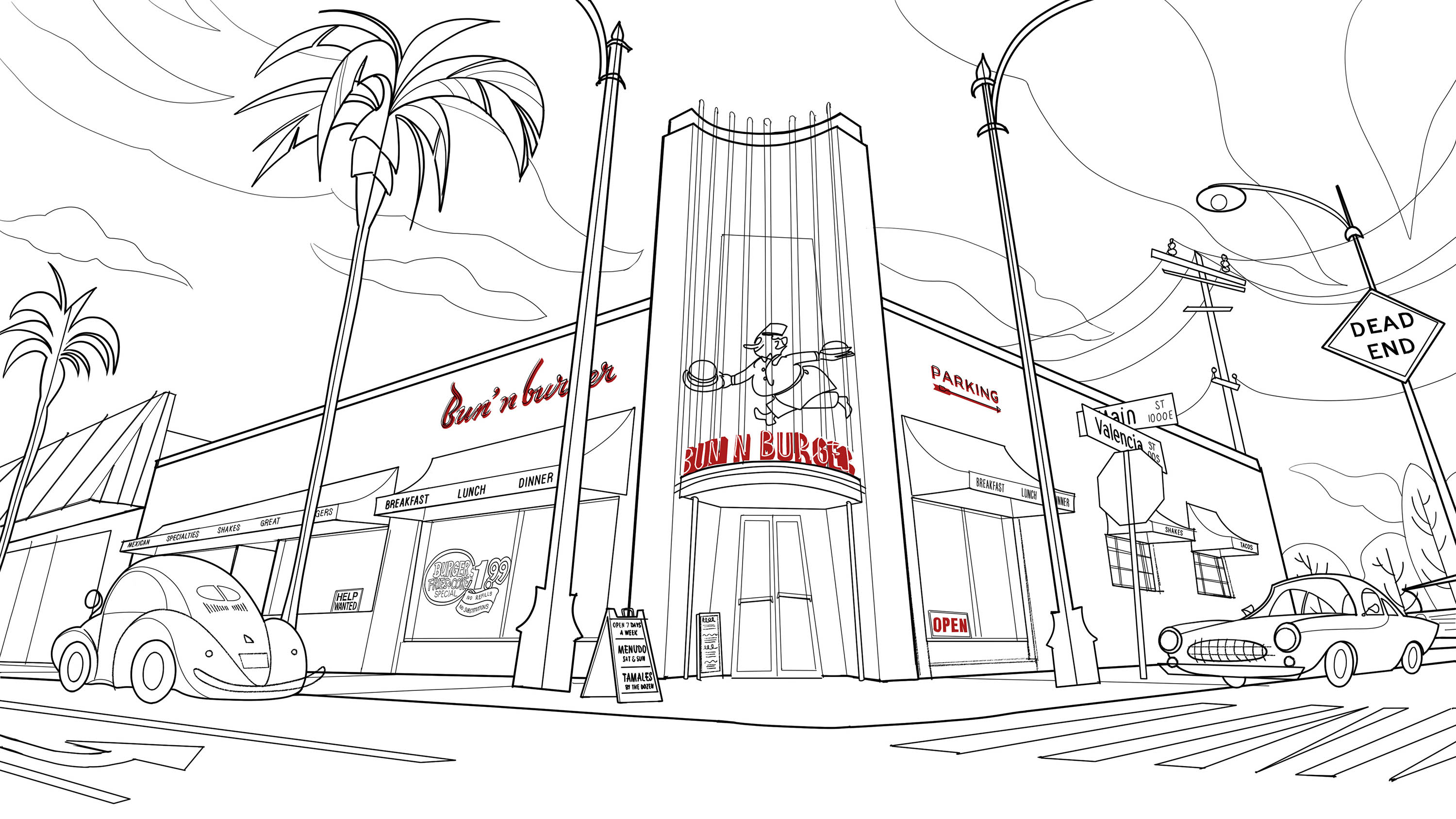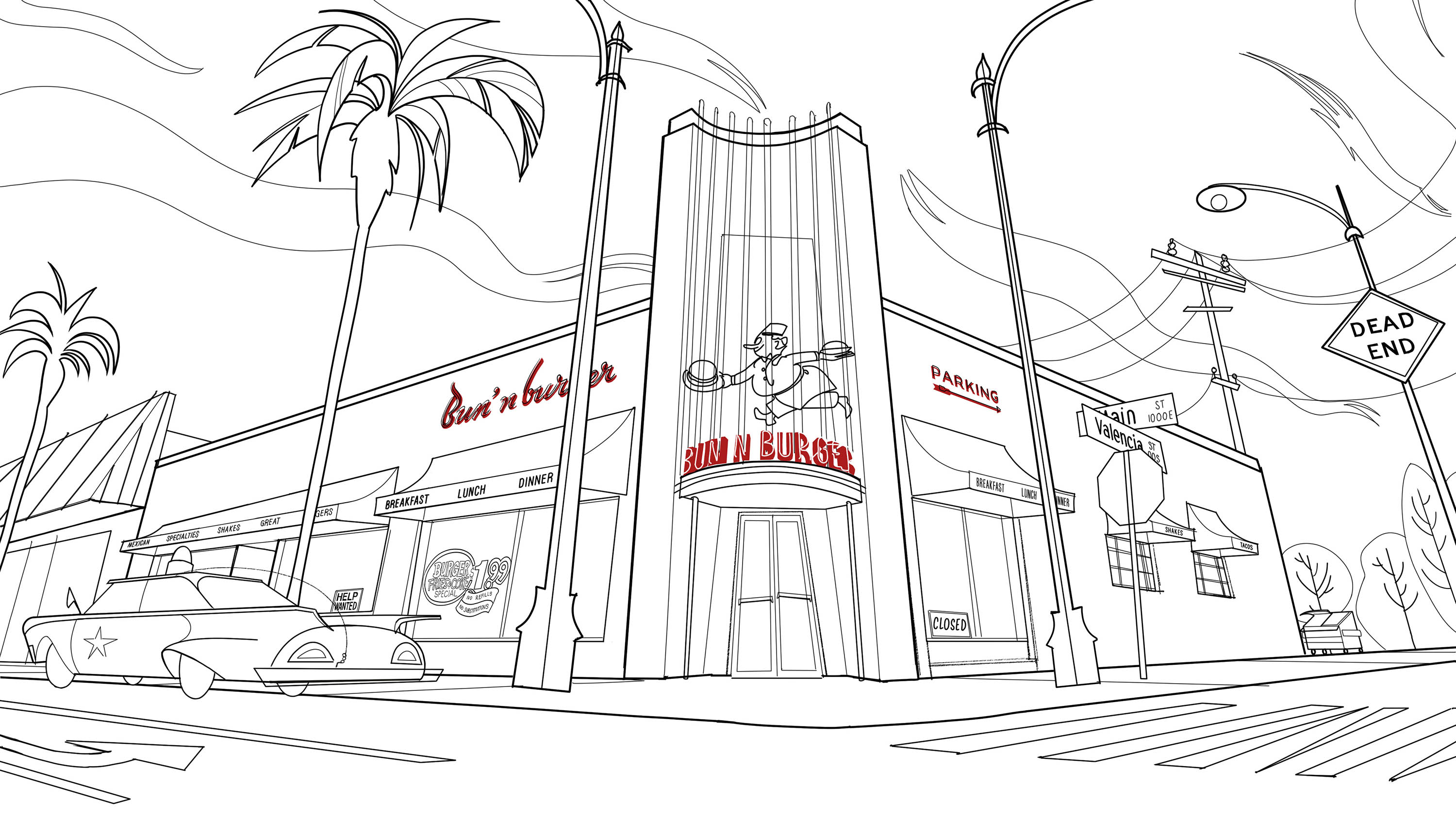 I love to show character in buildings themselves, and Bun 'N Burger has a unique atmosphere. I enjoyed pushing the shape language to emphasize the charming quality in the daytime scene. When creating the nighttime scene, I discovered that the restaurant does not turn on their neon sign at night. However, this allowed me to invent my own storytelling moment. Having the sign off gave an ominous feeling and a sense of mystery, which became the focus of the nighttime scene.