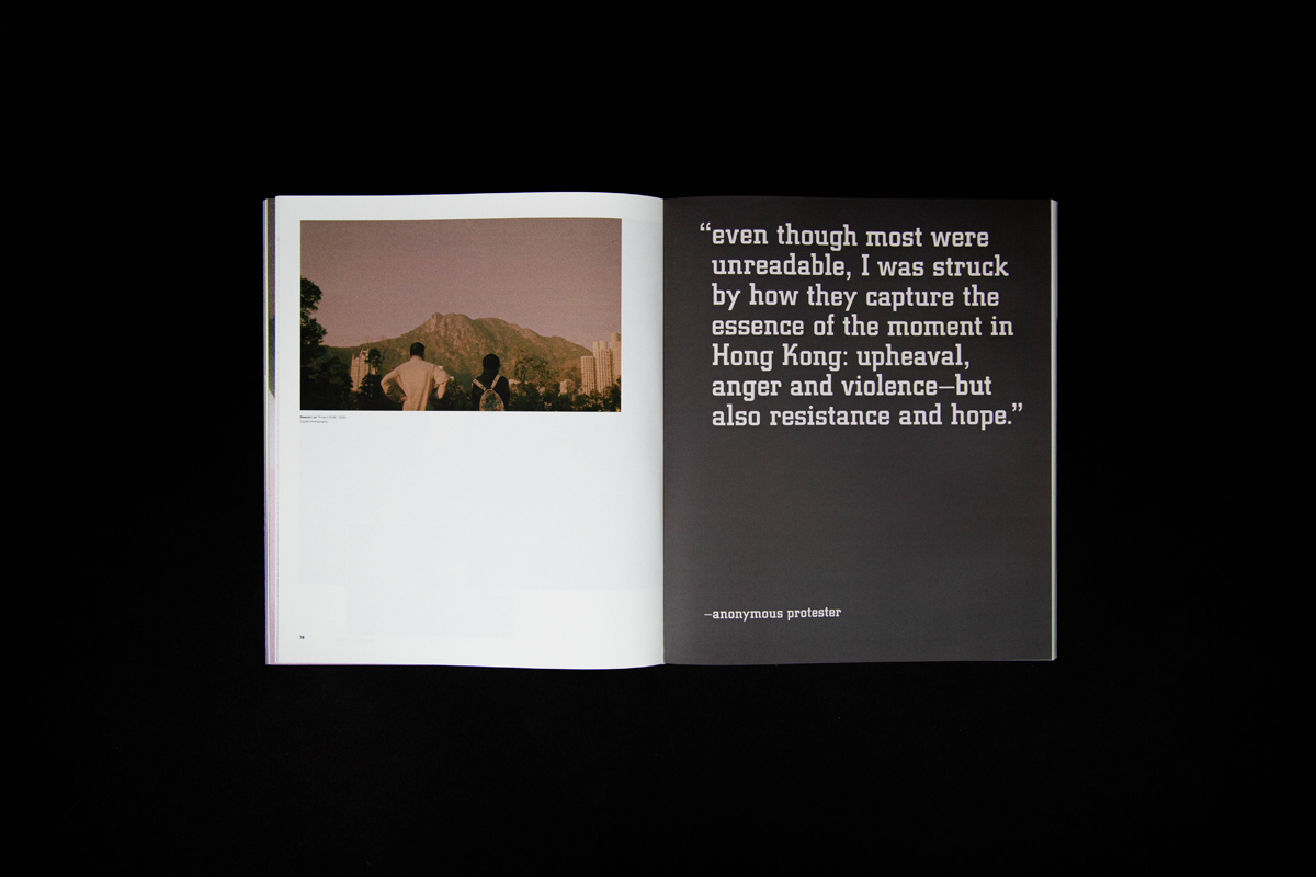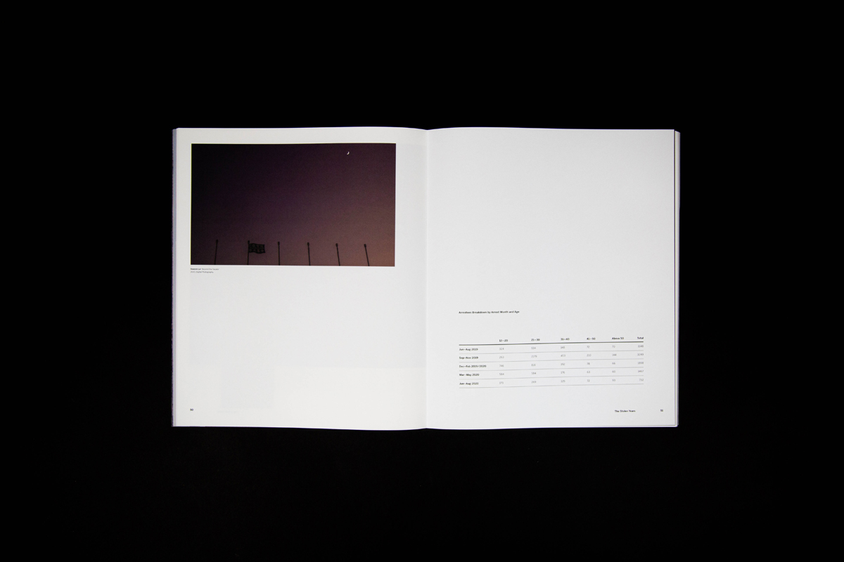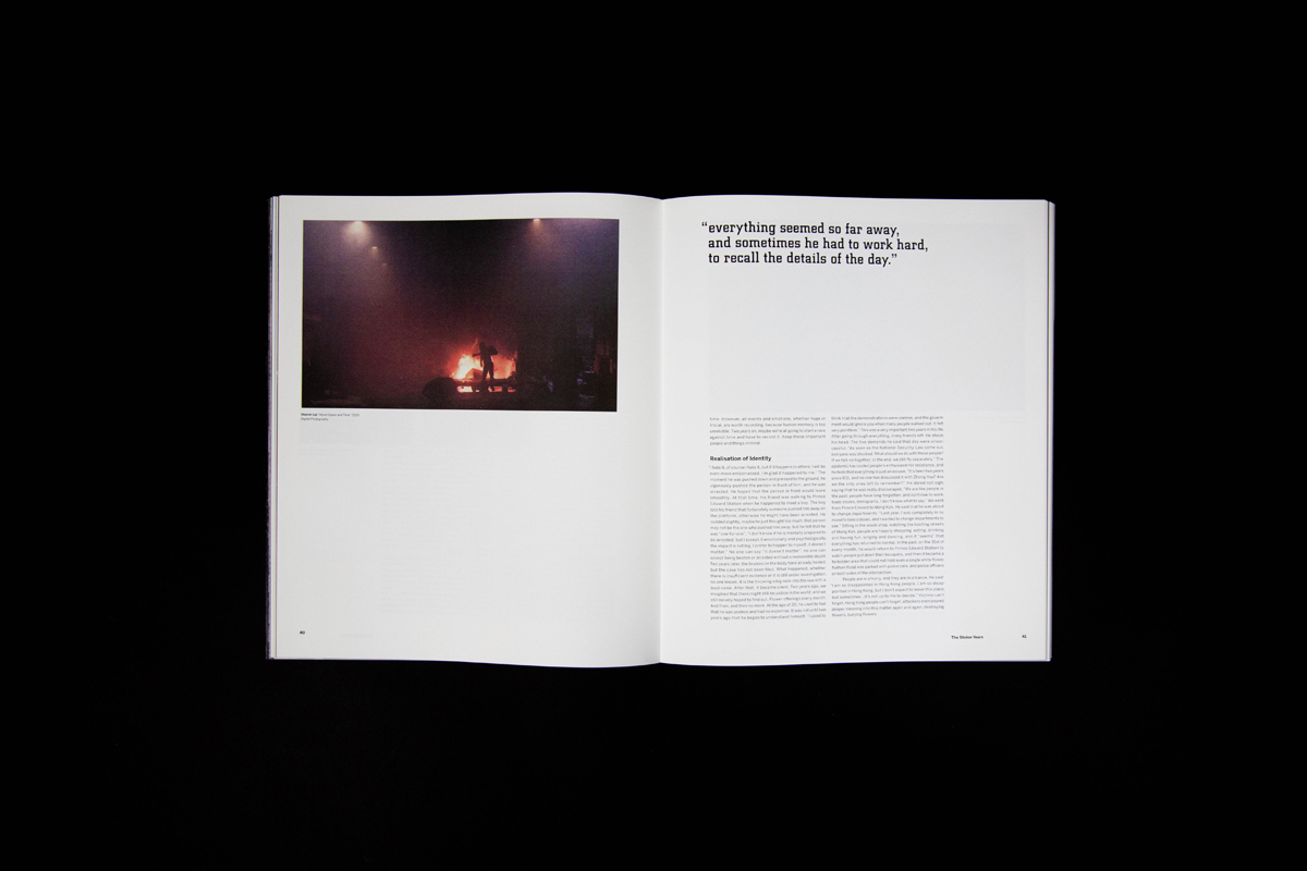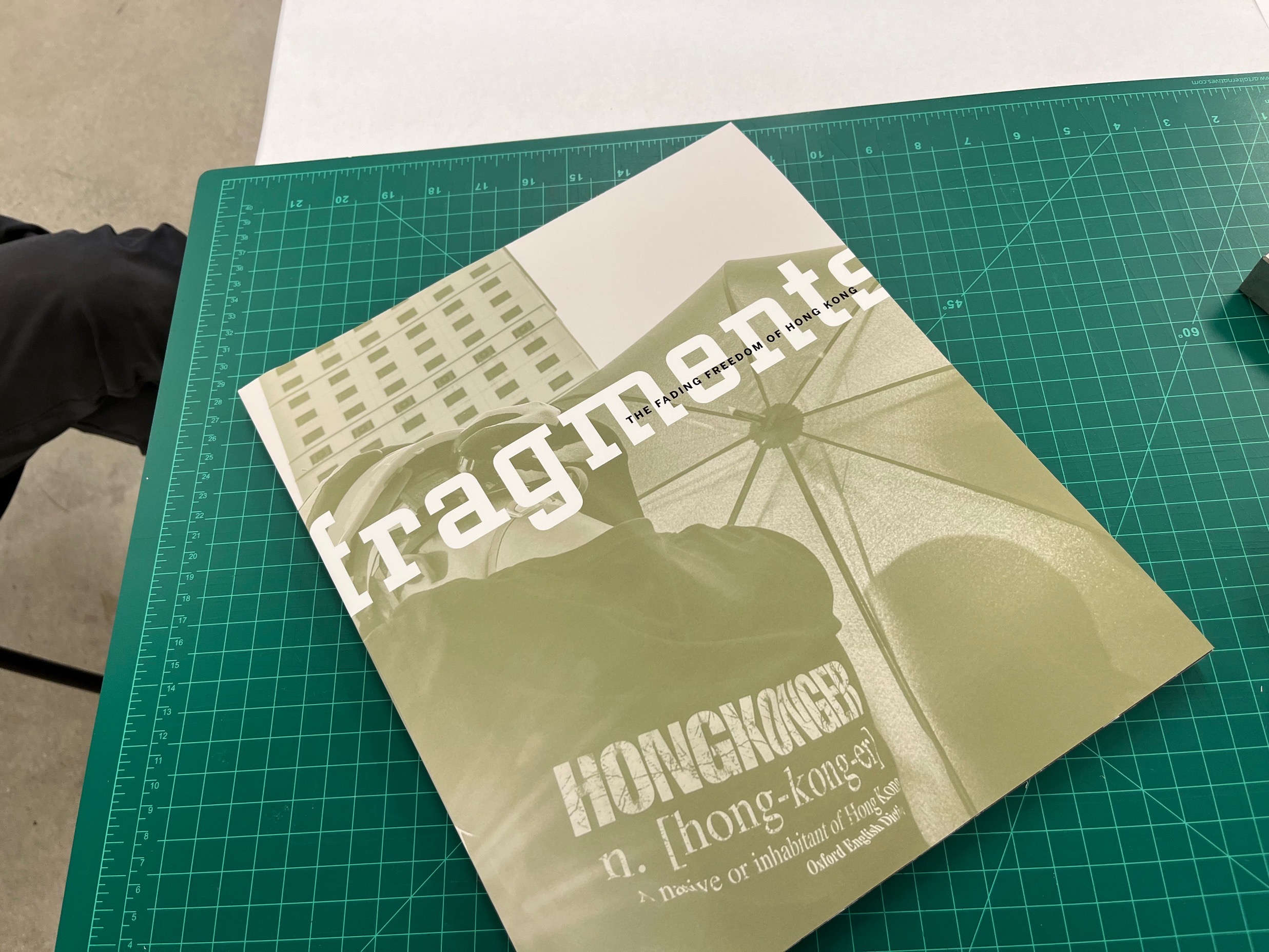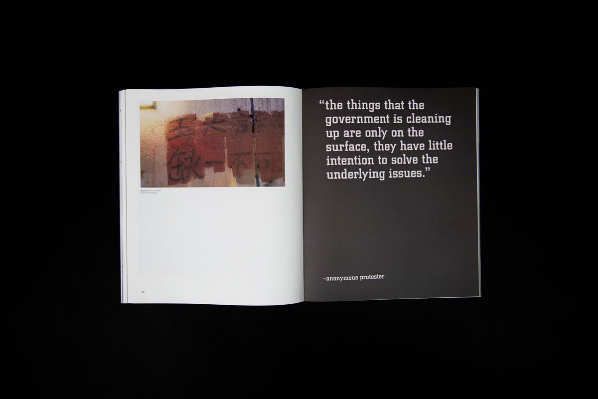 Fragments symbolize the fragmented memories, signs of protest, and division in society happening in Hong Kong over the past ten years. It also means looking into the “truth” from different angles, connecting the missing pieces, and came to together our own stories as people of Hong Kong. The book has 150 pages in total, printed at Nonstop Printing, and perfect bound was done on my own.