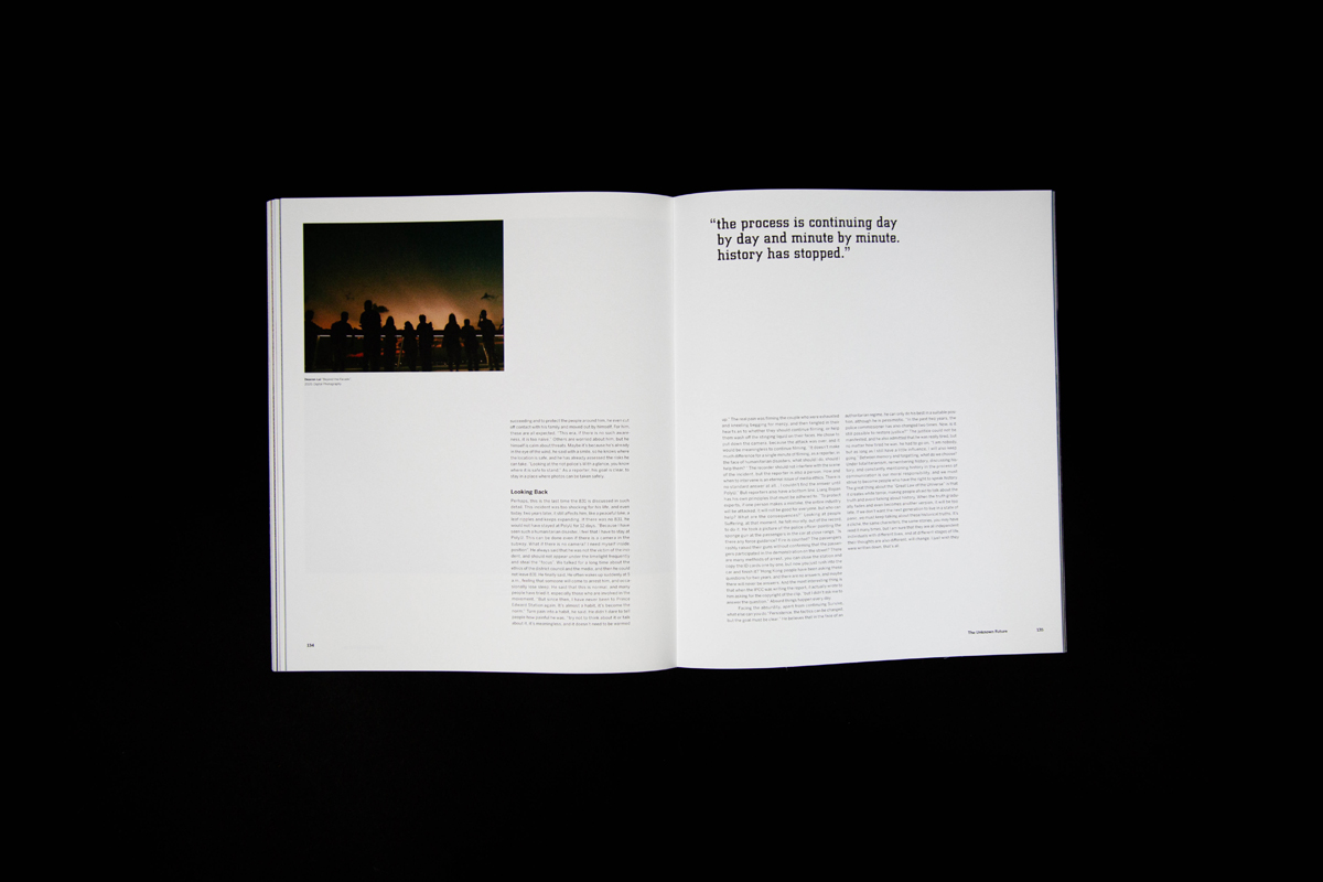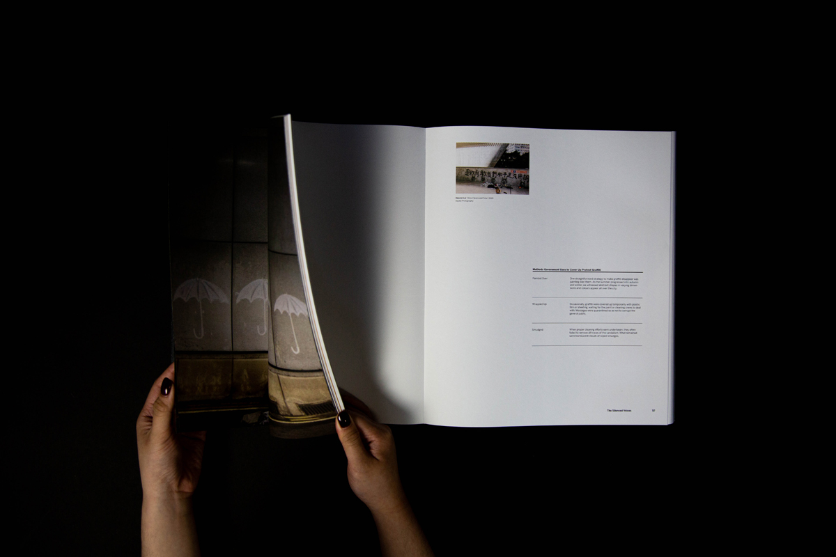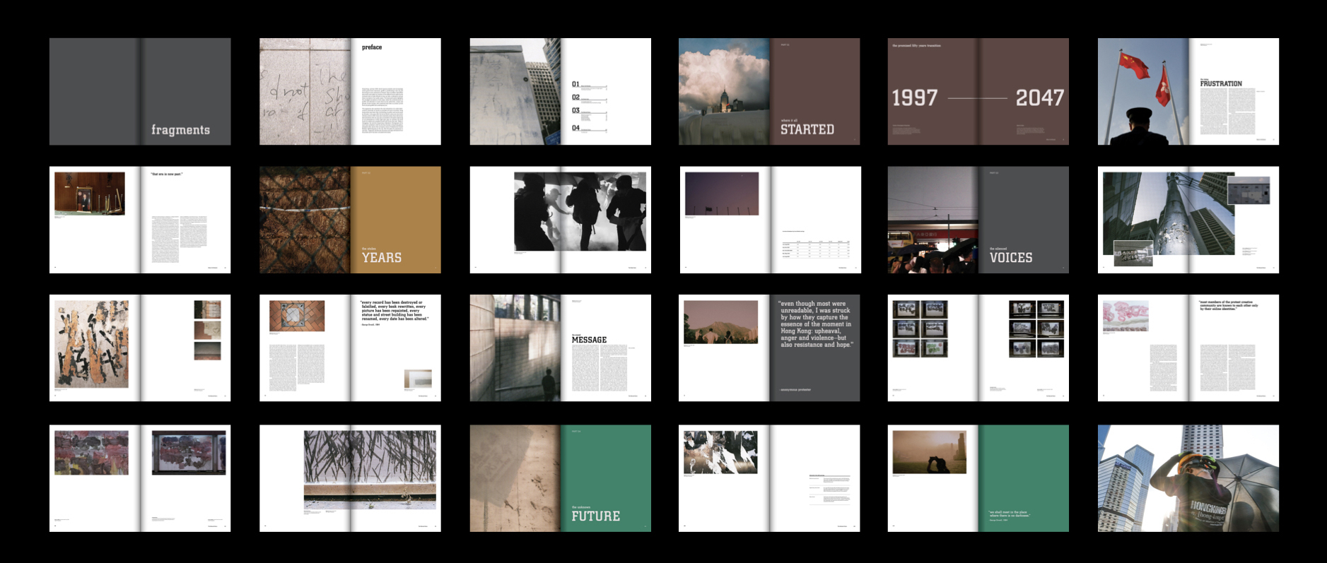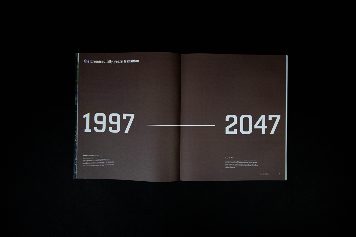 Fragments symbolize the fragmented memories, signs of protest, and division in society happening in Hong Kong over the past ten years. It also means looking into the “truth” from different angles, connecting the missing pieces, and came to together our own stories as people of Hong Kong. The book has 150 pages in total, printed at Nonstop Printing, and perfect bound was done on my own.