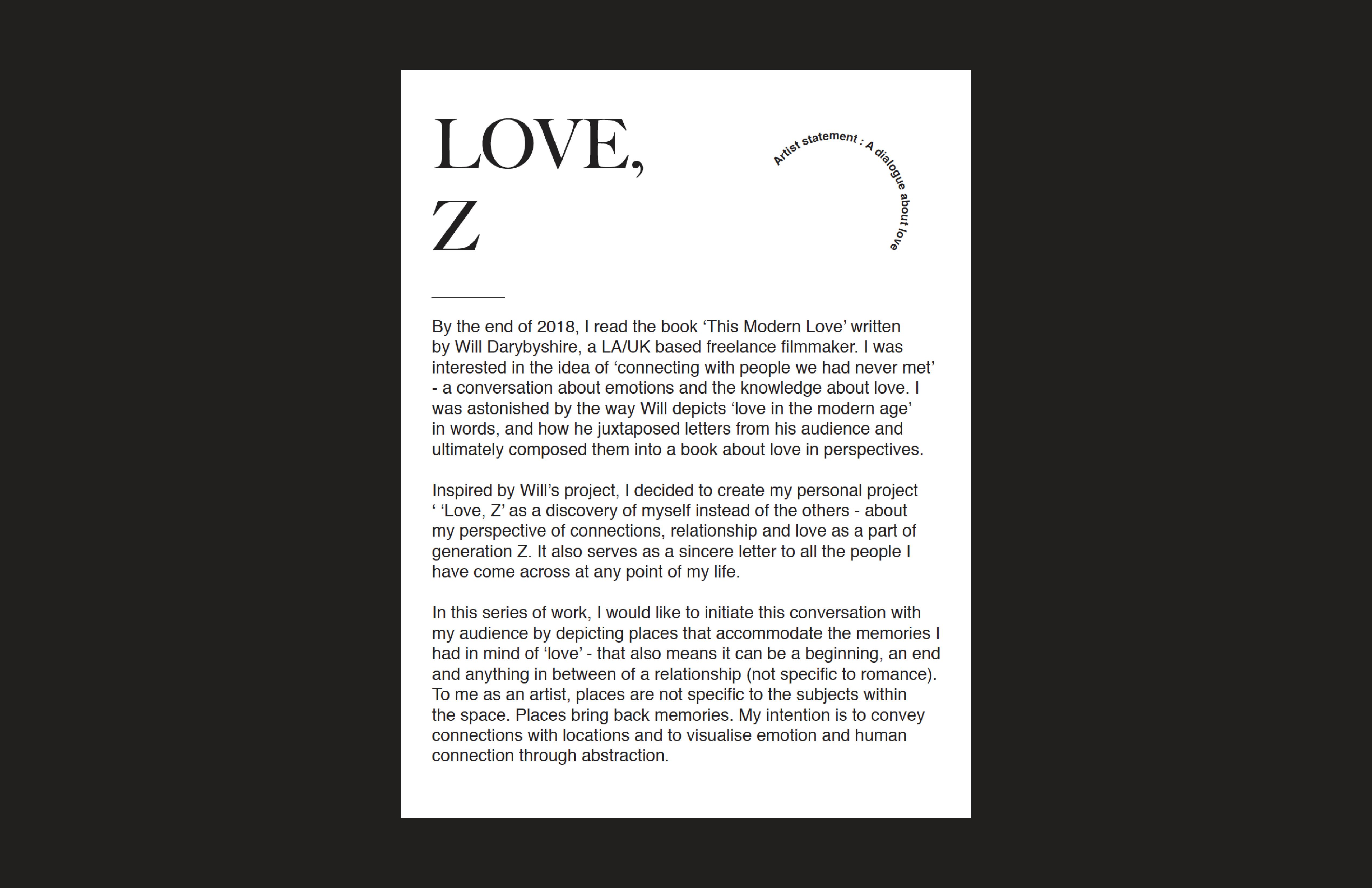 Love, Z is about my experience and encounters of love as a part of Generation Z. I had a lot of chances traveling around the world, meeting new friends back and forth. Are we actually growing closer or even more apart in the 21th Century?