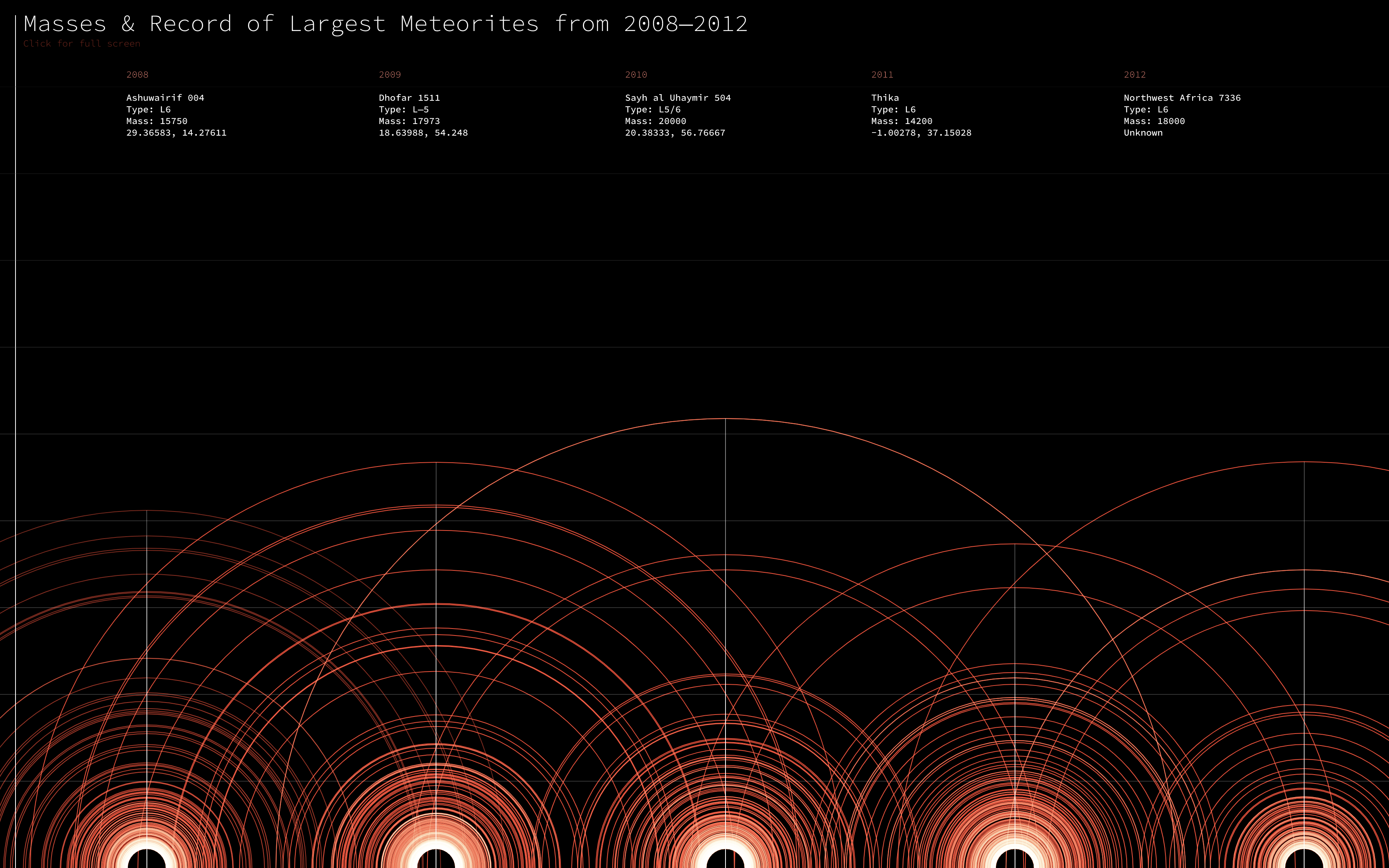 Using p5.js to visualize data from NASA for meteorites between year of 2008 to 2012. The idea was based off from visualiszed through inputing JSON and using Javascript on p5.js to create rings base on size of the meteorites.