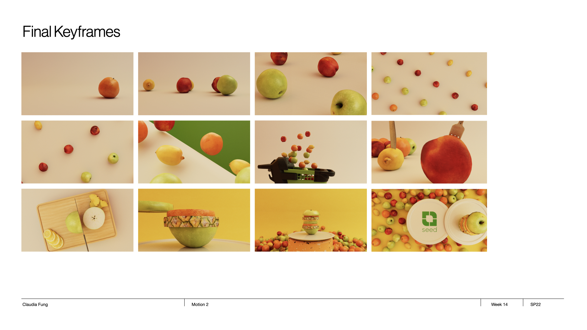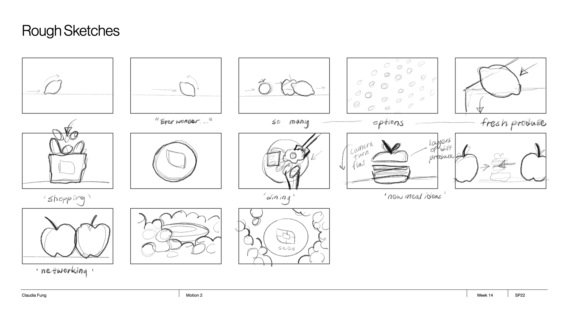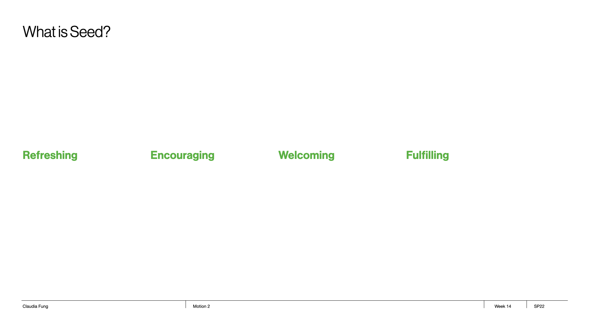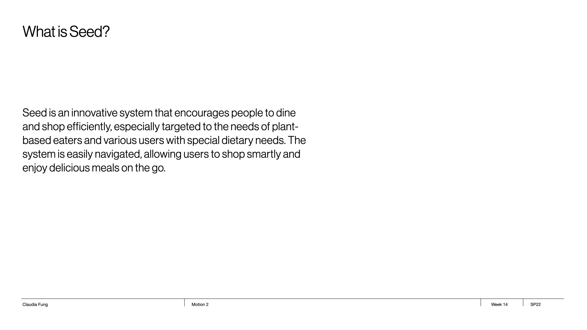 Seed is an innovative system that encourages people to dine and shop efficiently, especially targeted to the needs of plant-based eaters and various users with special dietary needs. The project is to create a commercial between 20—30 seconds conveying the major brand guide words, provoking the interest of potential customers to visit the store with a conceptually approachable, green, and friendly motion piece.