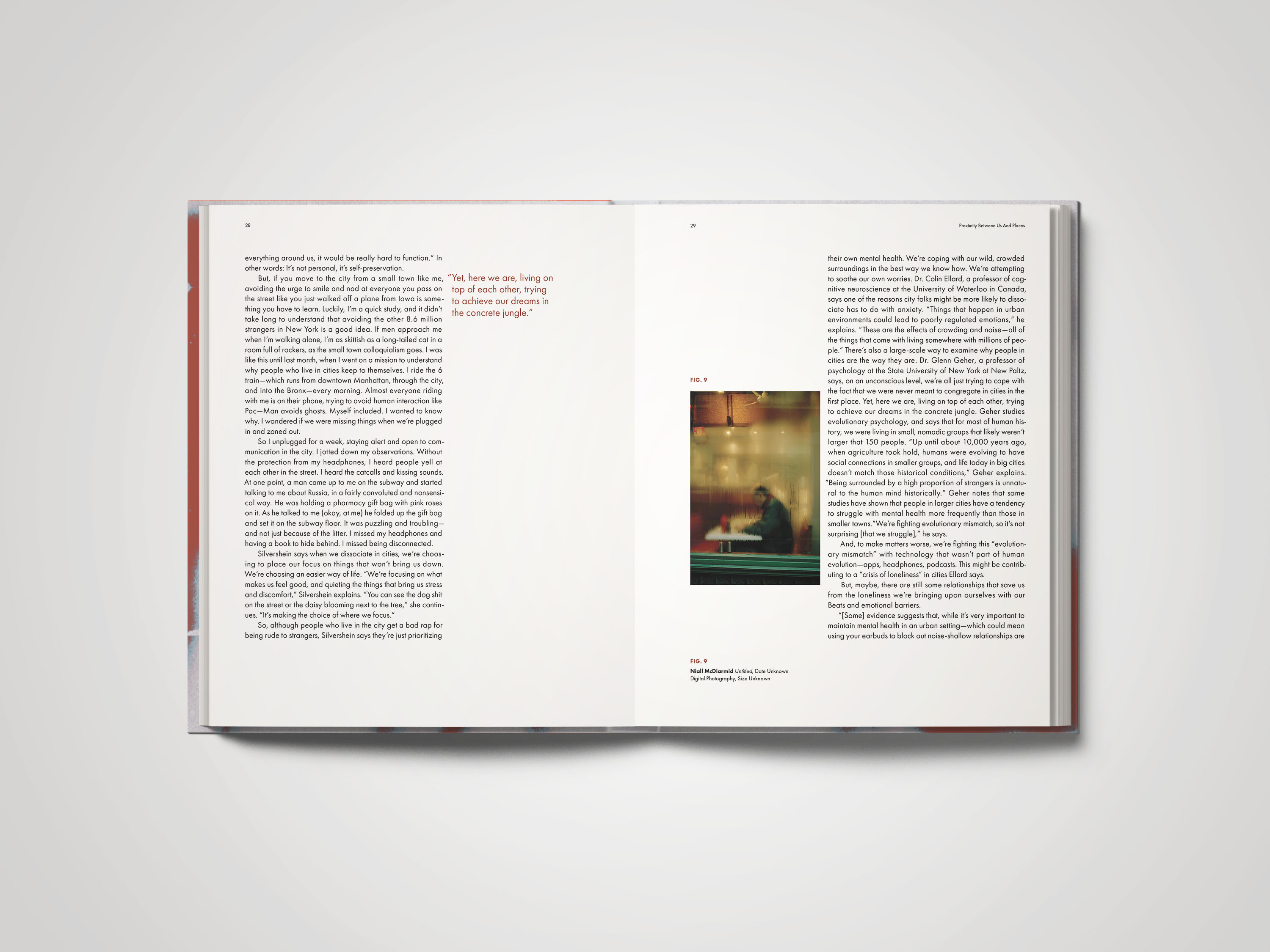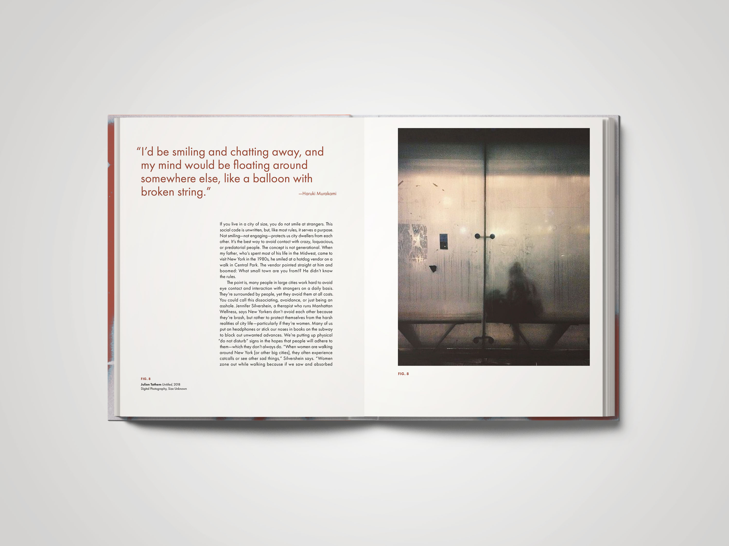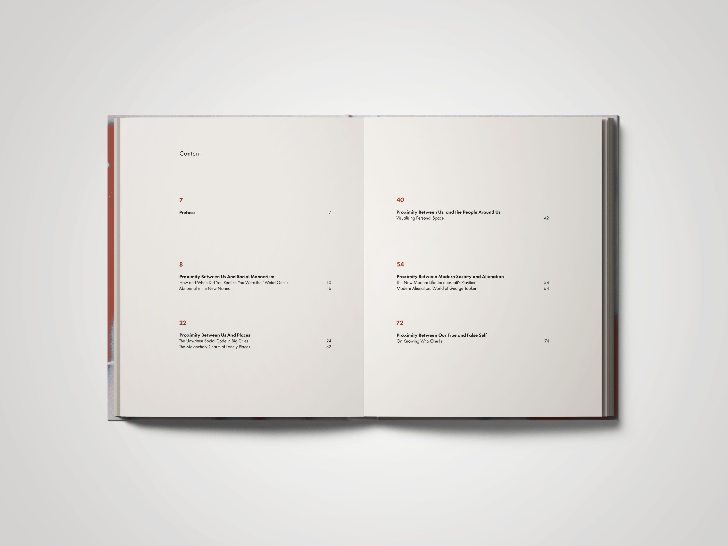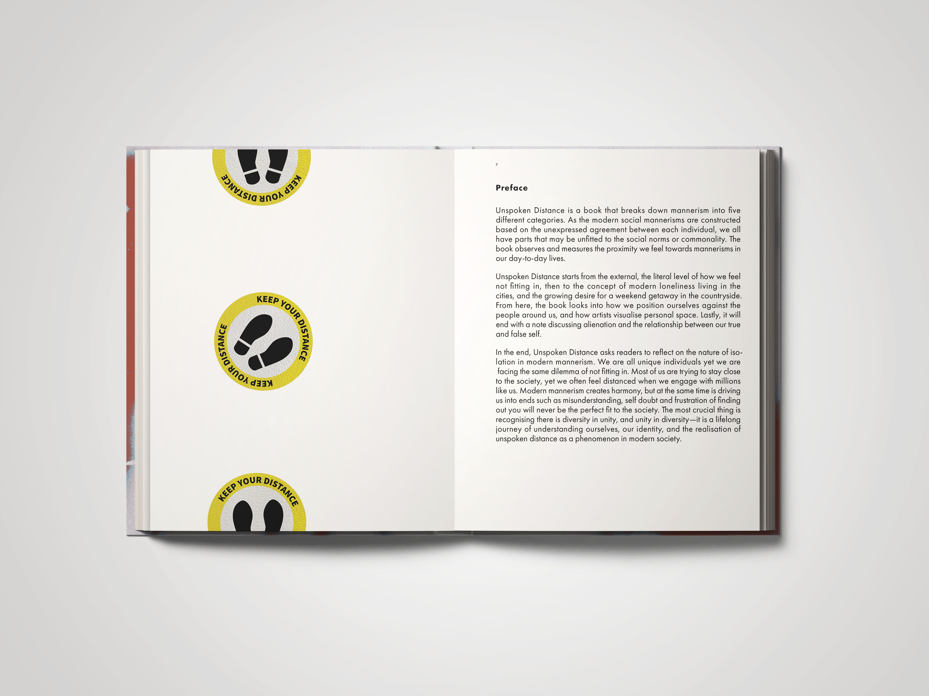 Unspoken Distance is a book that breaks down mannerism into five different categories. As the modern social mannerisms are constructed based on the unexpressed agreement between each individual, we all have parts that may be unfitted to the social norms or commonality. The book observes and measures the proximity we feel towards mannerisms in our day-to-day lives.