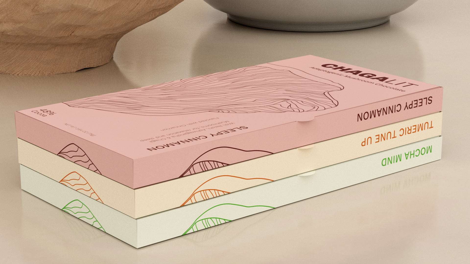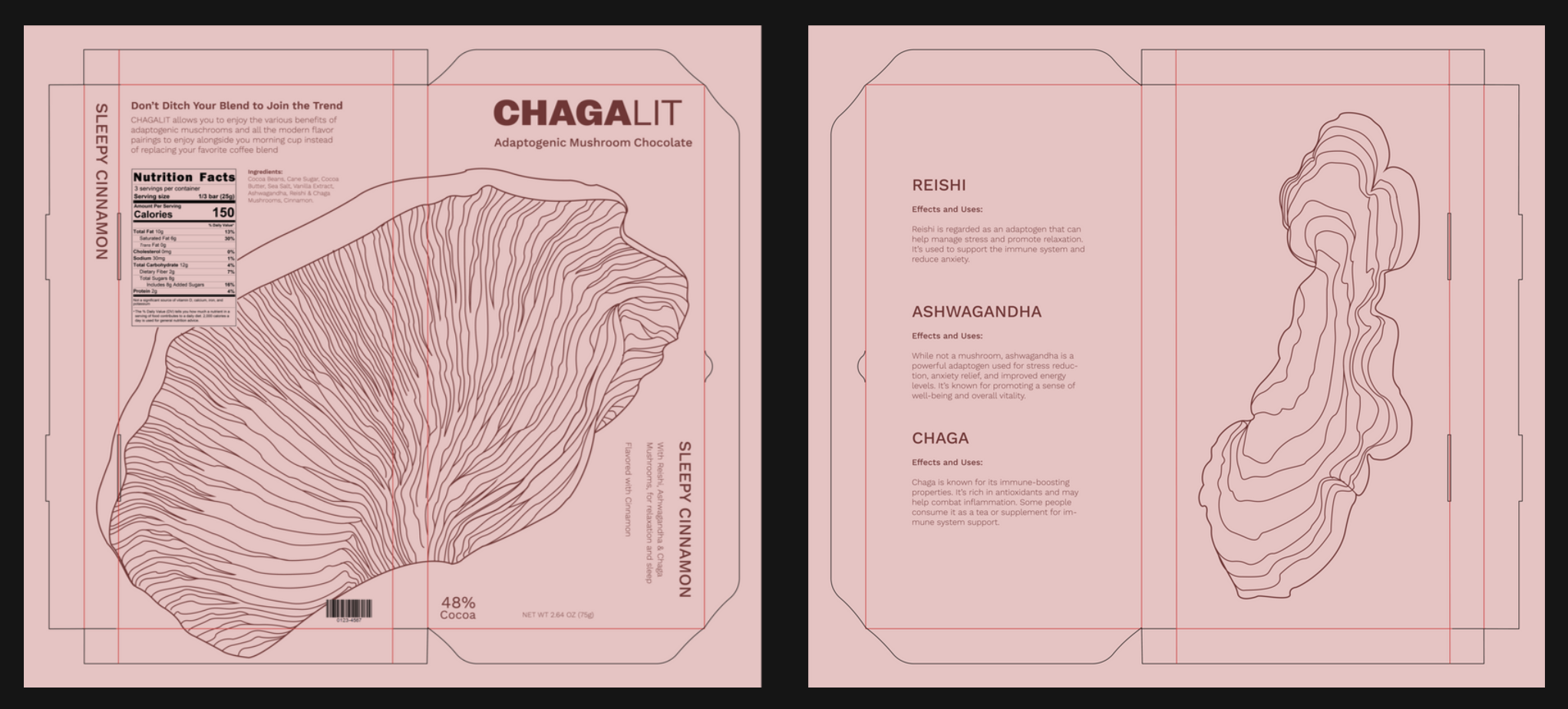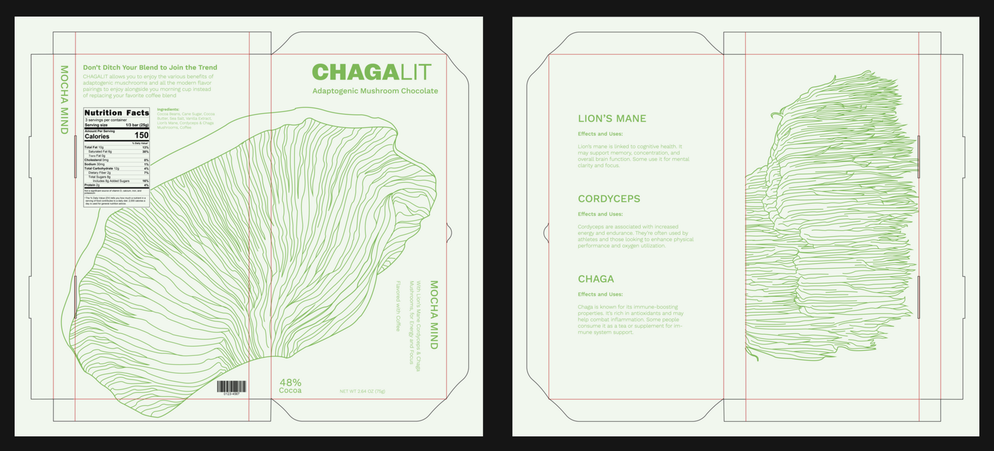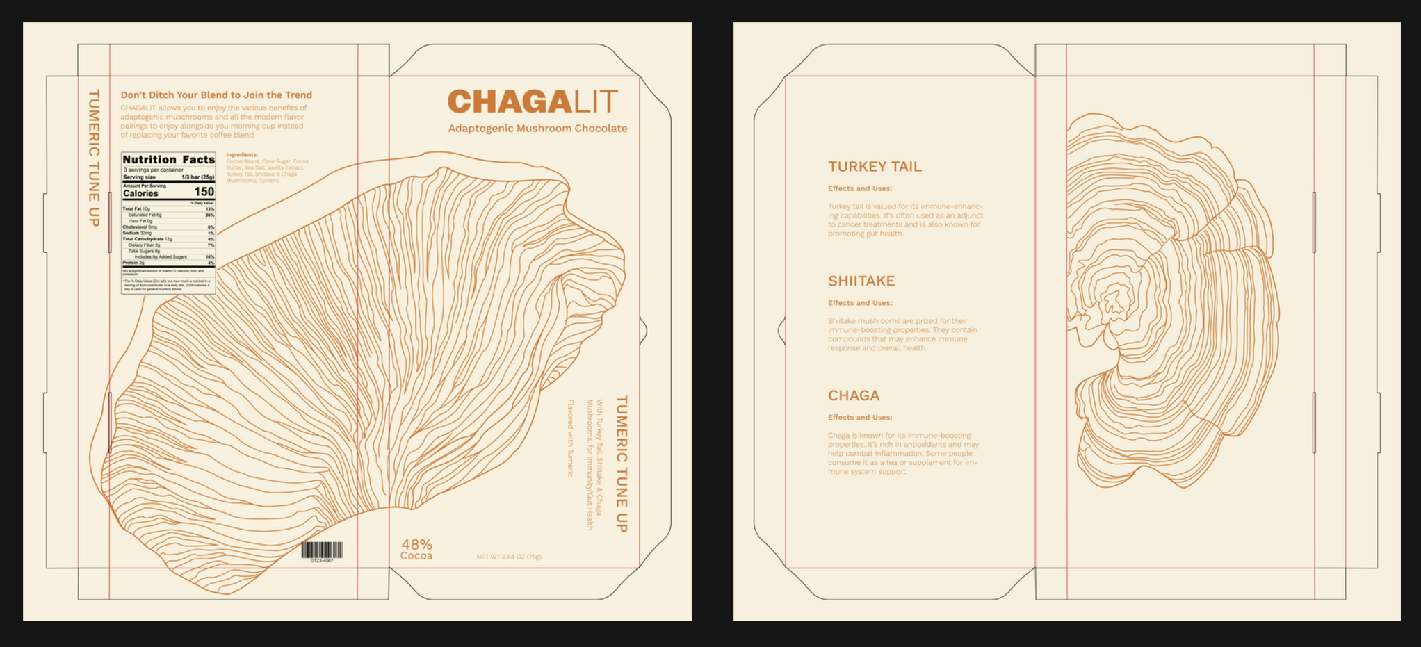An adaptogenic mushroom chocolate bar concept I created based on the idea of wanting to try the effects of adaptogenic mushrooms without giving up your favorite blend of coffee. I developed the packaging and prototypes for 3 different flavors with different intended effects, and paired the flavor profiles of the specific adaptogens being used with the additional flavors incorporated into the chocolate bar. All 3 bars contain Chaga mushrooms.