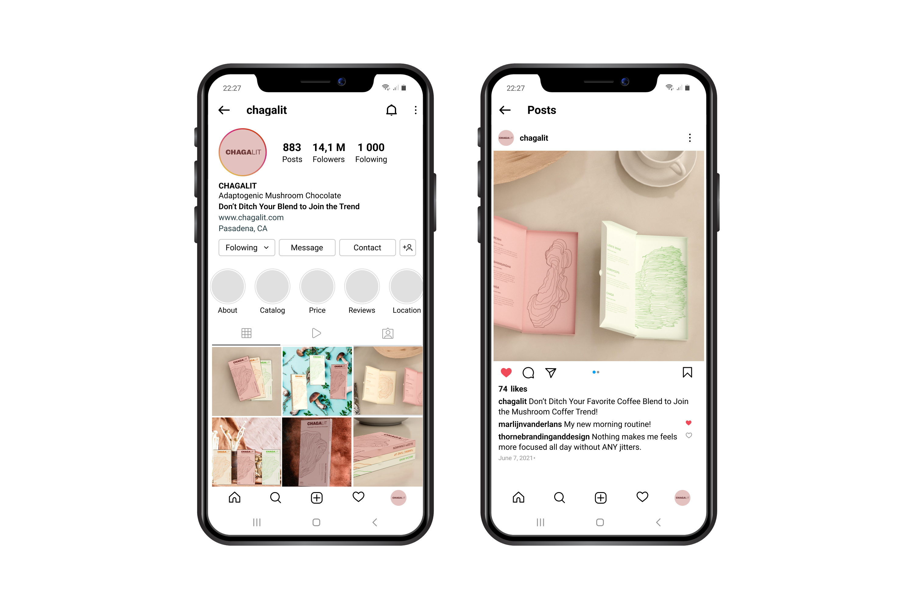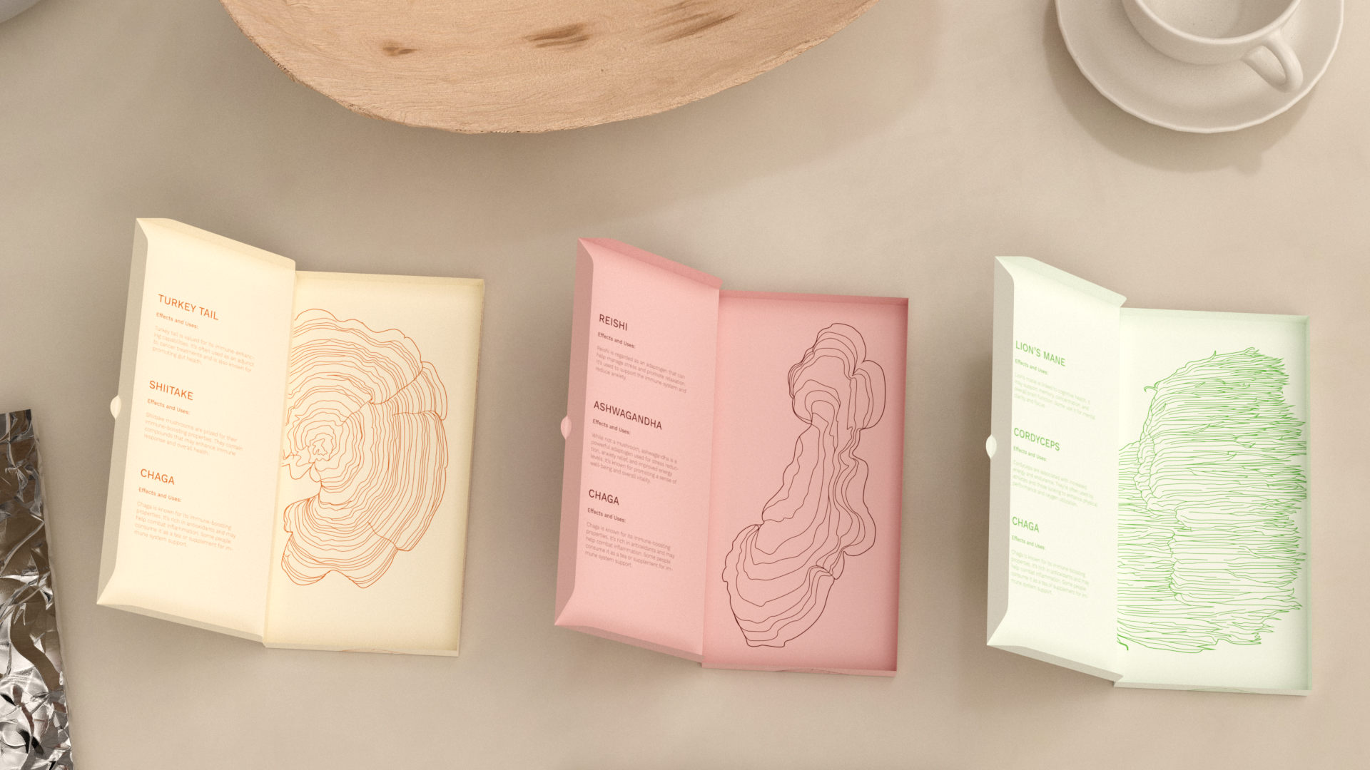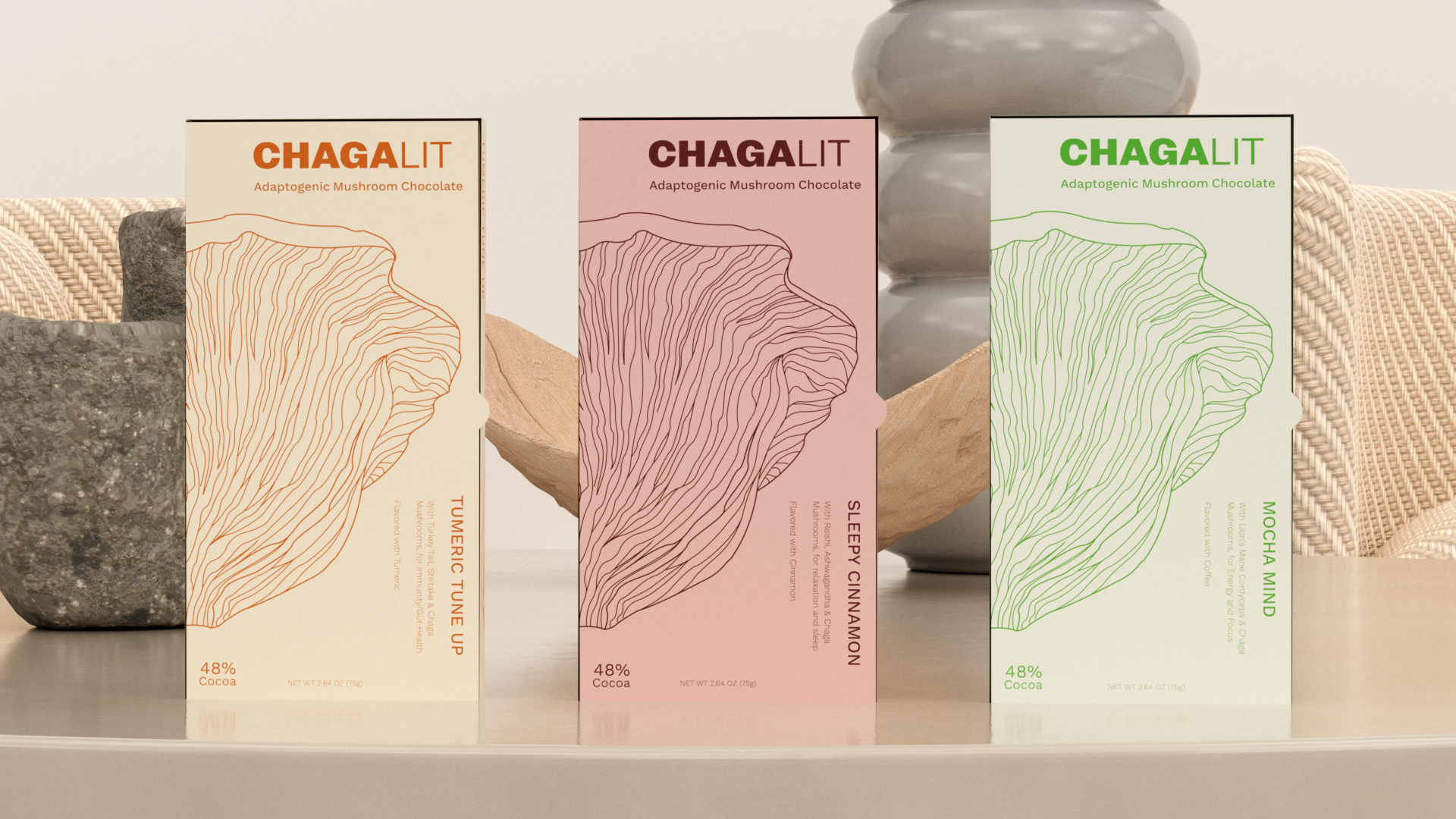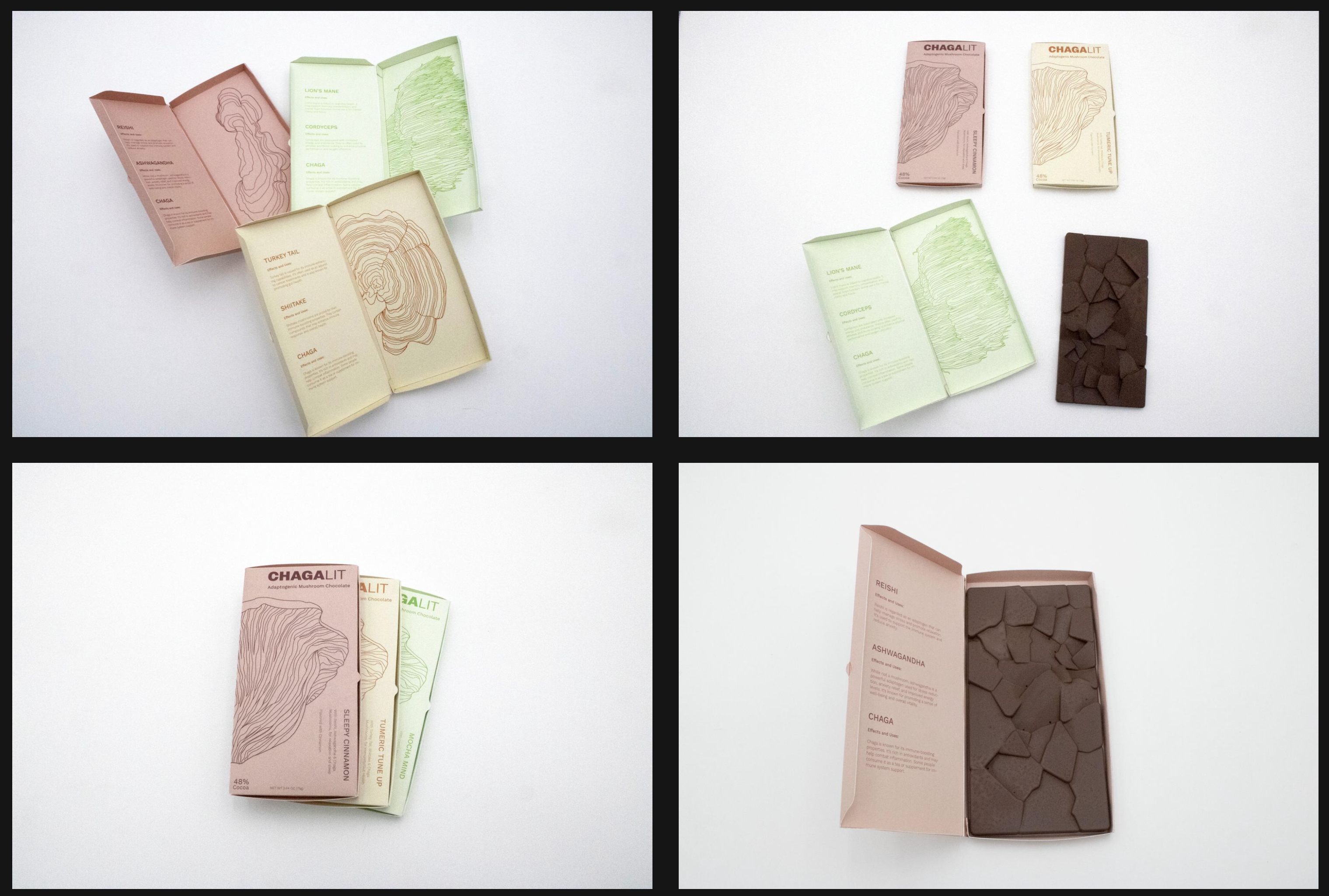 An adaptogenic mushroom chocolate bar concept I created based on the idea of wanting to try the effects of adaptogenic mushrooms without giving up your favorite blend of coffee. I developed the packaging and prototypes for 3 different flavors with different intended effects, and paired the flavor profiles of the specific adaptogens being used with the additional flavors incorporated into the chocolate bar. All 3 bars contain Chaga mushrooms.