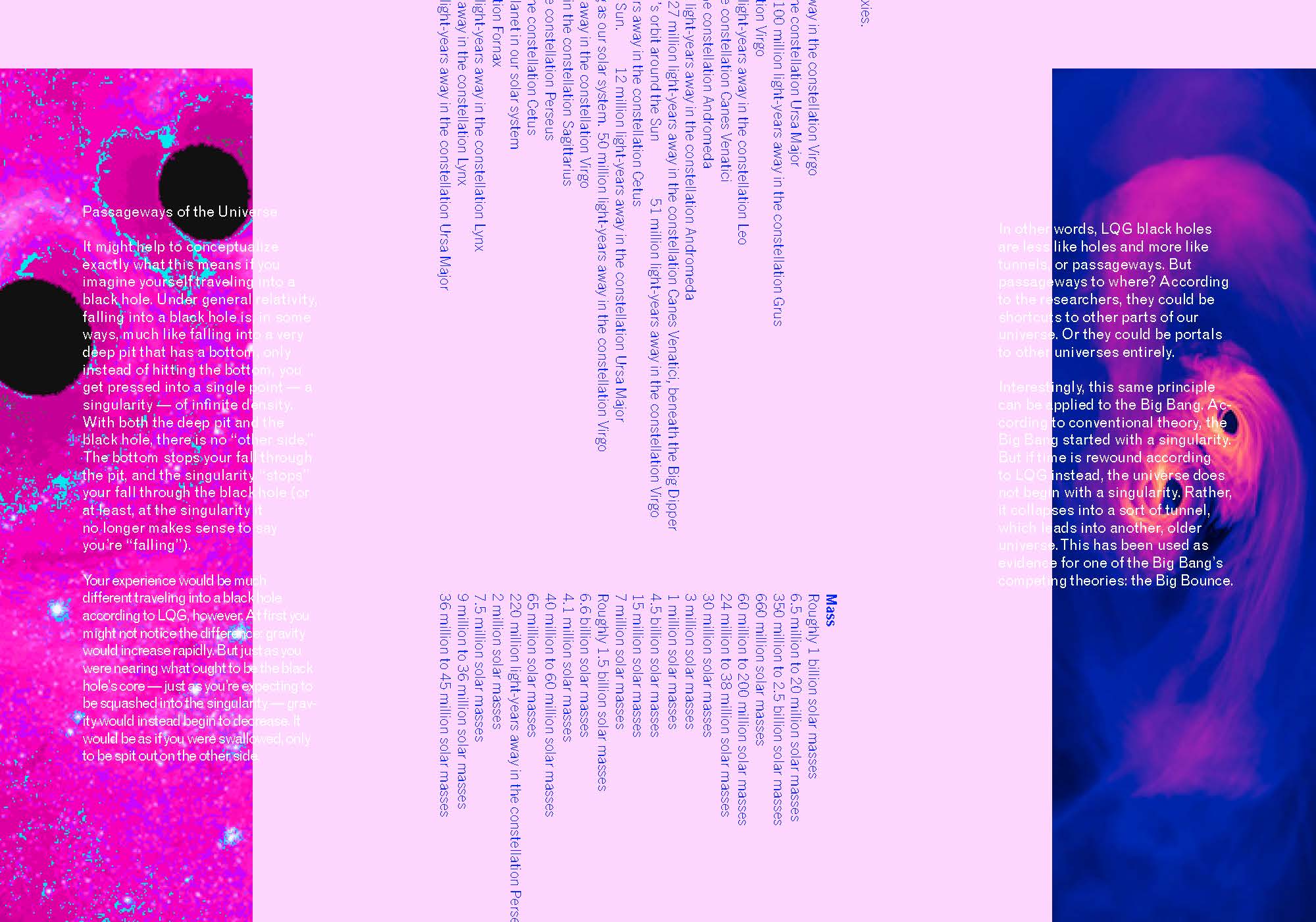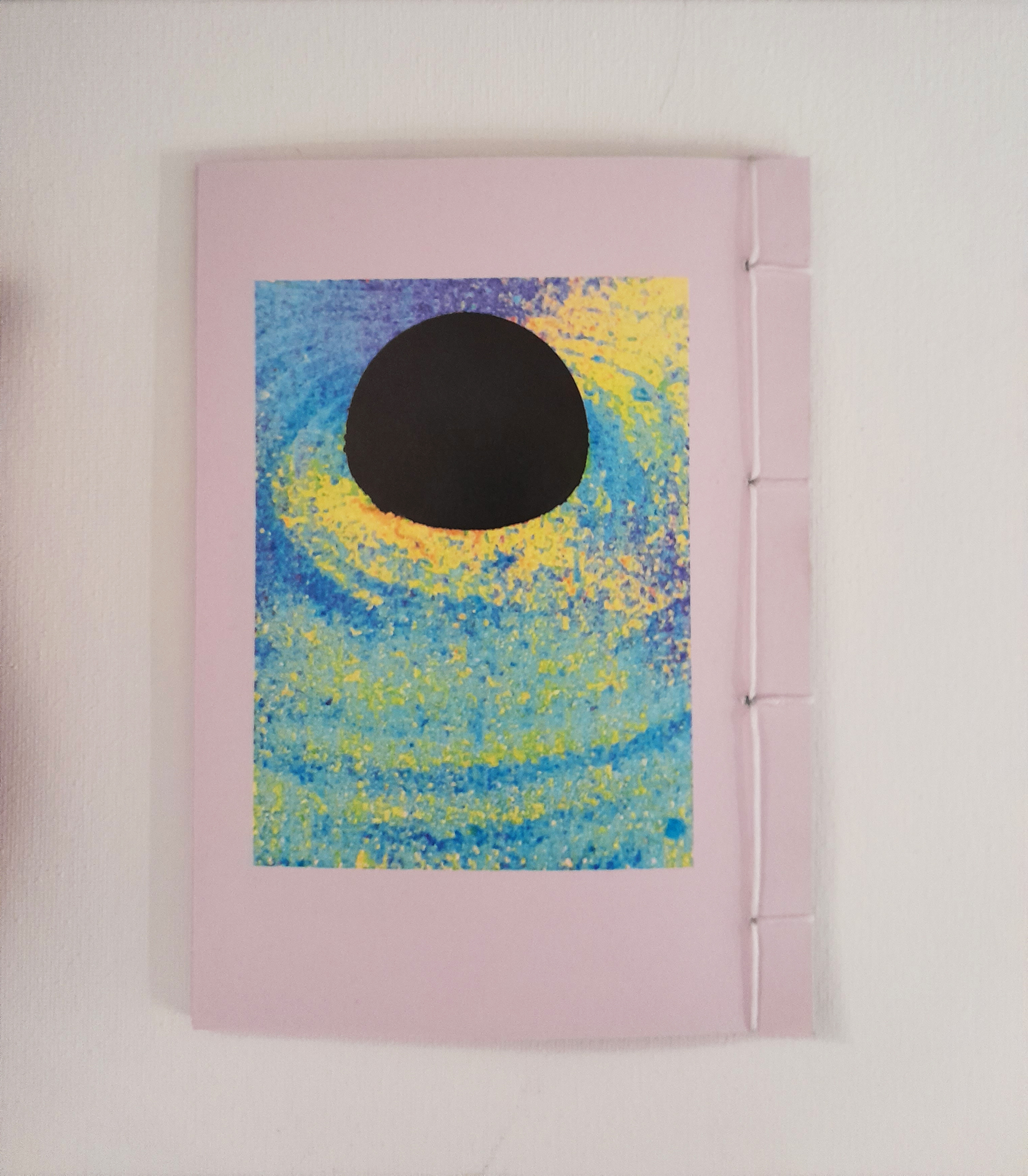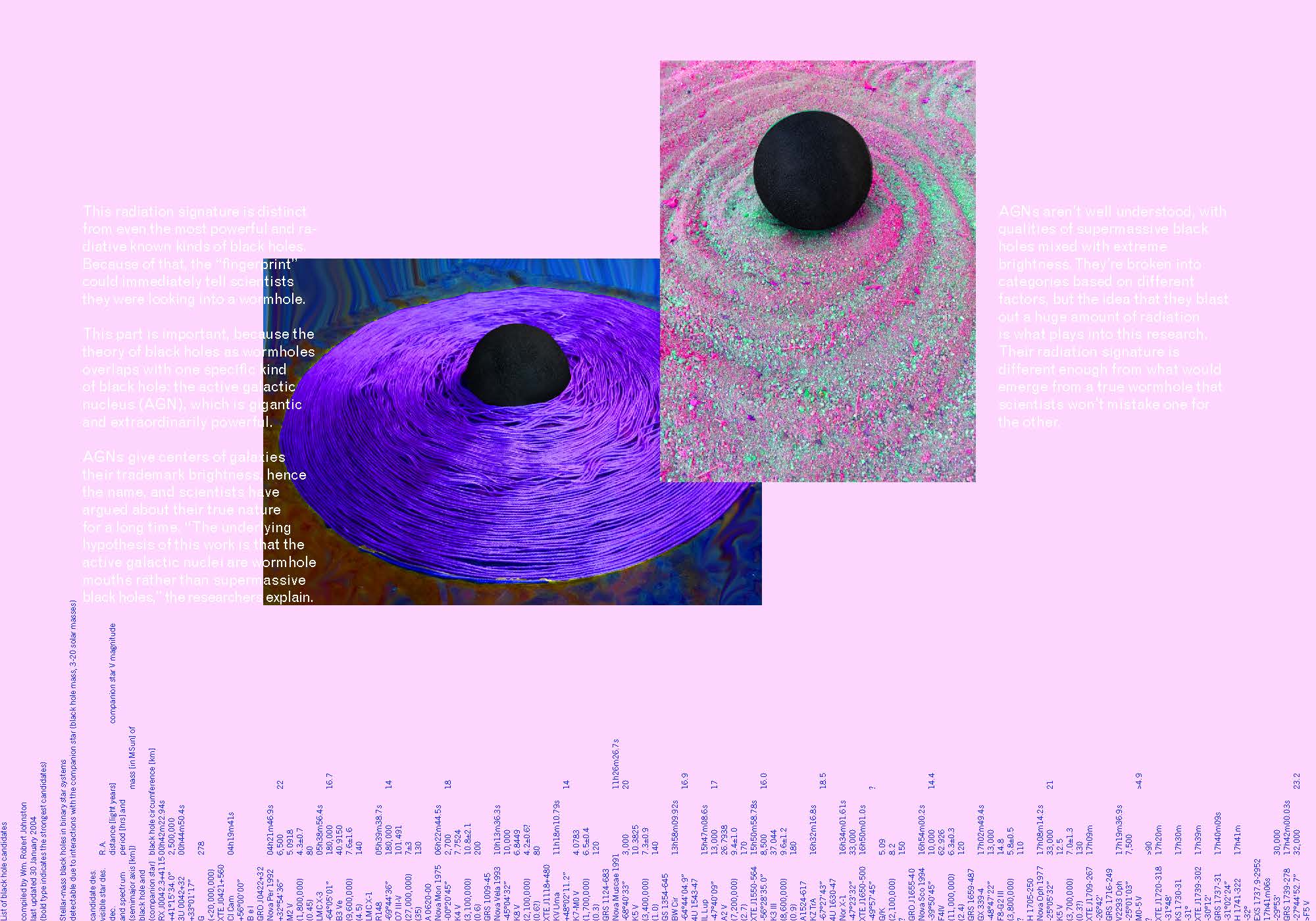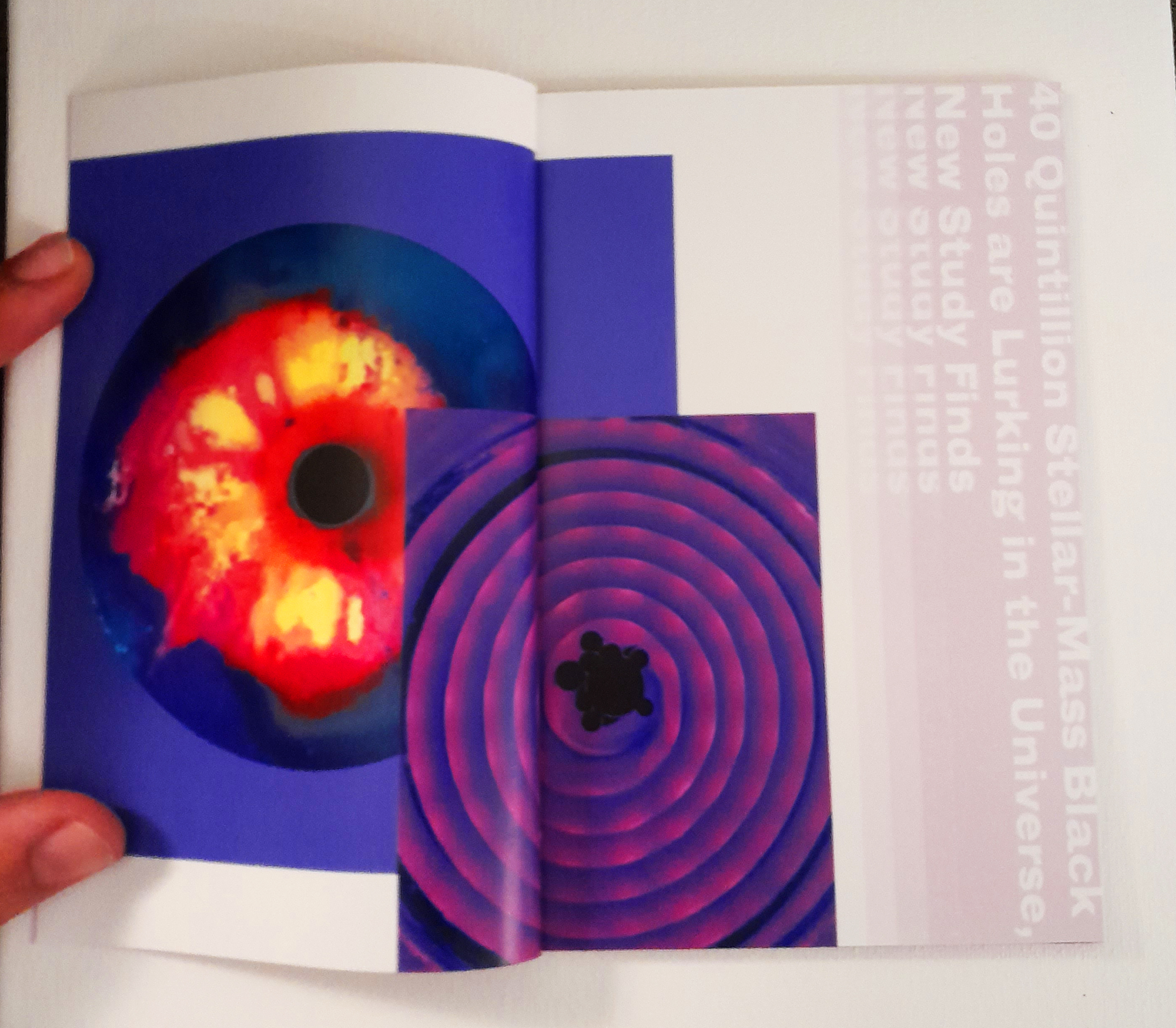 This project was a zine designed promoting an artist chosen from a provided list, in combination with a chosen unrelated subject. I chose the artist Kenneth Anger and chose to highlight his work with the contrasting subject of black holes. I bound the book in the Japanese book binding style using white wax coated thread.
