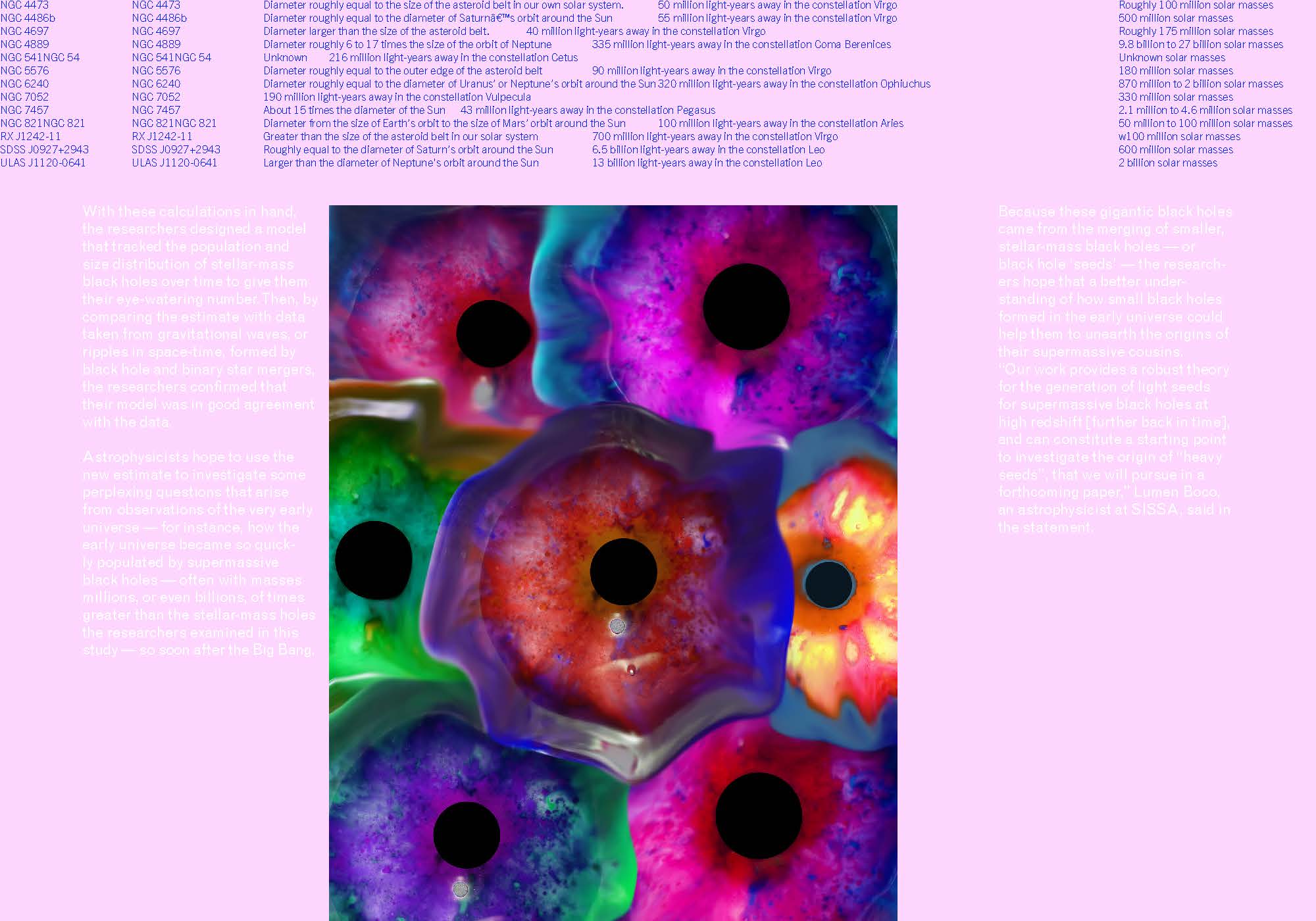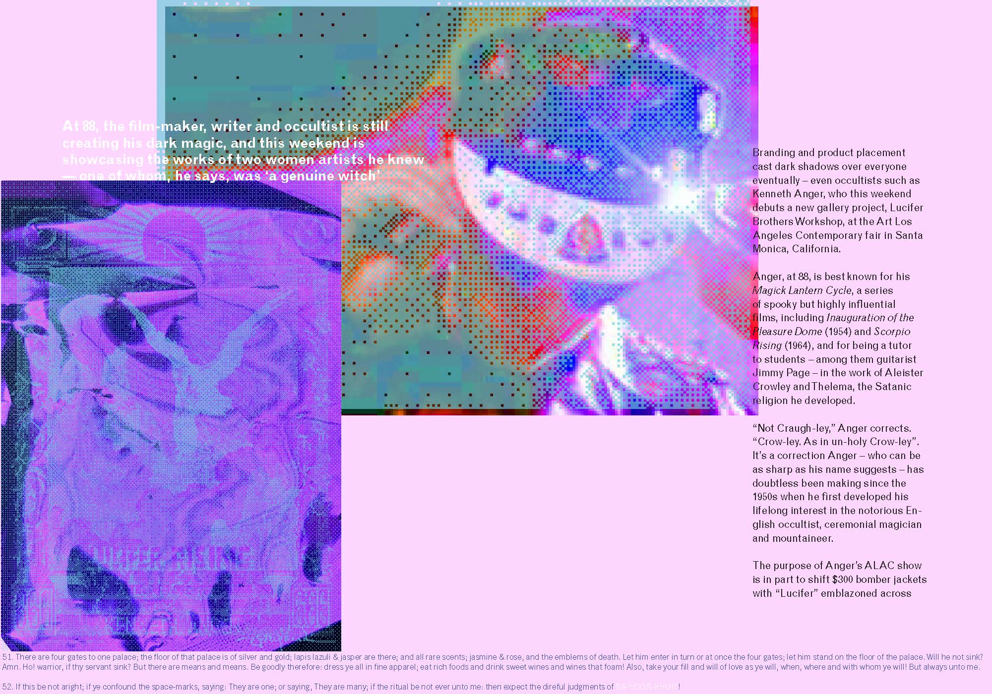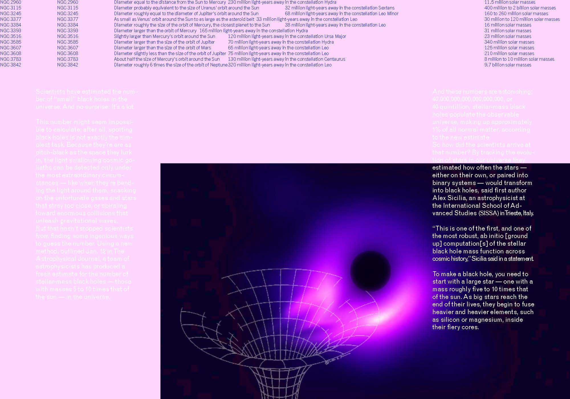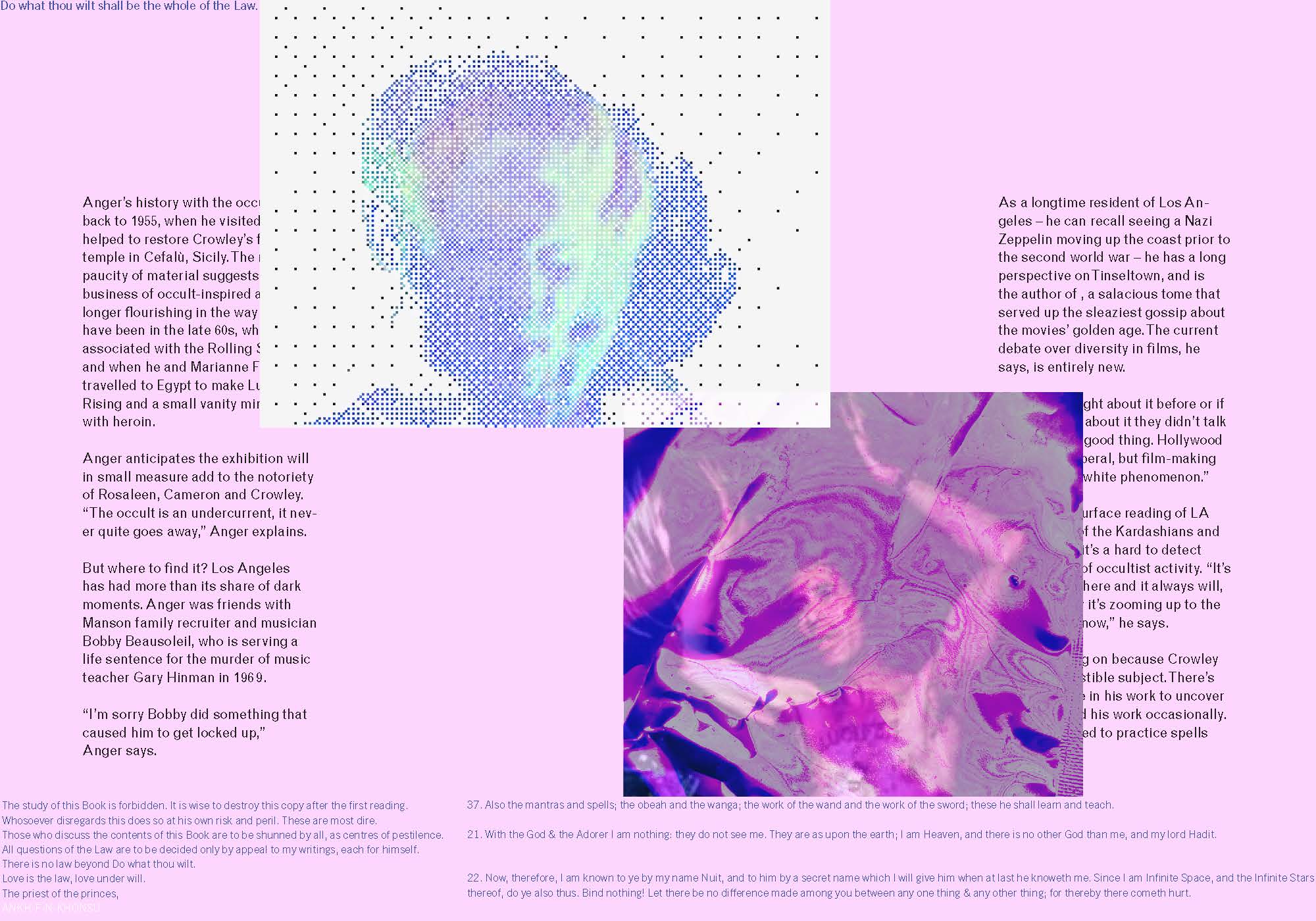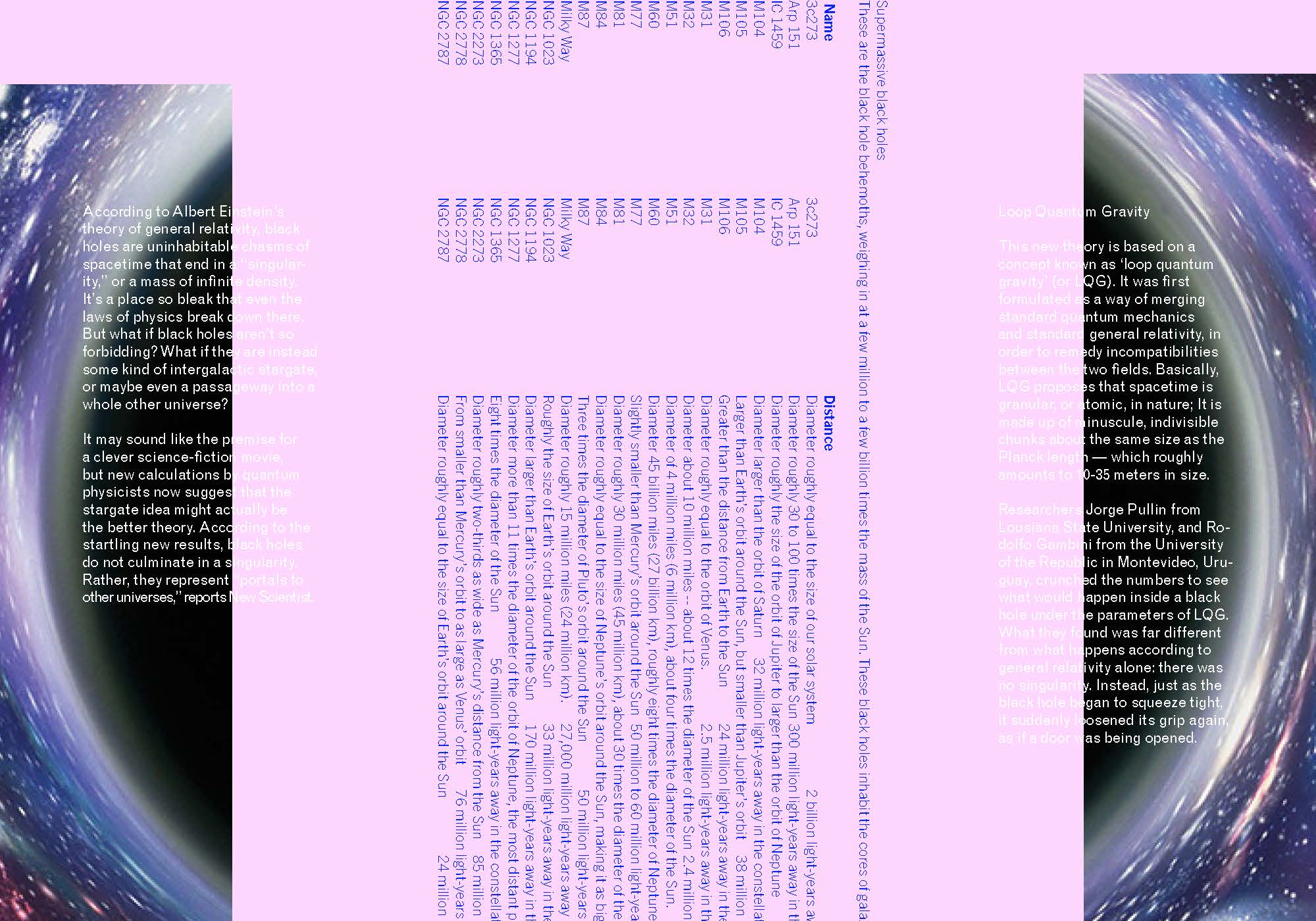 This project was a zine designed promoting an artist chosen from a provided list, in combination with a chosen unrelated subject. I chose the artist Kenneth Anger and chose to highlight his work with the contrasting subject of black holes. I bound the book in the Japanese book binding style using white wax coated thread.