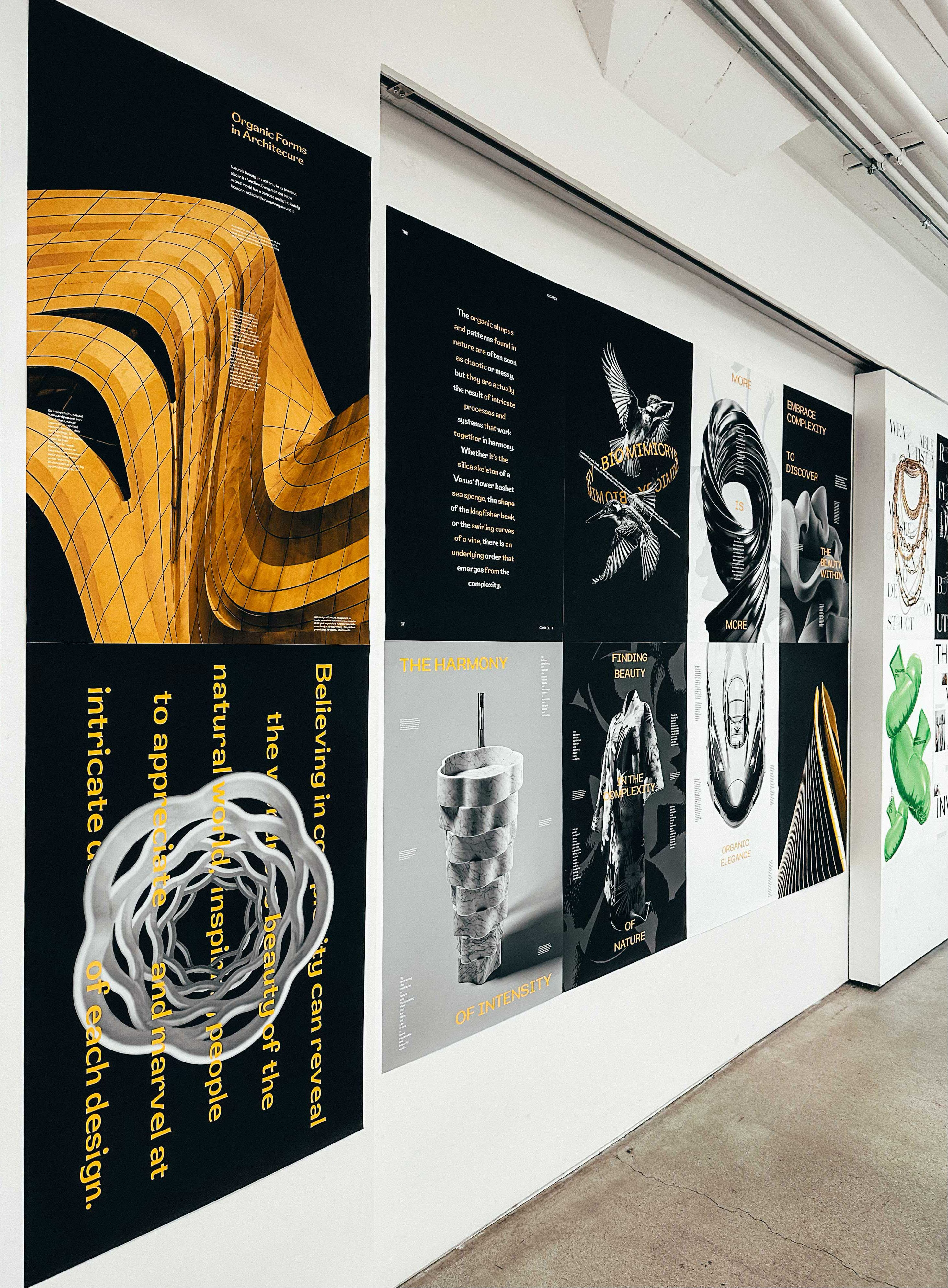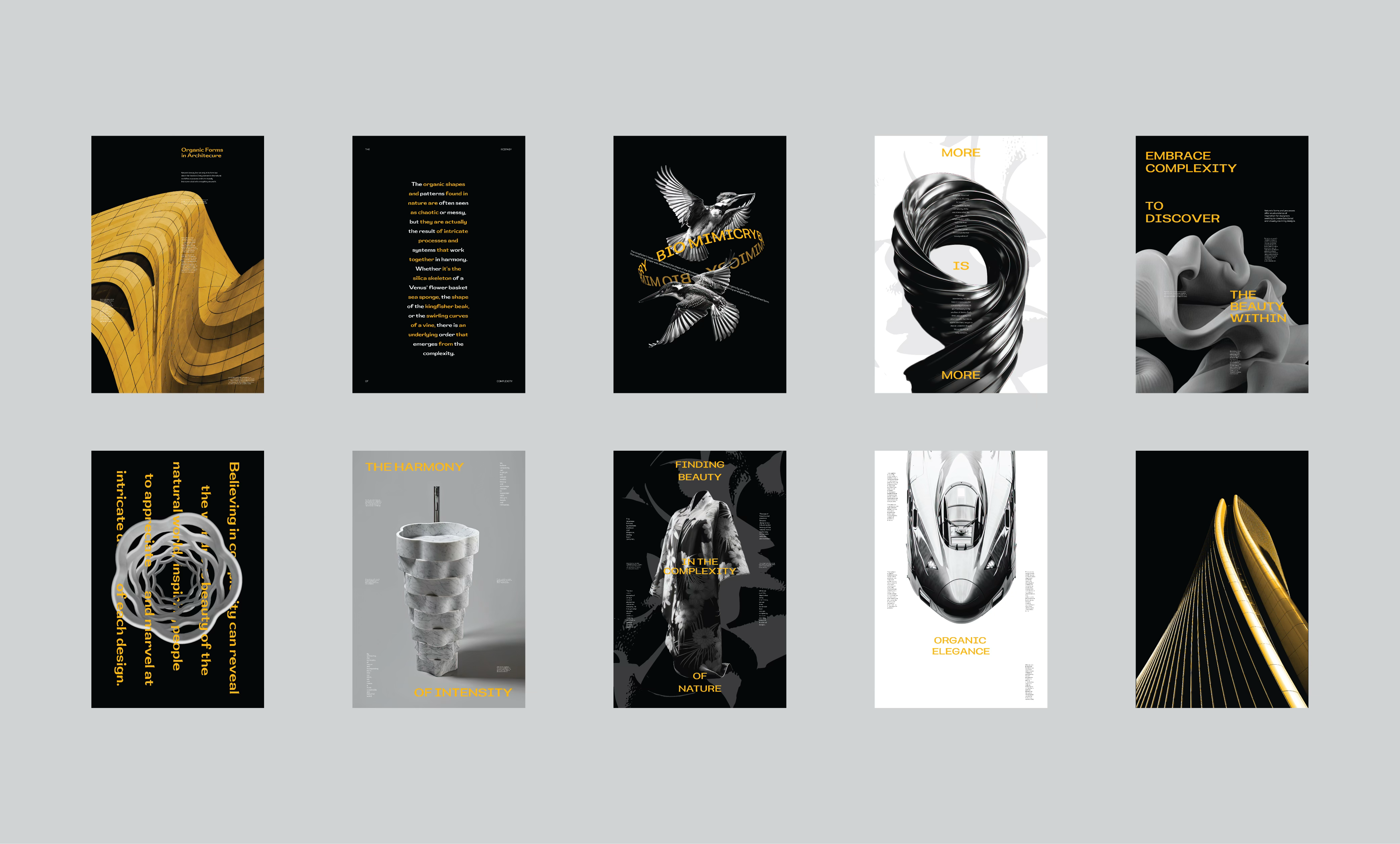 The art of Biomimicry highlights the importance of gaining insights from nature rather than exploiting, harvesting, or domesticating it. Through this approach, we understand ourselves, our purpose, and our interconnectedness with each other and our home on earth. This typographic narrative poster series aims to show the potential of utilizing nature to shape everyday items, like architecture, transportation, and fashion, focusing on reducing waste and minimizing environmental impact.
