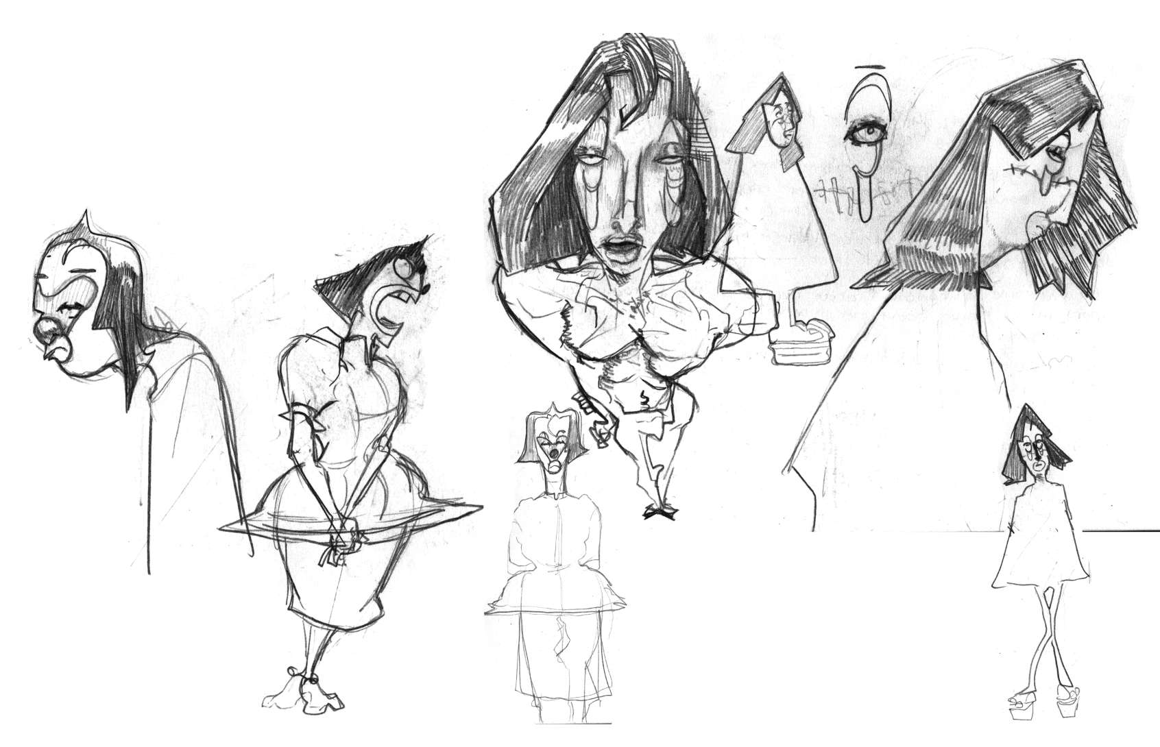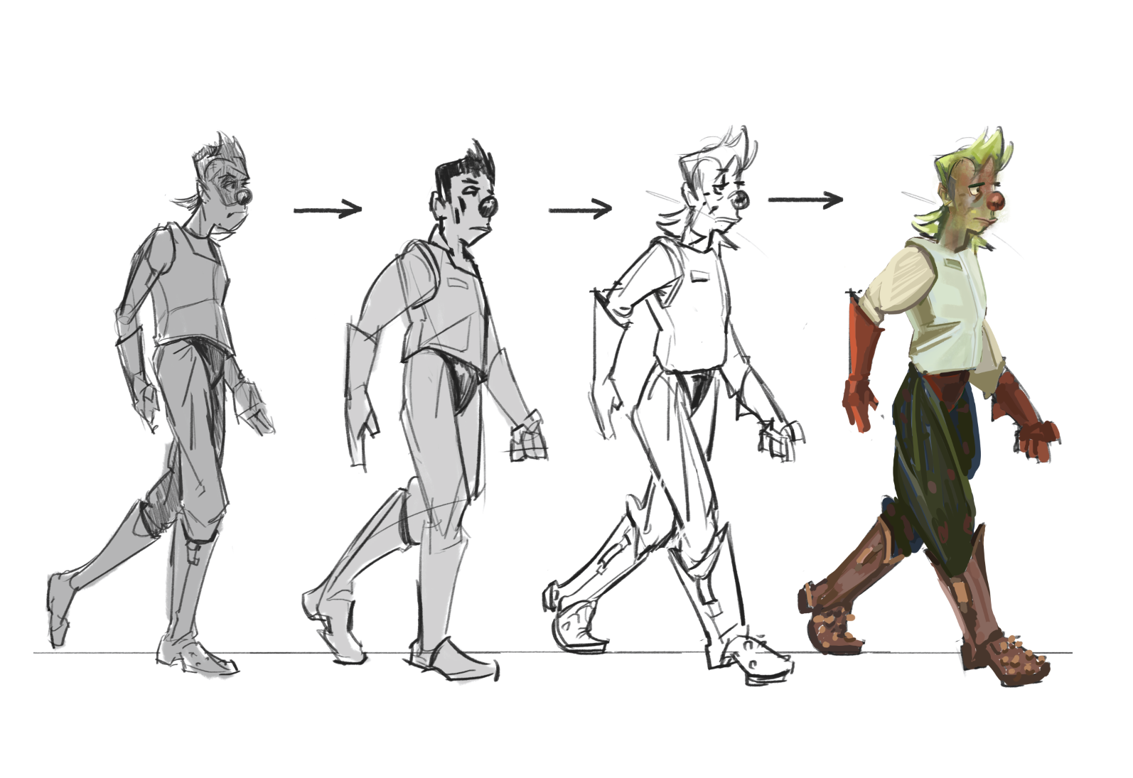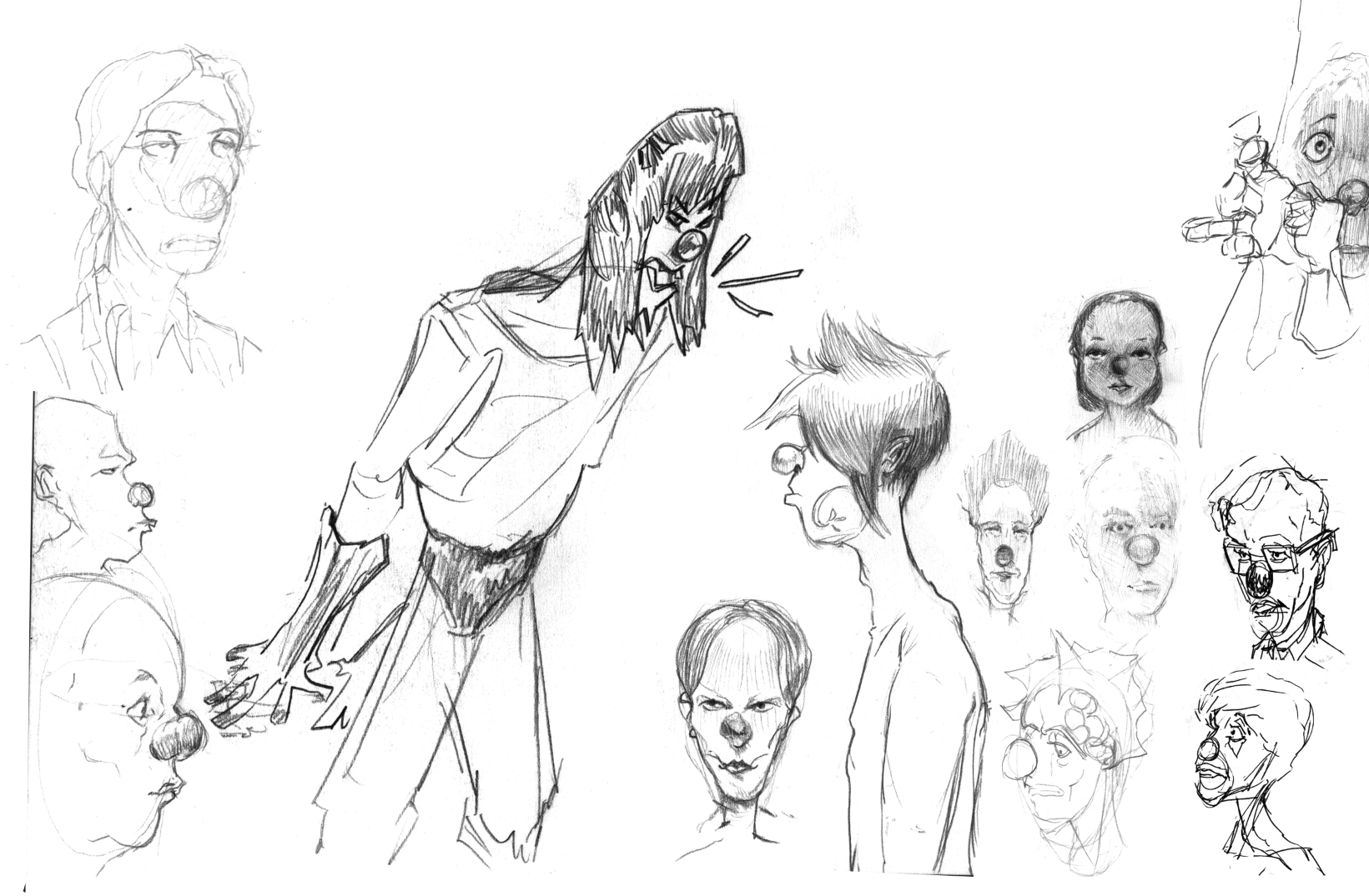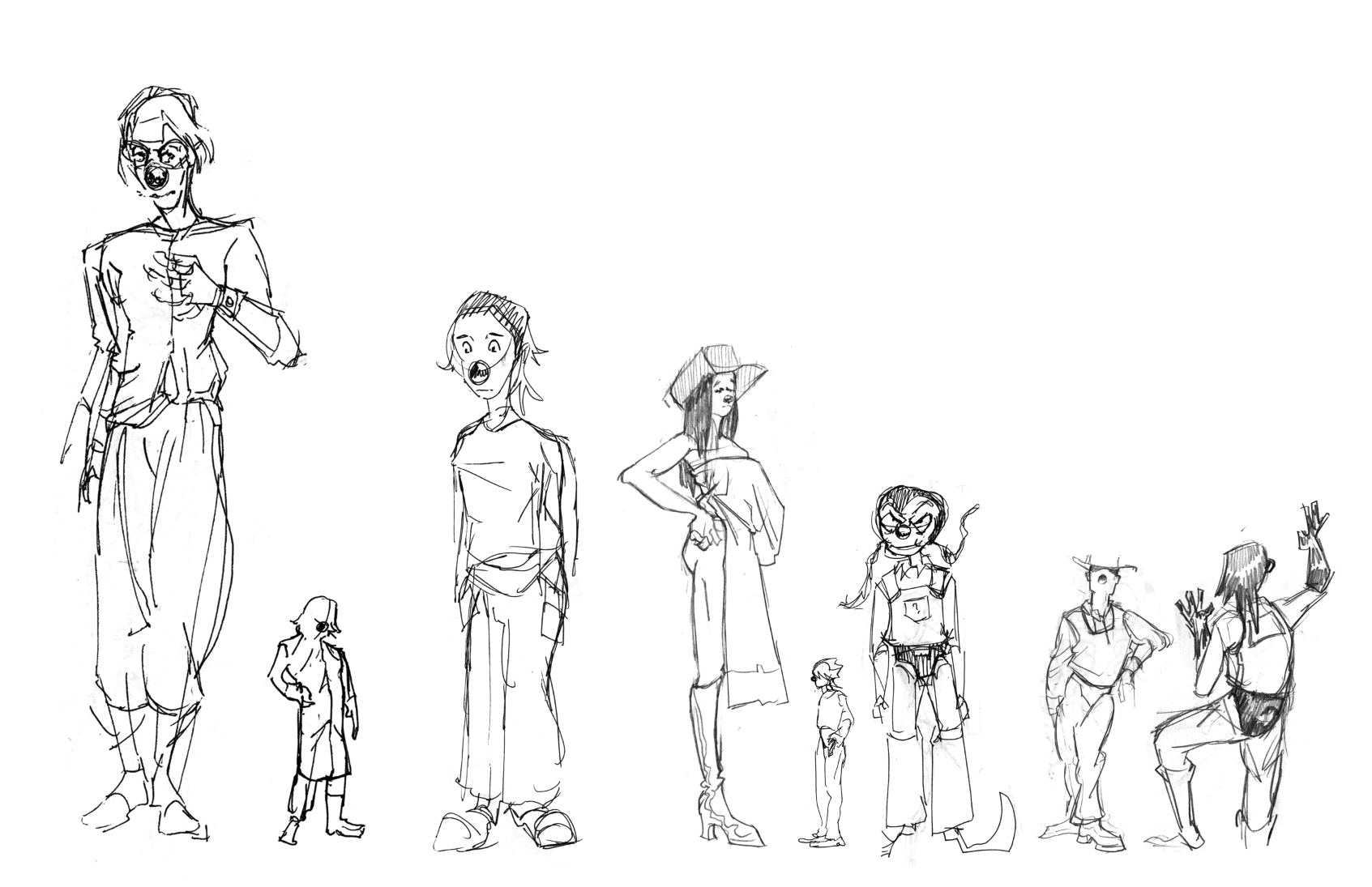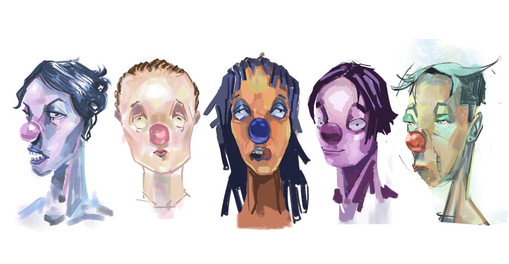 An assortment of Clown people designs and drawings from the Bronco: Runaway Star universe.