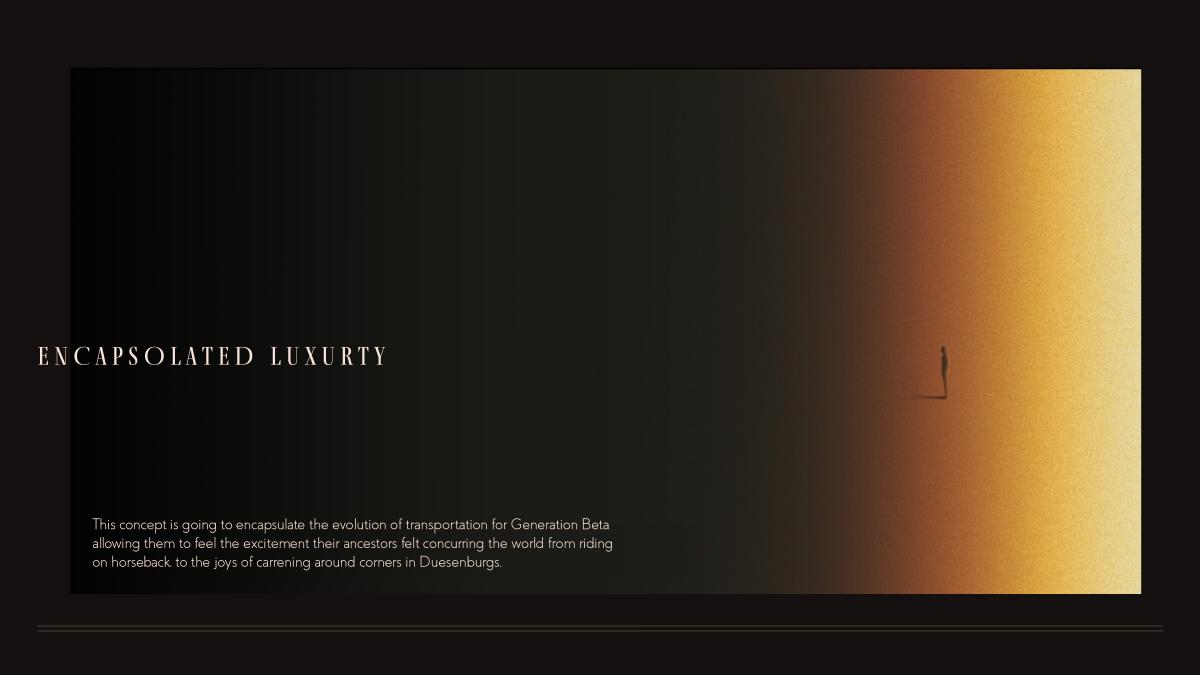 During an exterior design internship at Genesis, I created a HALO vehicle for the luxury brand. I dove into the company's history, looked at future generations and how they would view luxury, and created my Encapsulated Luxury Halo Vehicle for Genesis.