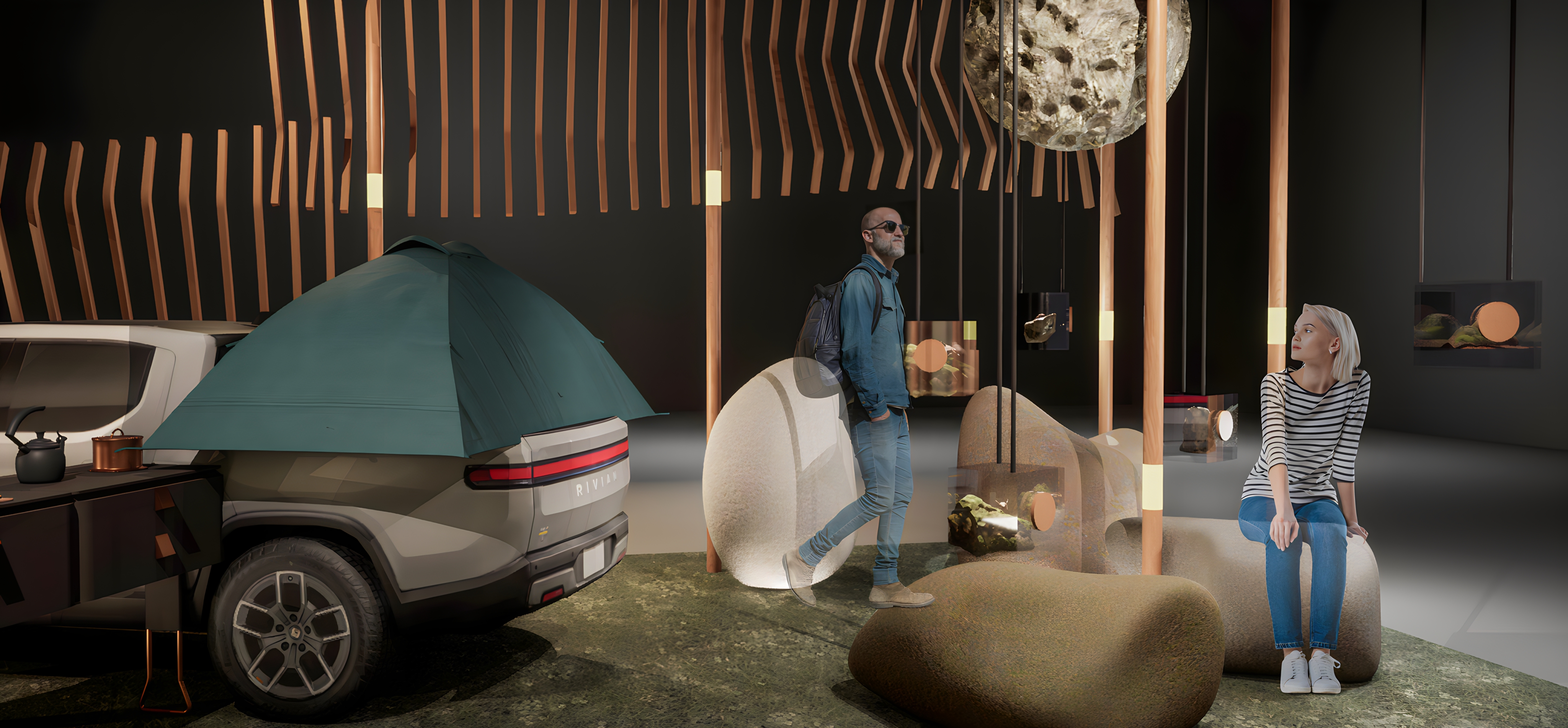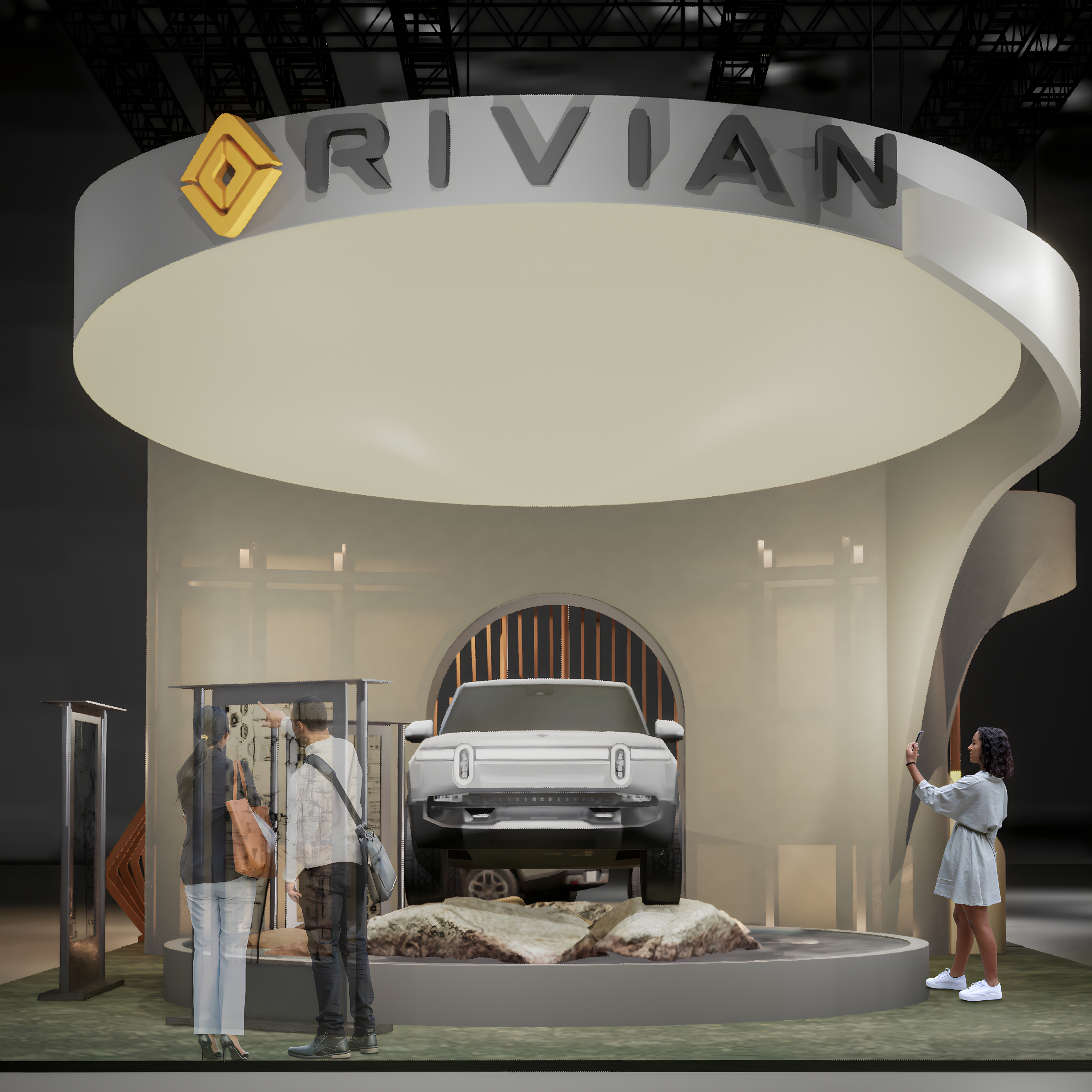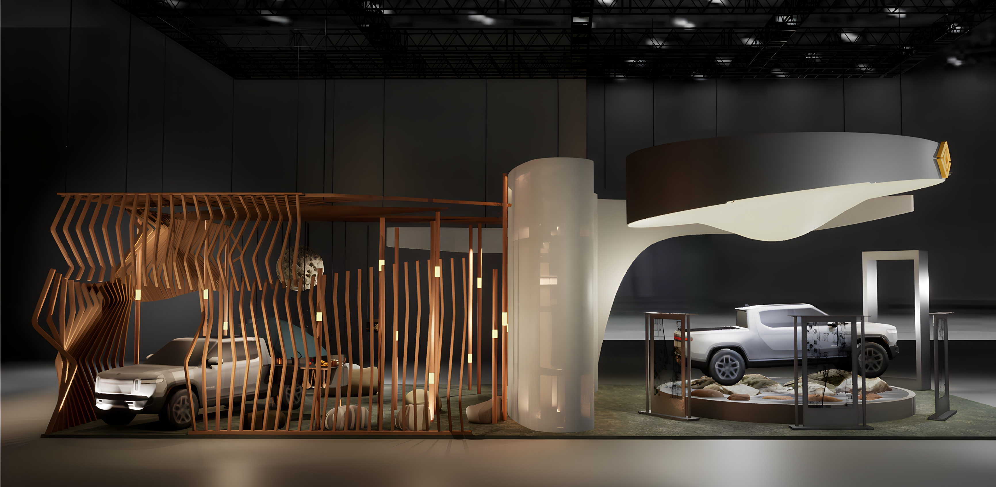 The Rivian auto show will prominently feature Rivian’s lauch vehicles, the R1T and R1S, by targeting both individuals and industries. The overall design incorporated recycled materials, immersive and communal spaces, and engaging displays to create an open, thoughtful, and adventurous experience in line with the brand.