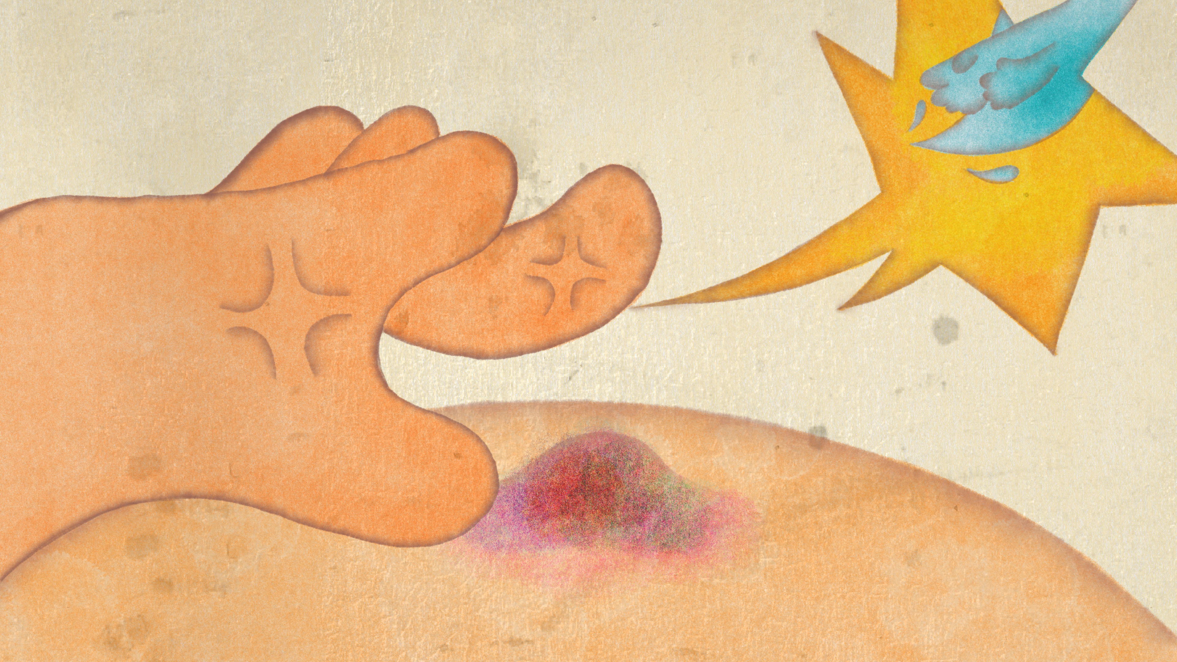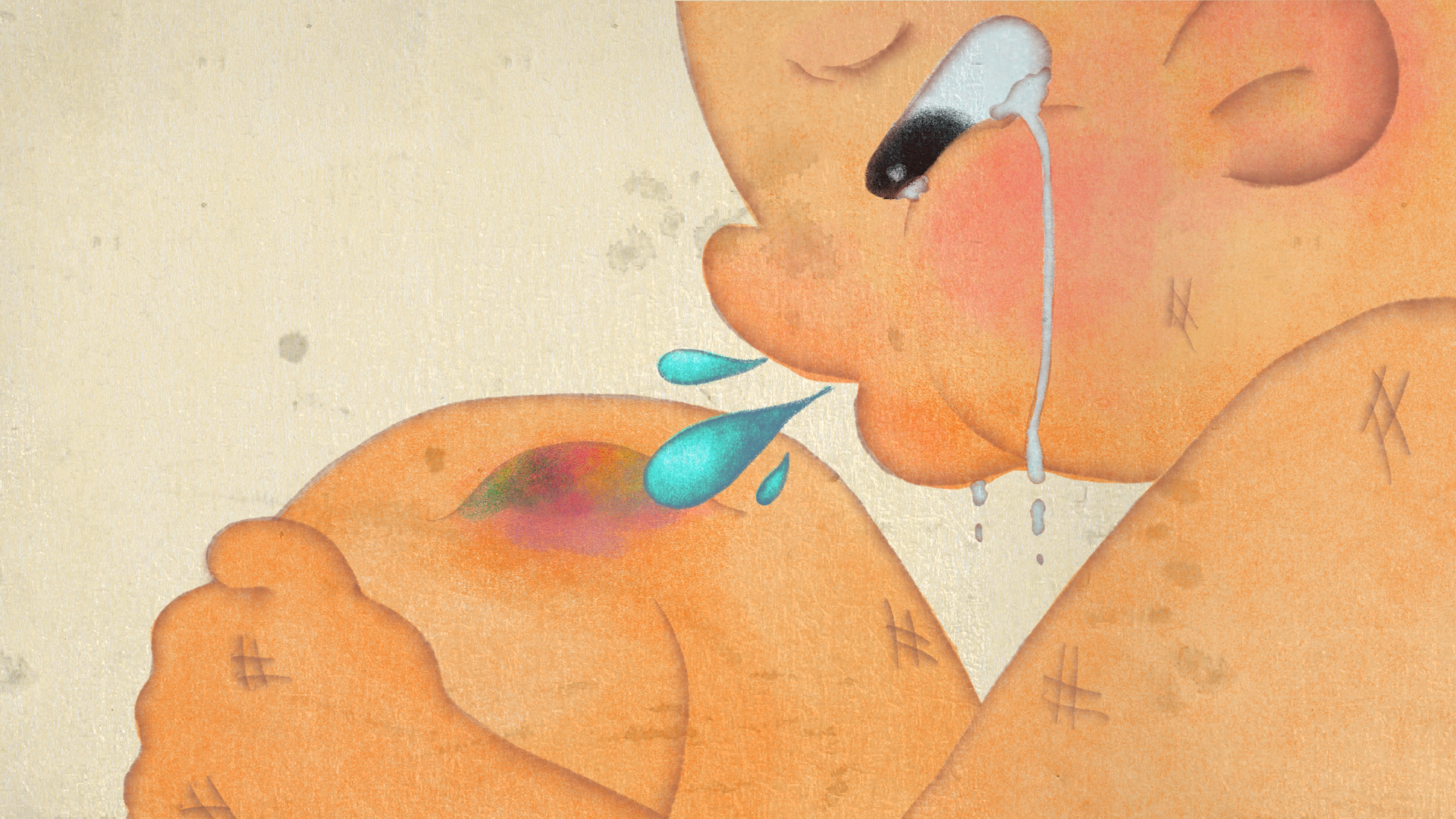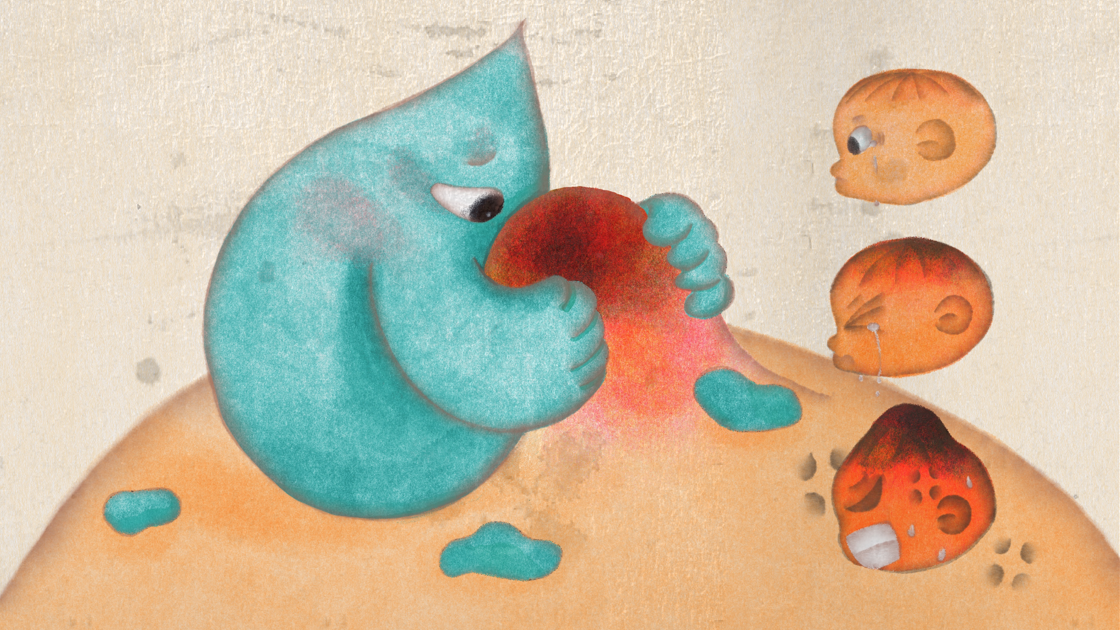 Originally, my character was just a generic kid, but I've learned that personality shines through their choices. To enhance the story, I personified the kid's spit into a friendly character that soothes the injury, highlighting how all stories are fundamentally about relationships.