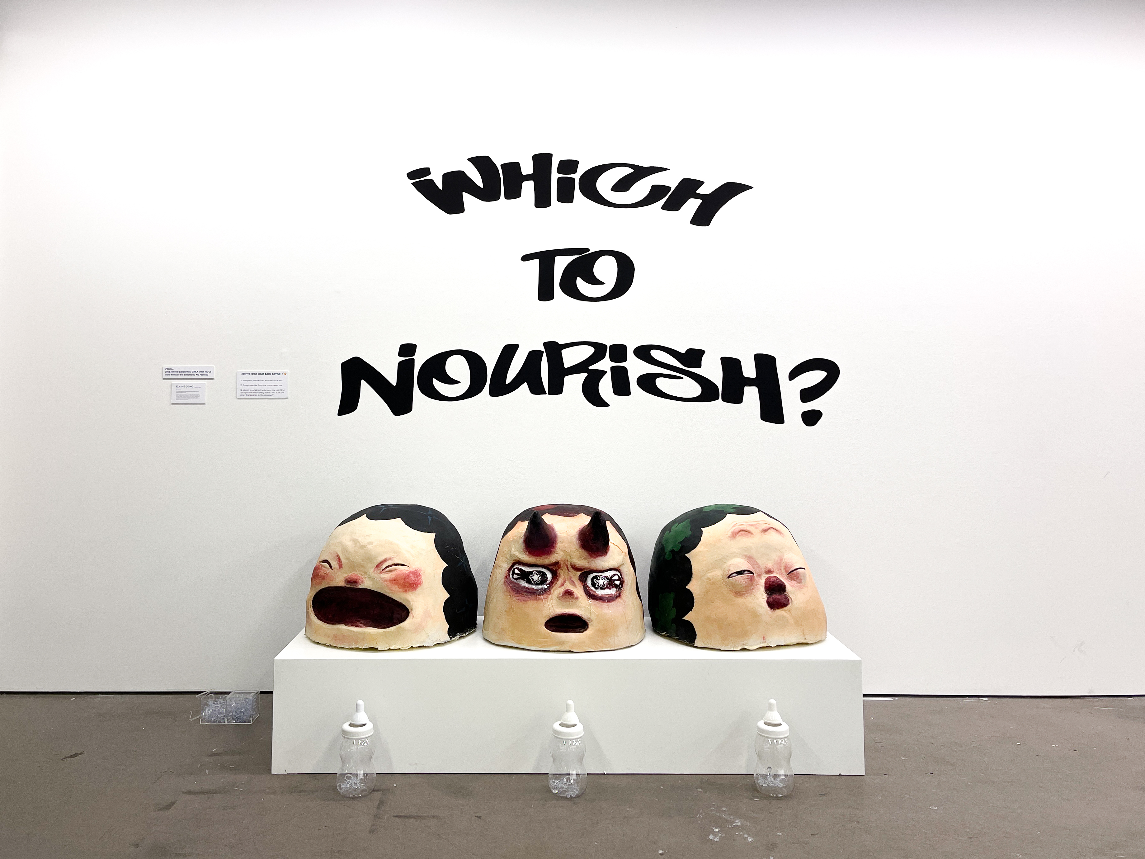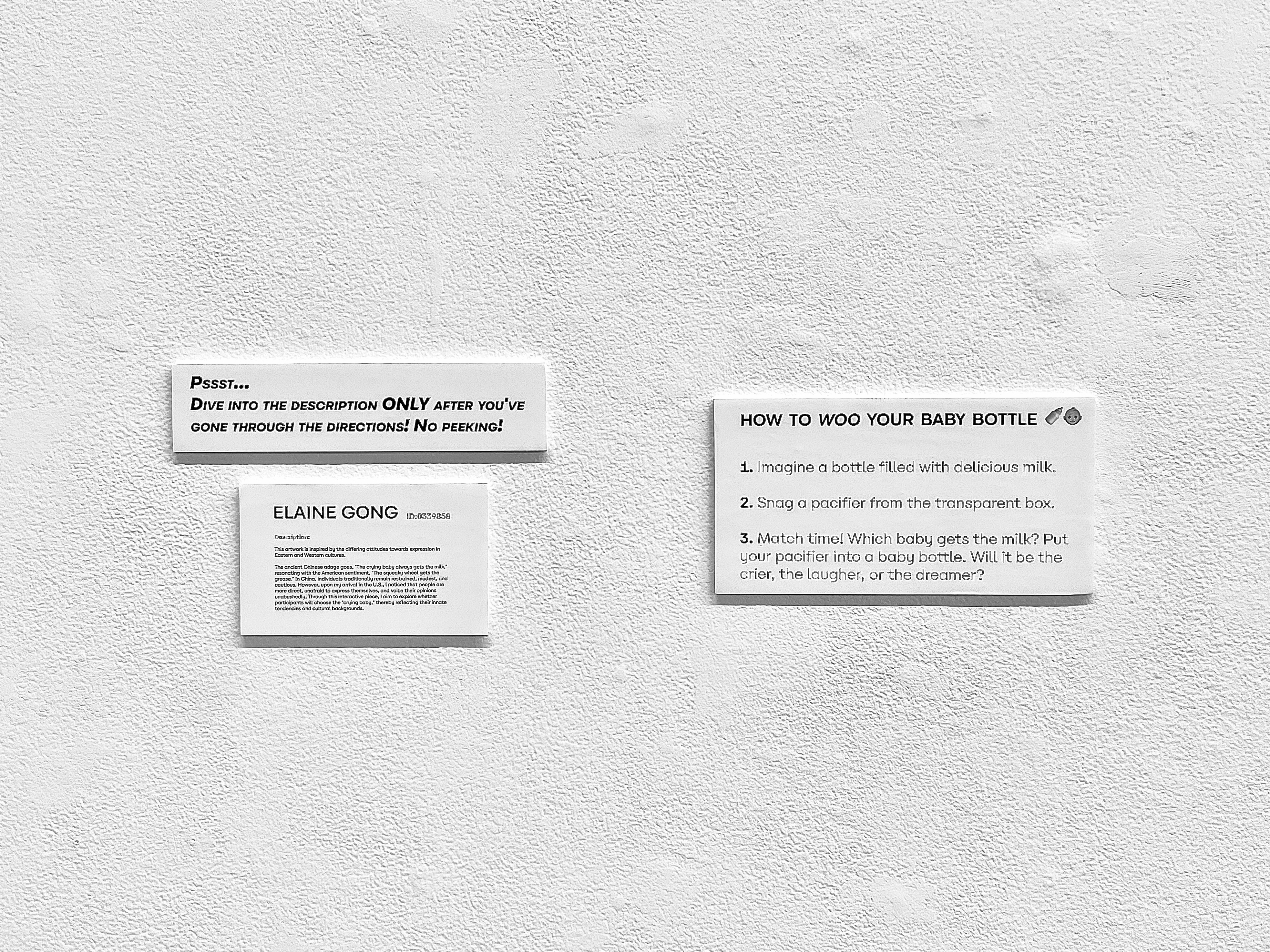 This interactive artwork contrasts Eastern and Western expression attitudes, inspired by the sayings "The crying baby gets the milk" and "The squeaky wheel gets the grease." Traditionally, Chinese culture values restraint, while Americans often embrace directness. This piece explores whether participants identify more with the crying baby, reflecting their cultural influences and innate tendencies.