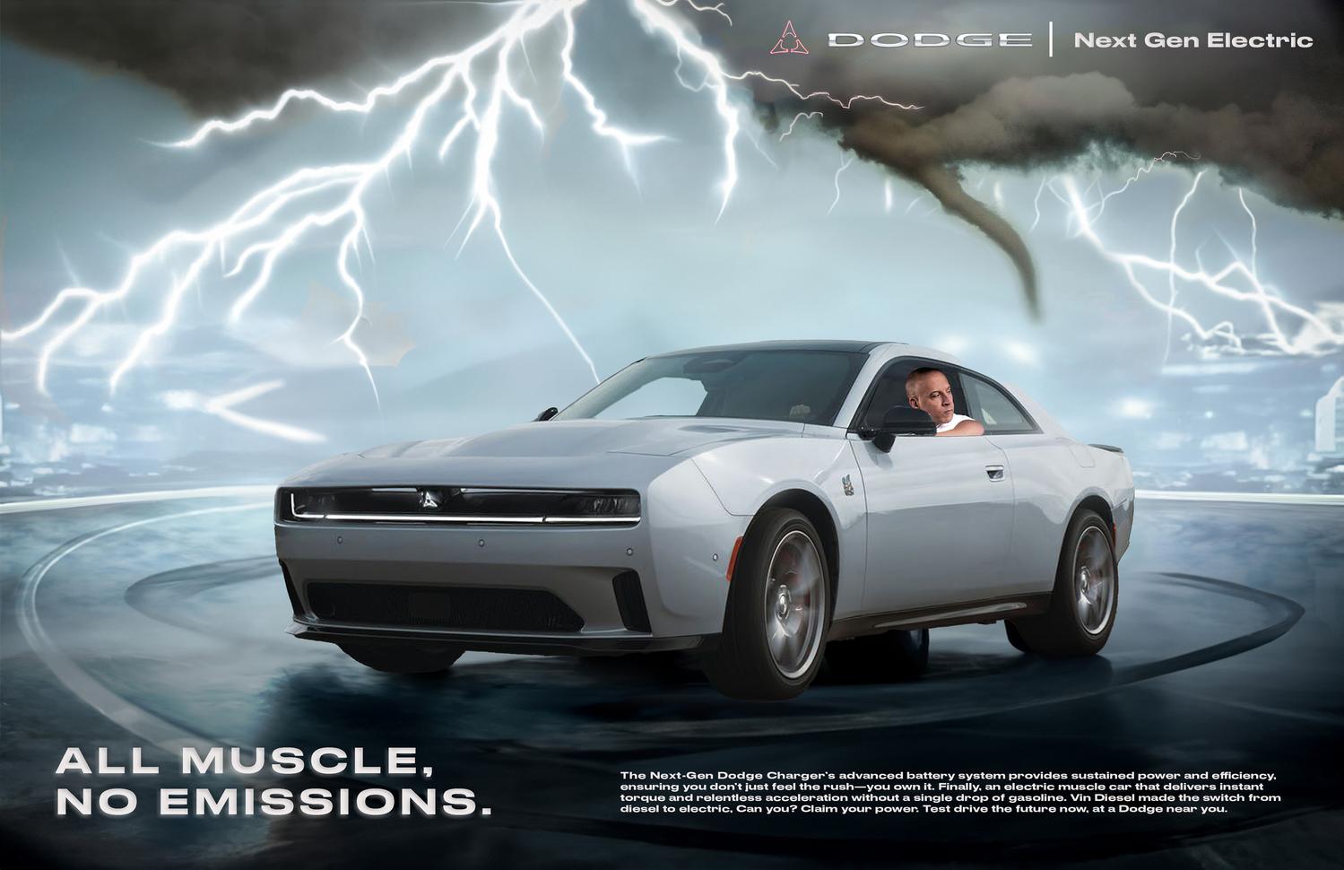 Vin Diesel changes his name to Vin Electric in promotion of the fully electric, Next-Gen Dodge Charger. Vin Electric, the king of action and muscle, proves that electric cars can also embody the raw power and masculinity traditionally associated with muscle cars.