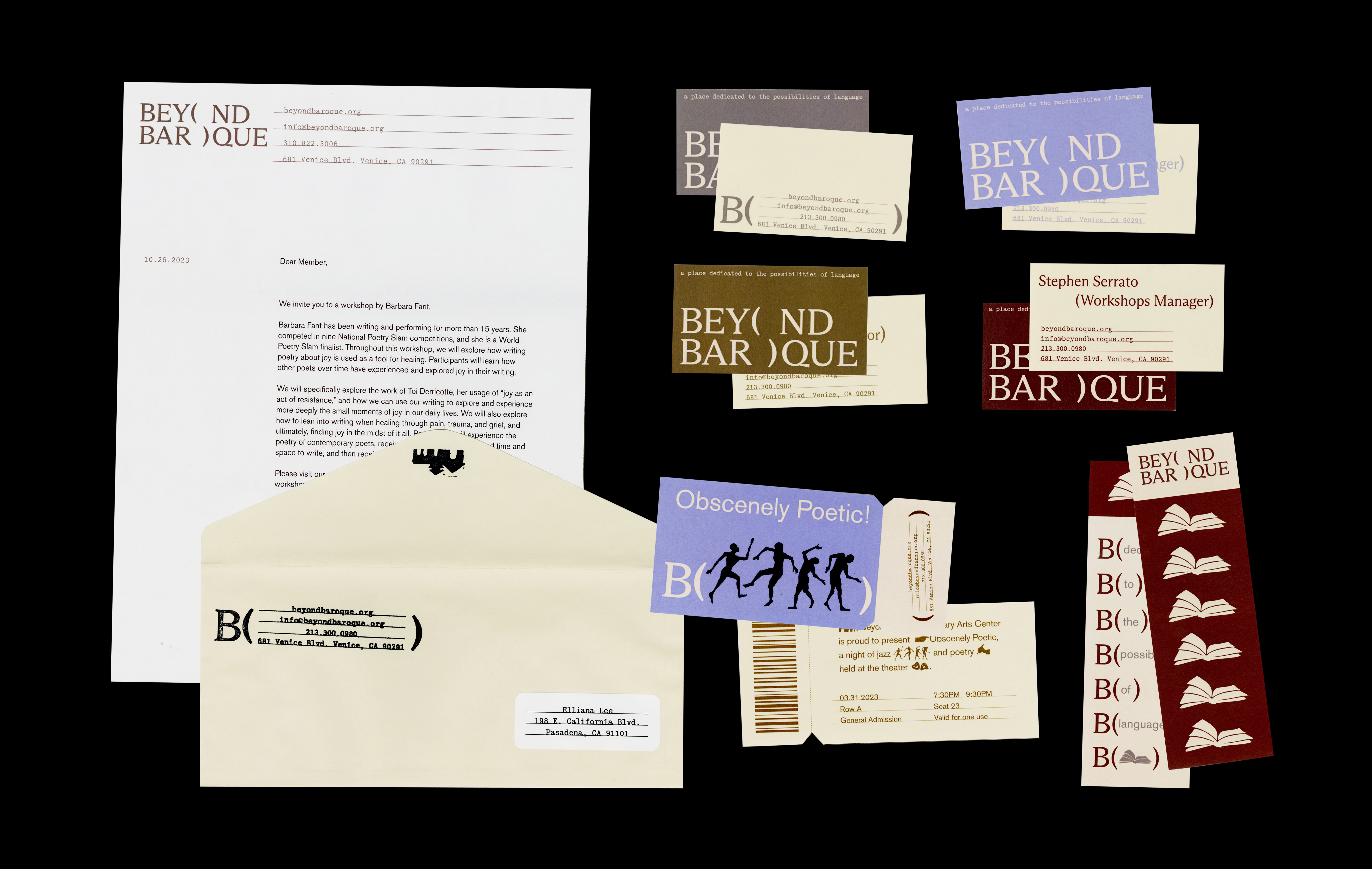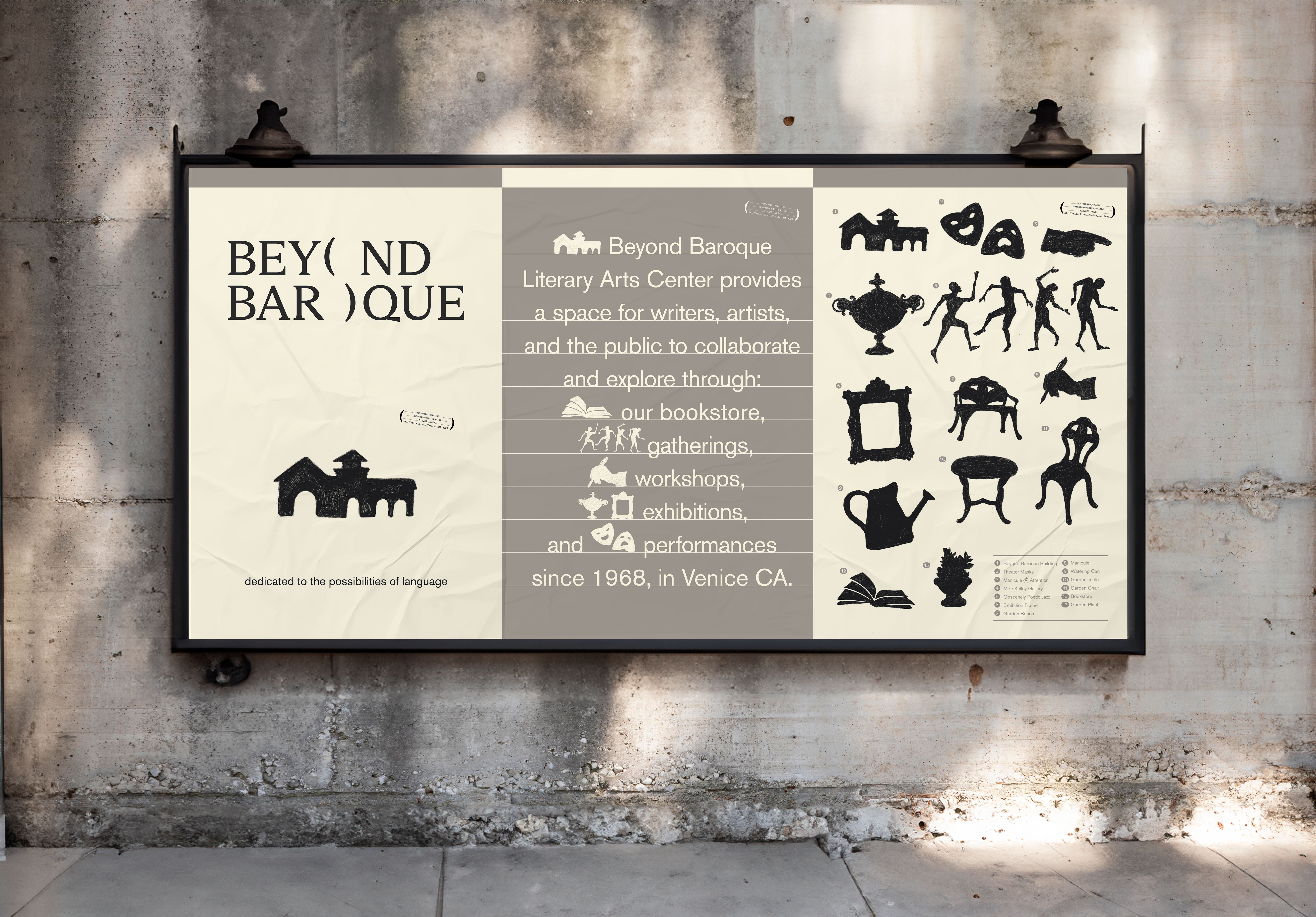 Beyond Baroque is a non-profit literary arts center in Venice, Los Angeles, dedicated to bridging writers, artists, and thinkers and fostering a space dedicated to discovering the possibilities of language. The mission for this rebrand comes from the organization to reach emerging artists and writers — revitalizing their presence whilst maintaining their roots in history.