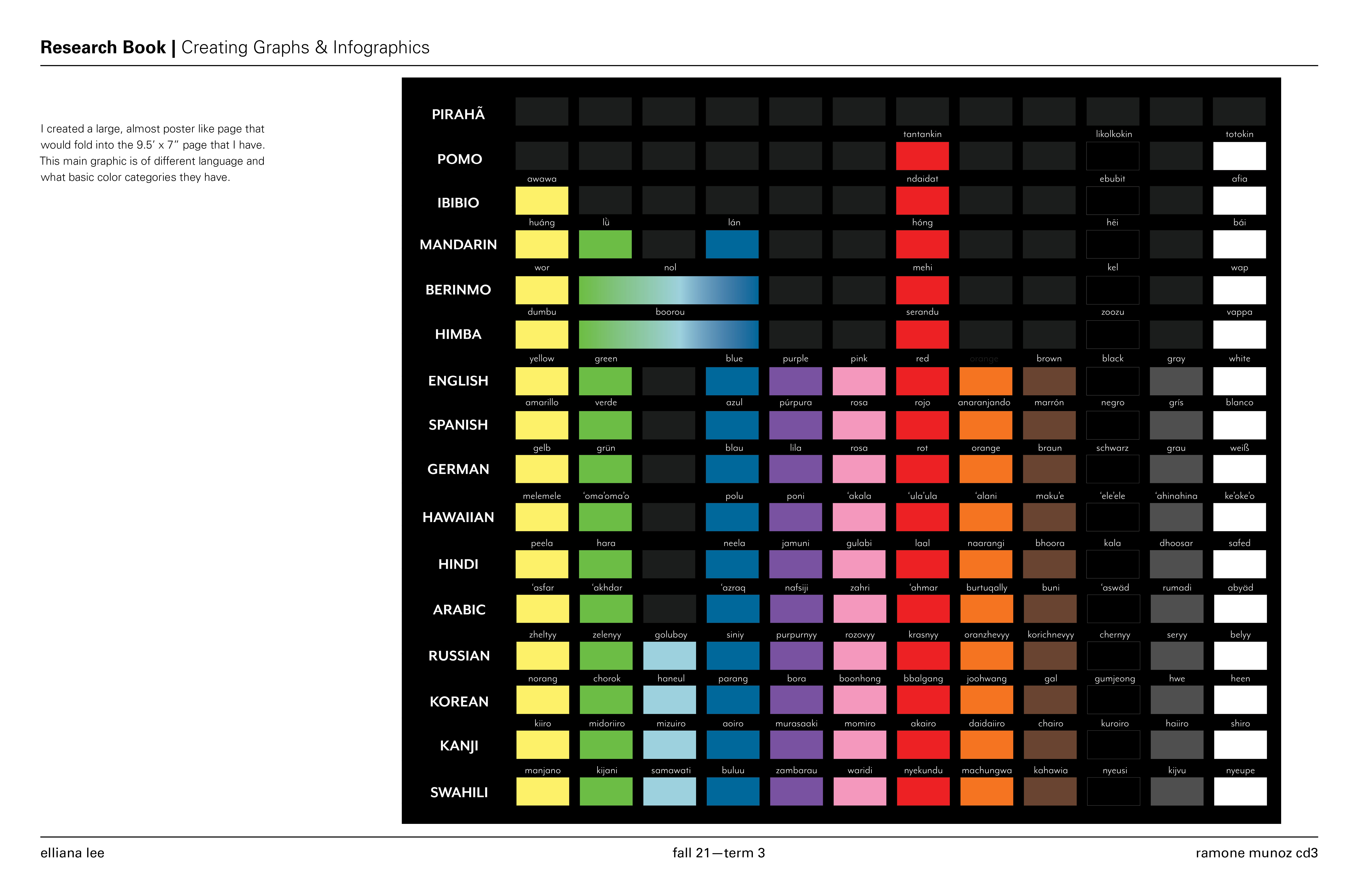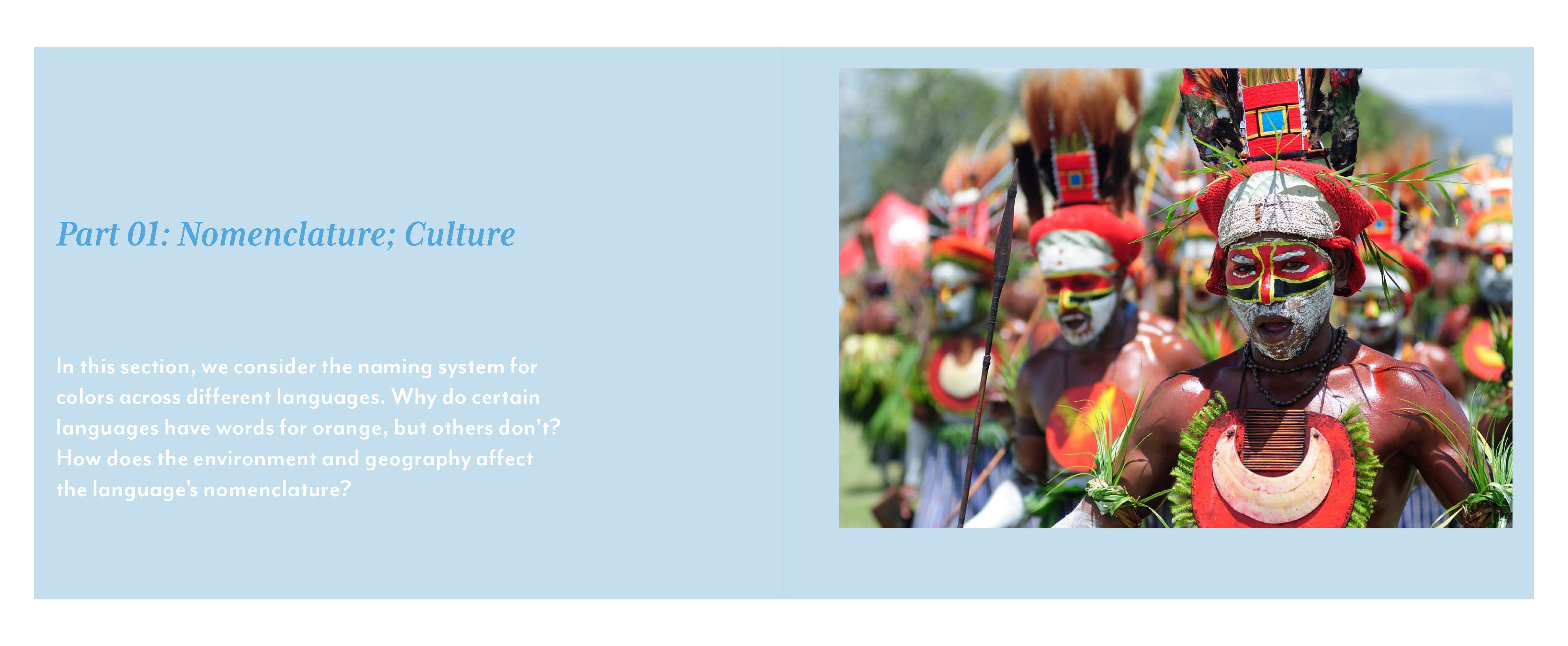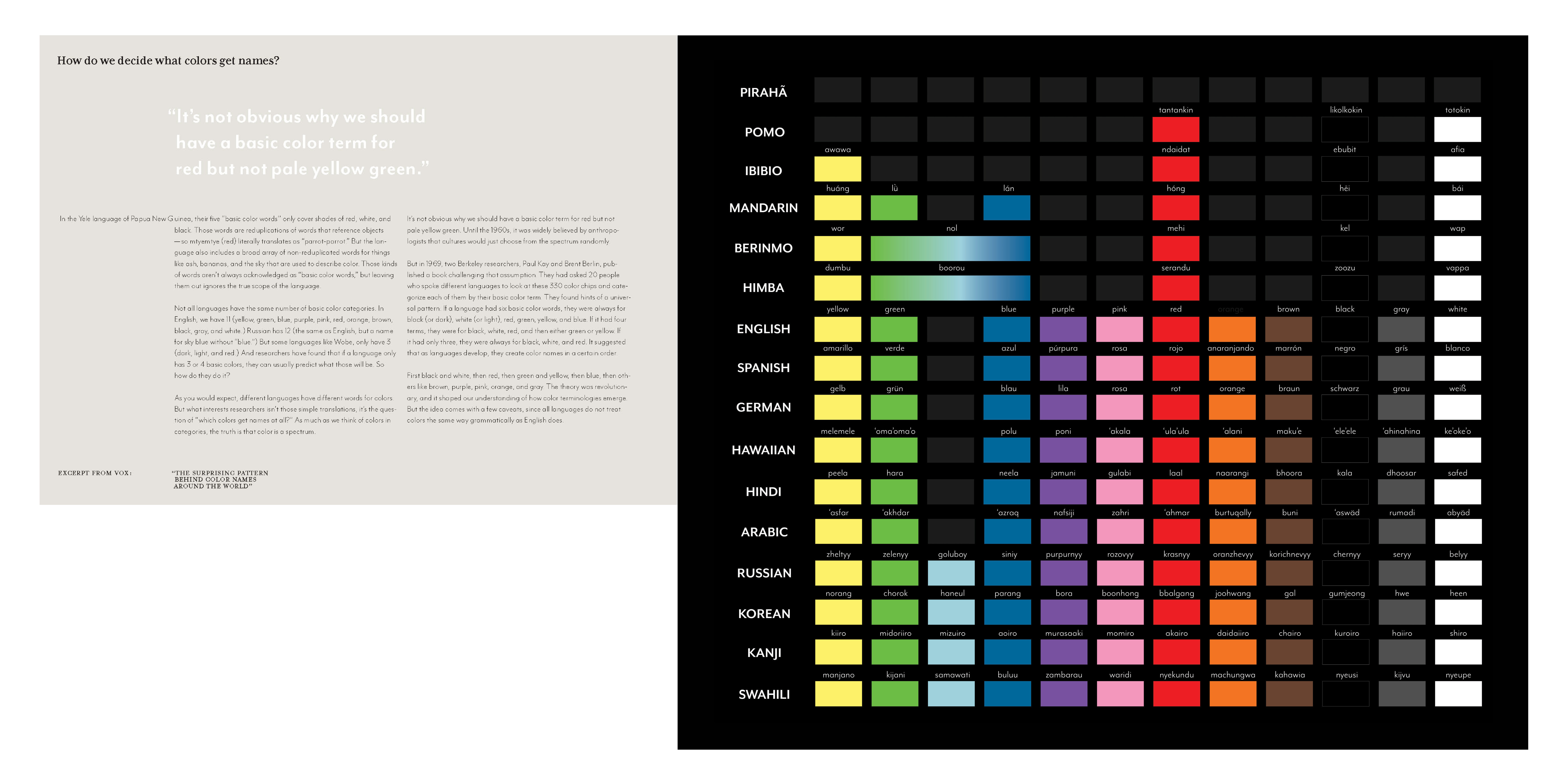 The graph shows what colors get names in languages. For example, the American language does not have a different word for "blue" and "sky blue," even though Russian does.