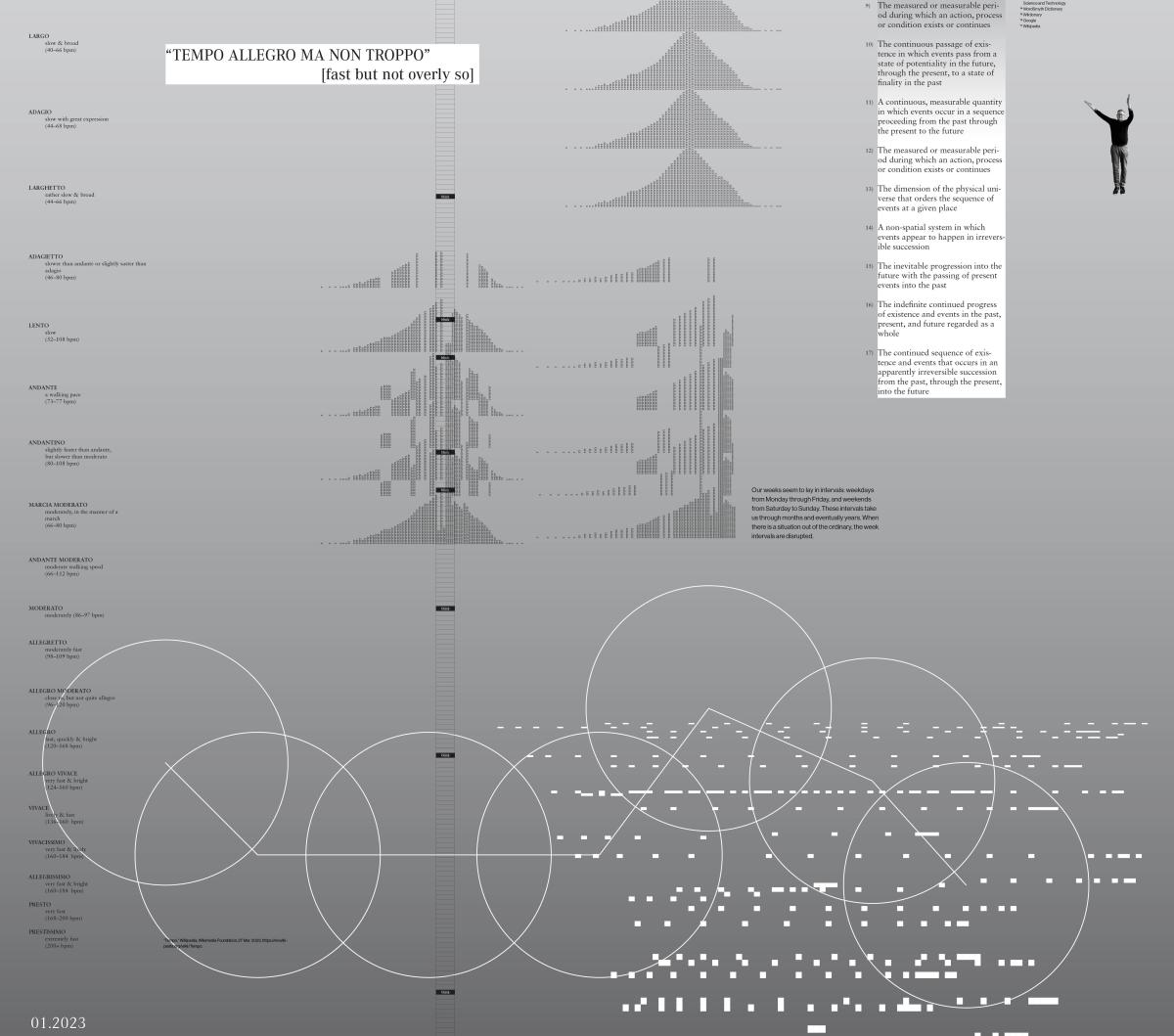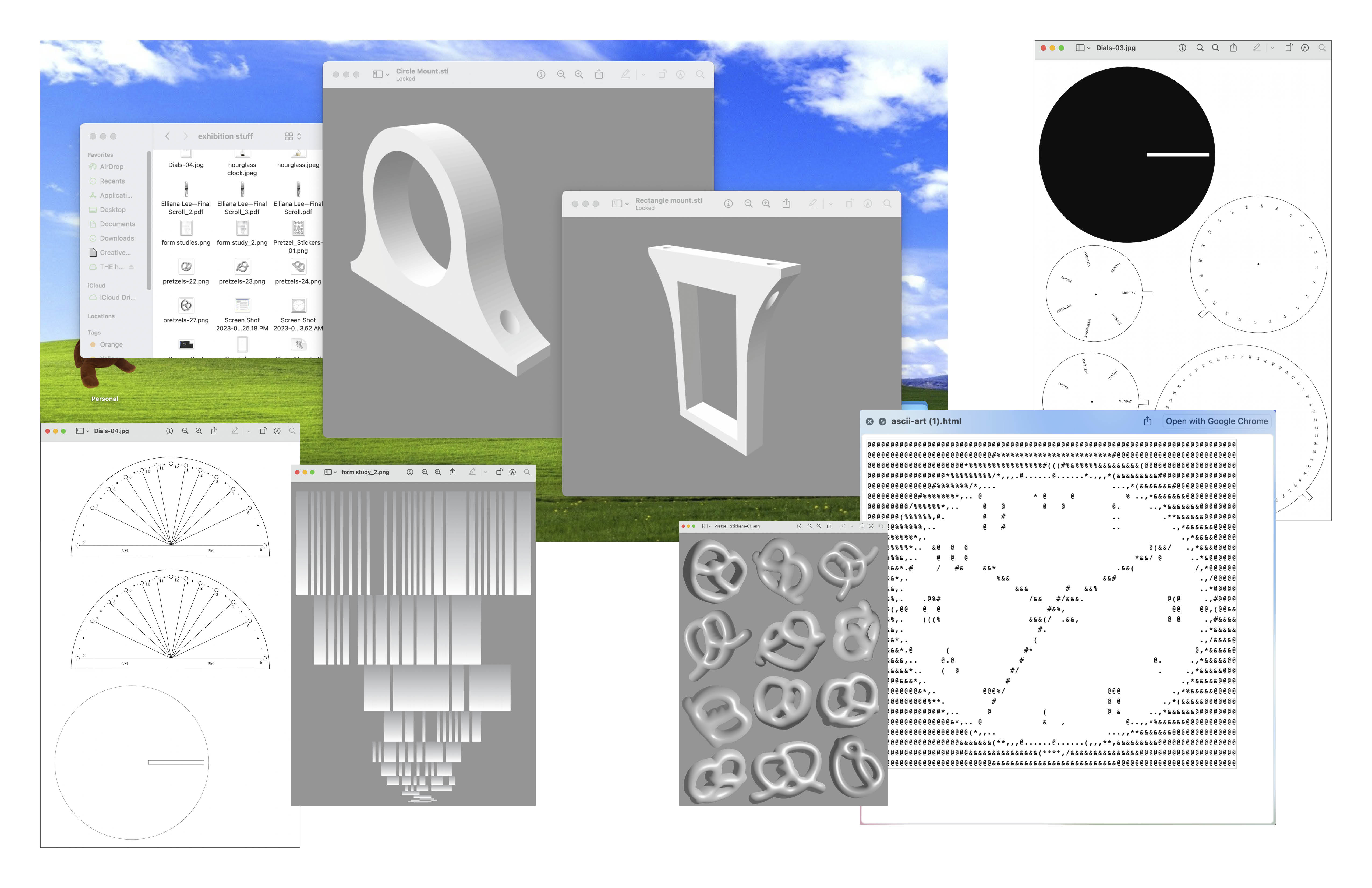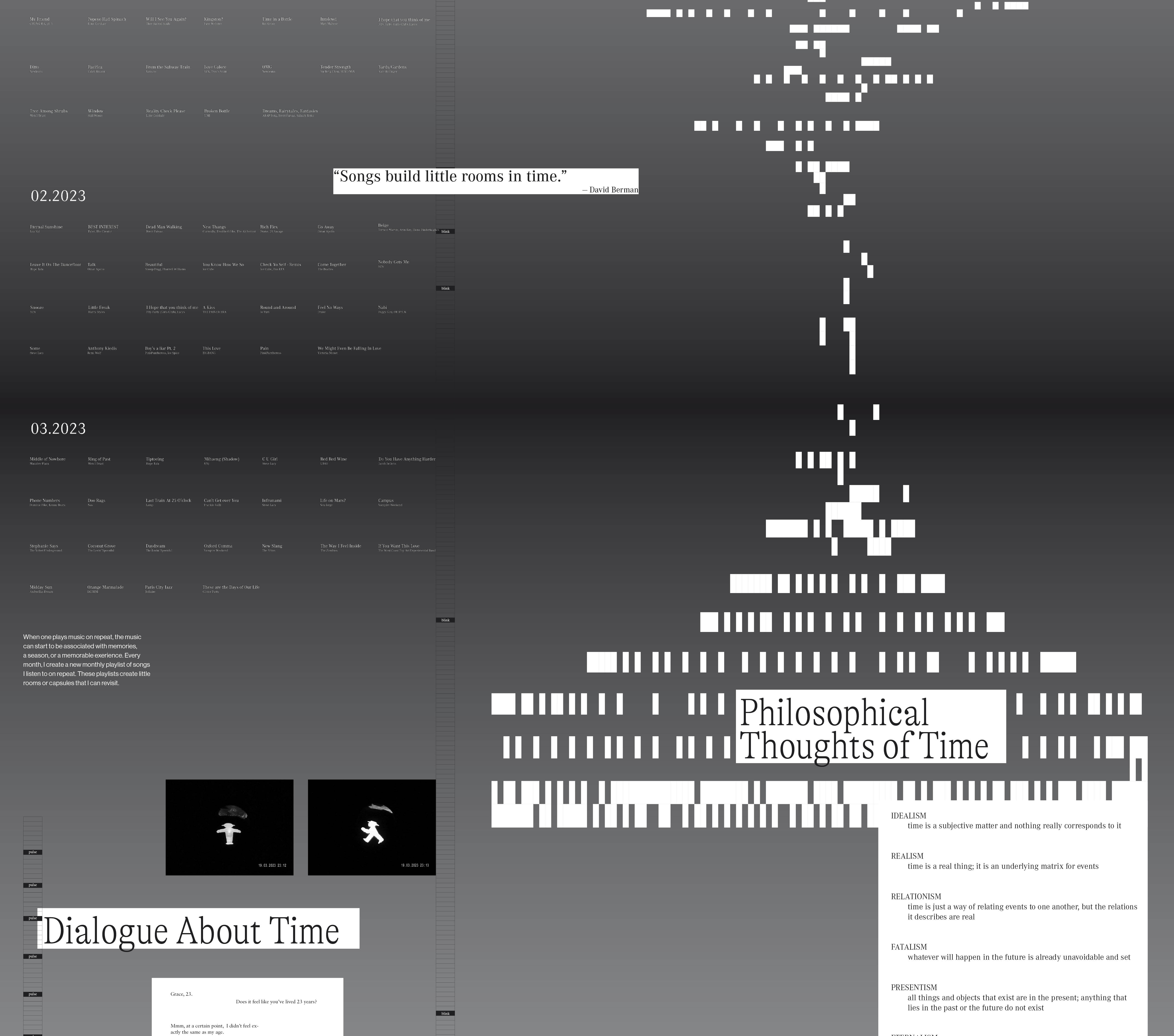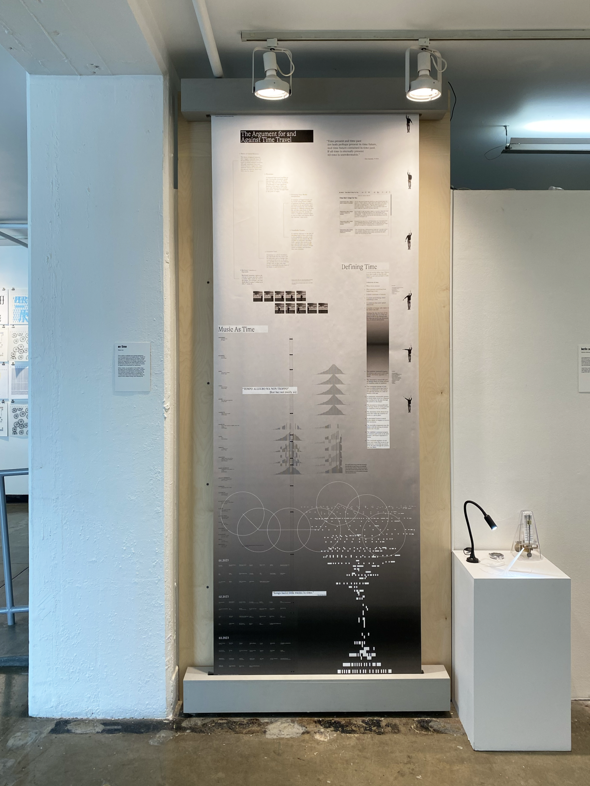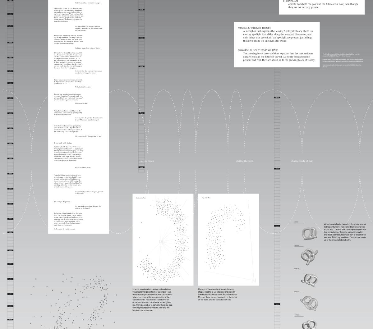 Time is both an individual and universal experience. It is seemingly present but tangibly absent. While in Berlin, my perception of time shifted: days felt longer and time seemed to slow down. This piece is the culmination of my research and visual experiments throughout my stay in Berlin. It is presented on a vertical scroll that moves continuously to reflect the nature of time: we can not seem to ever stop it or have it stand still for us.