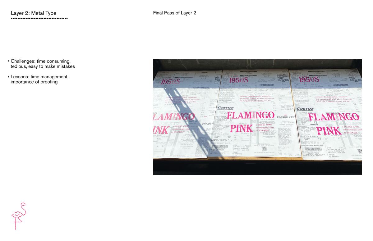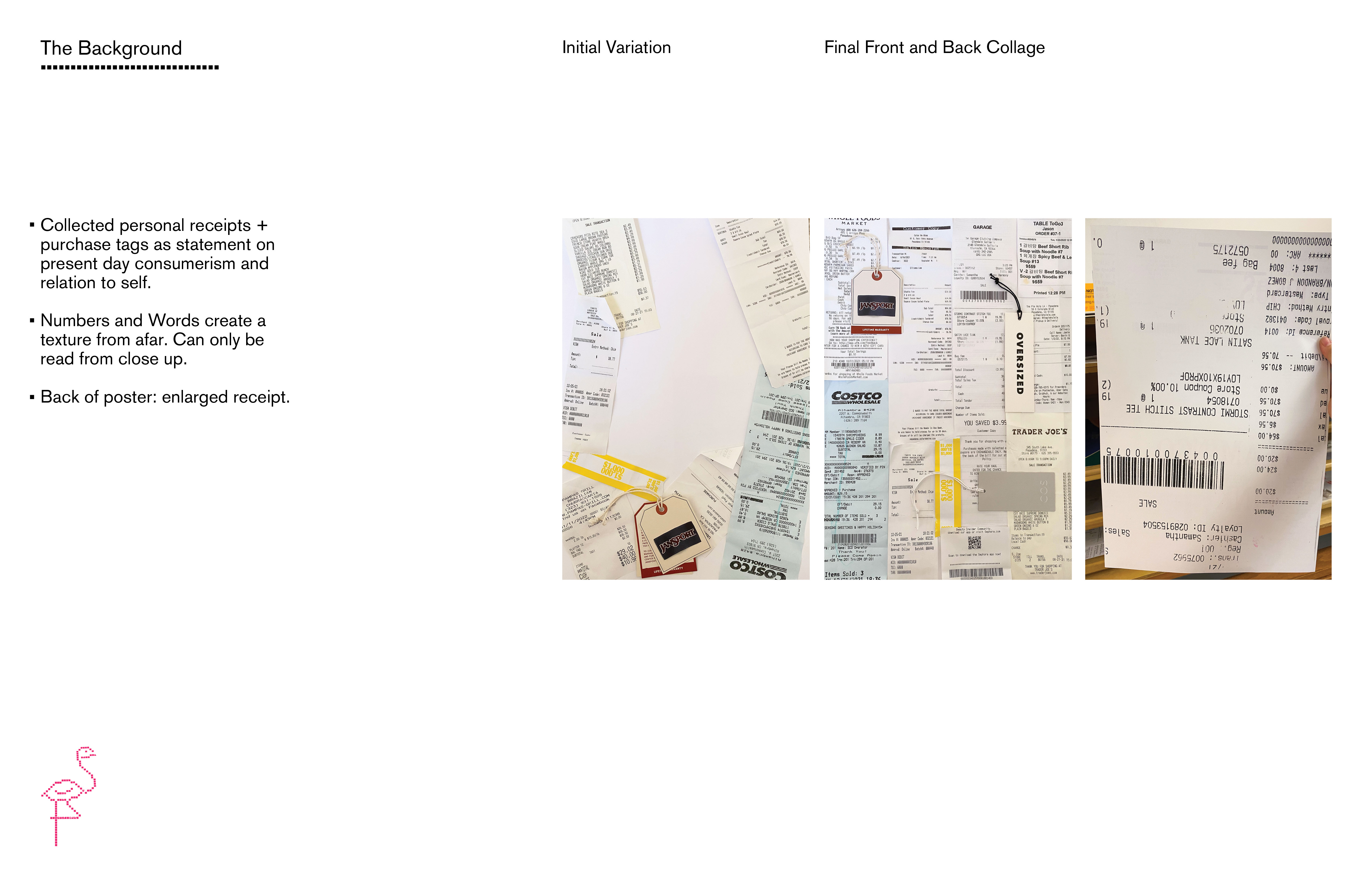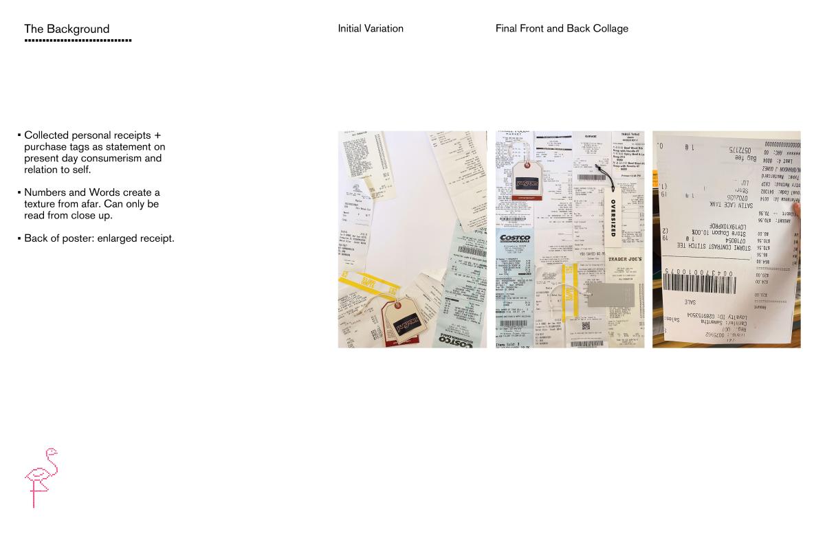 Based on Jennifer Price's "The Plastic Pink Flamingo," this poster highlights the mass consumerism and production boom of the 1960s, through the trendy plastic pink flamingo. To relate this concept from the past to today, I collected personal receipts to consider my individual role in today's consumerist society.