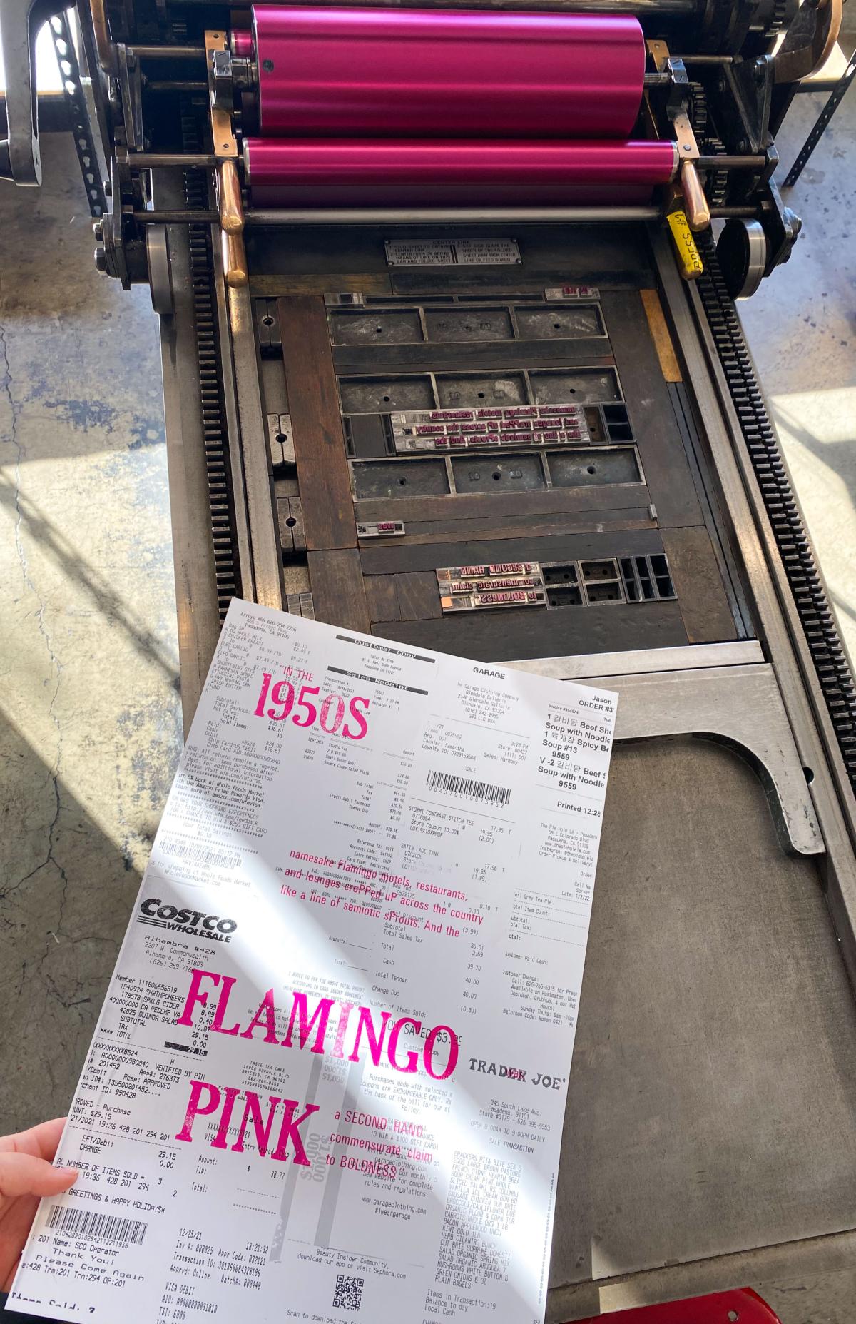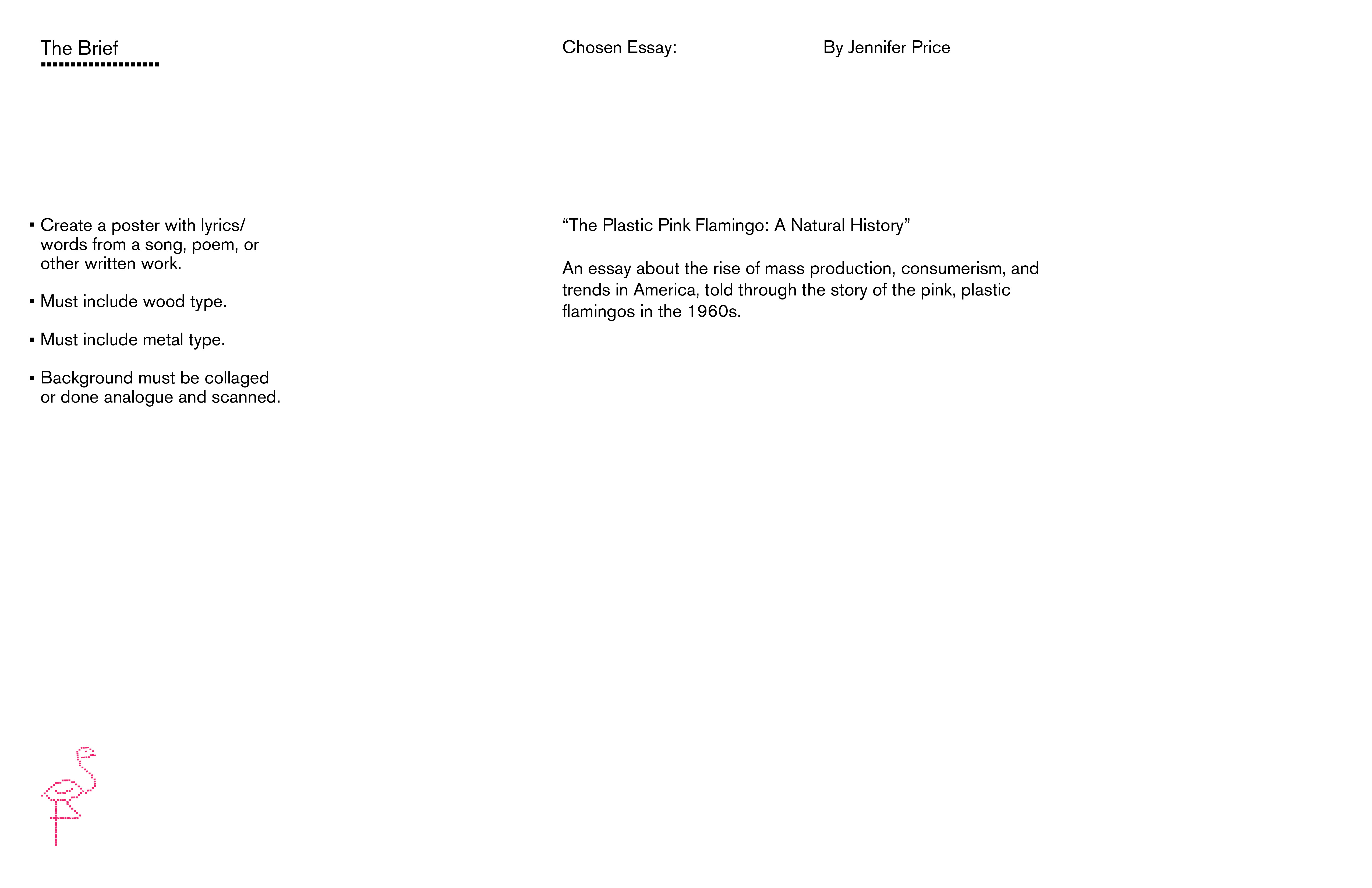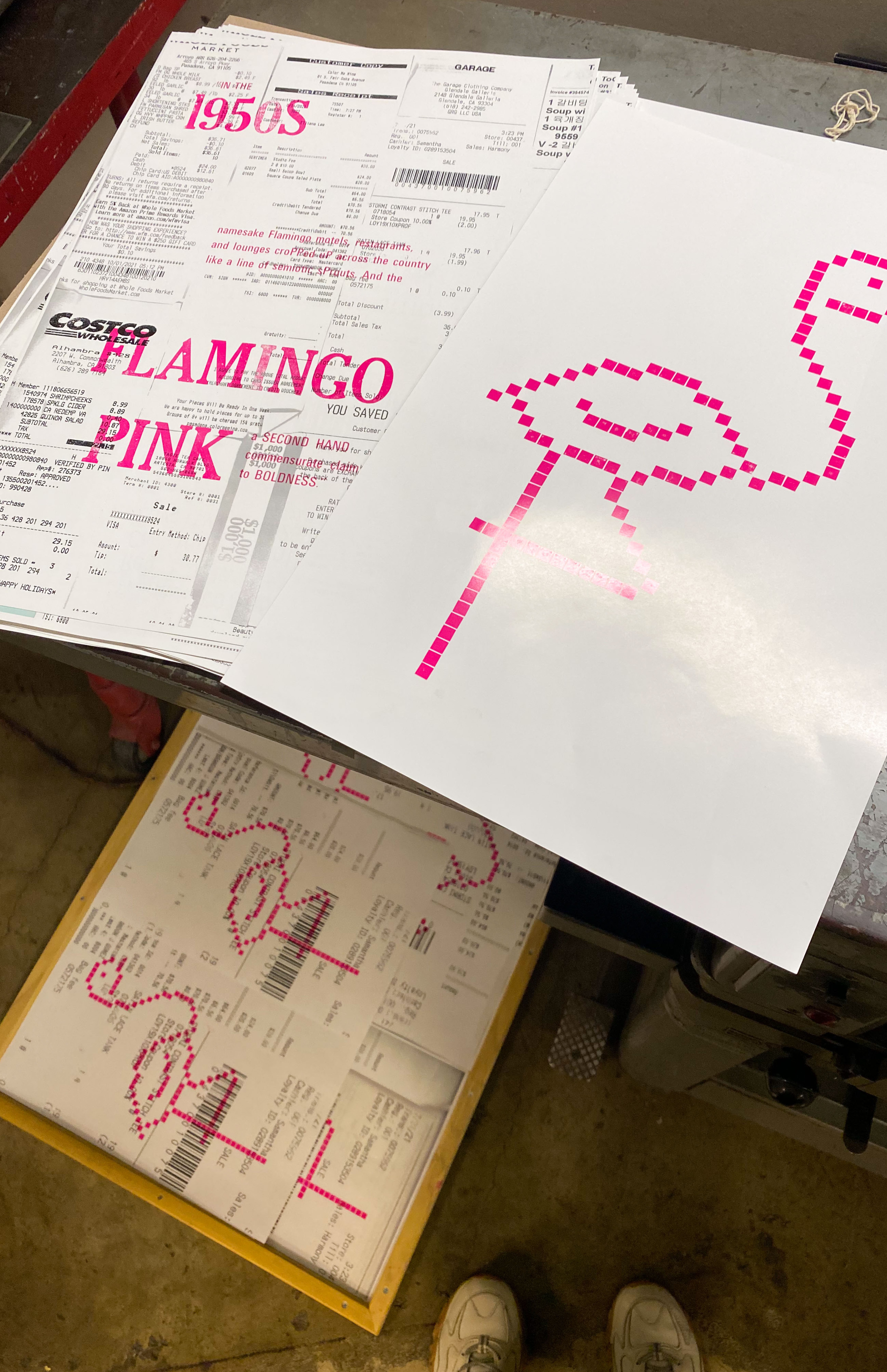 Based on Jennifer Price's "The Plastic Pink Flamingo," this poster highlights the mass consumerism and production boom of the 1960s, through the trendy plastic pink flamingo. To relate this concept from the past to today, I collected personal receipts to consider my individual role in today's consumerist society.