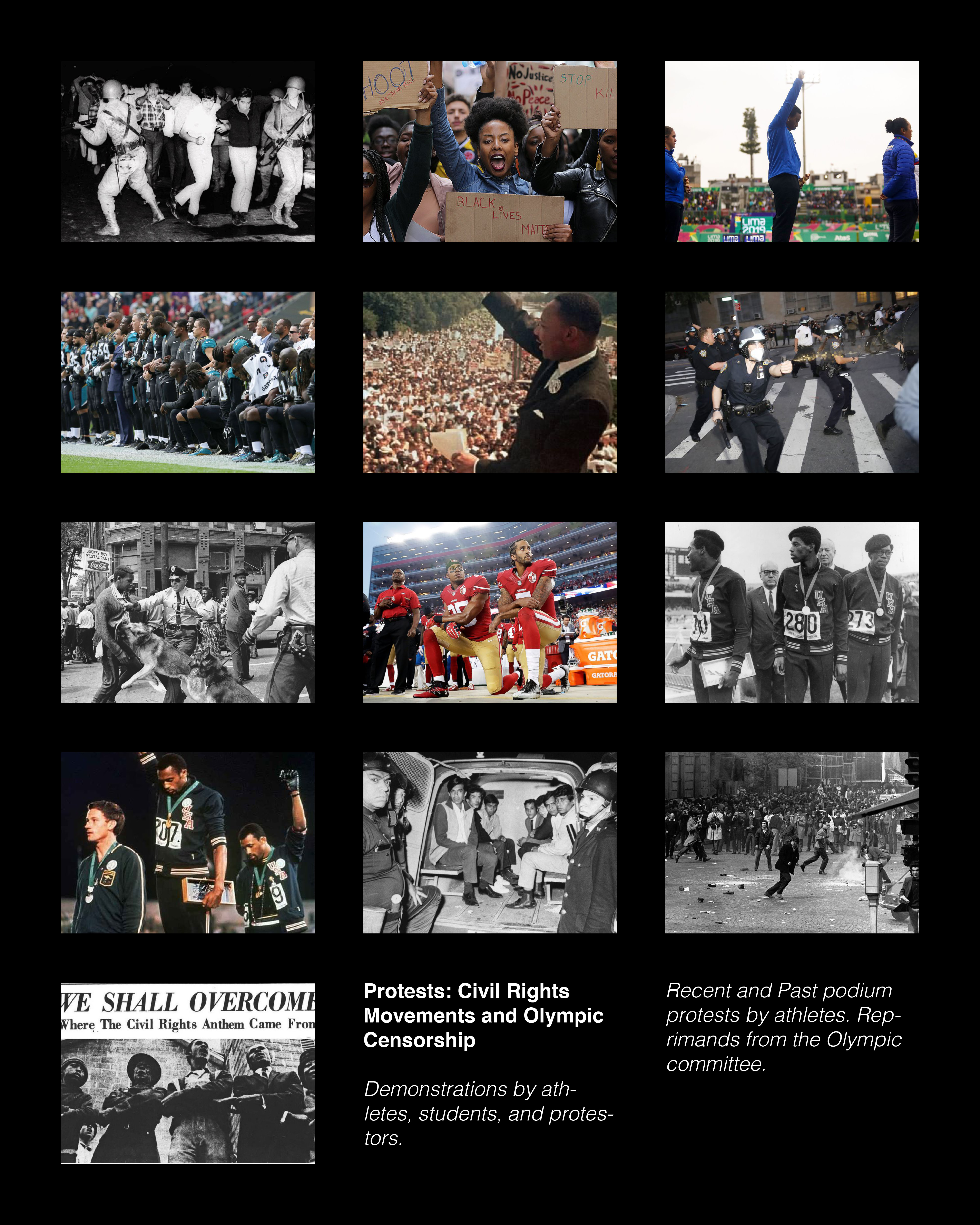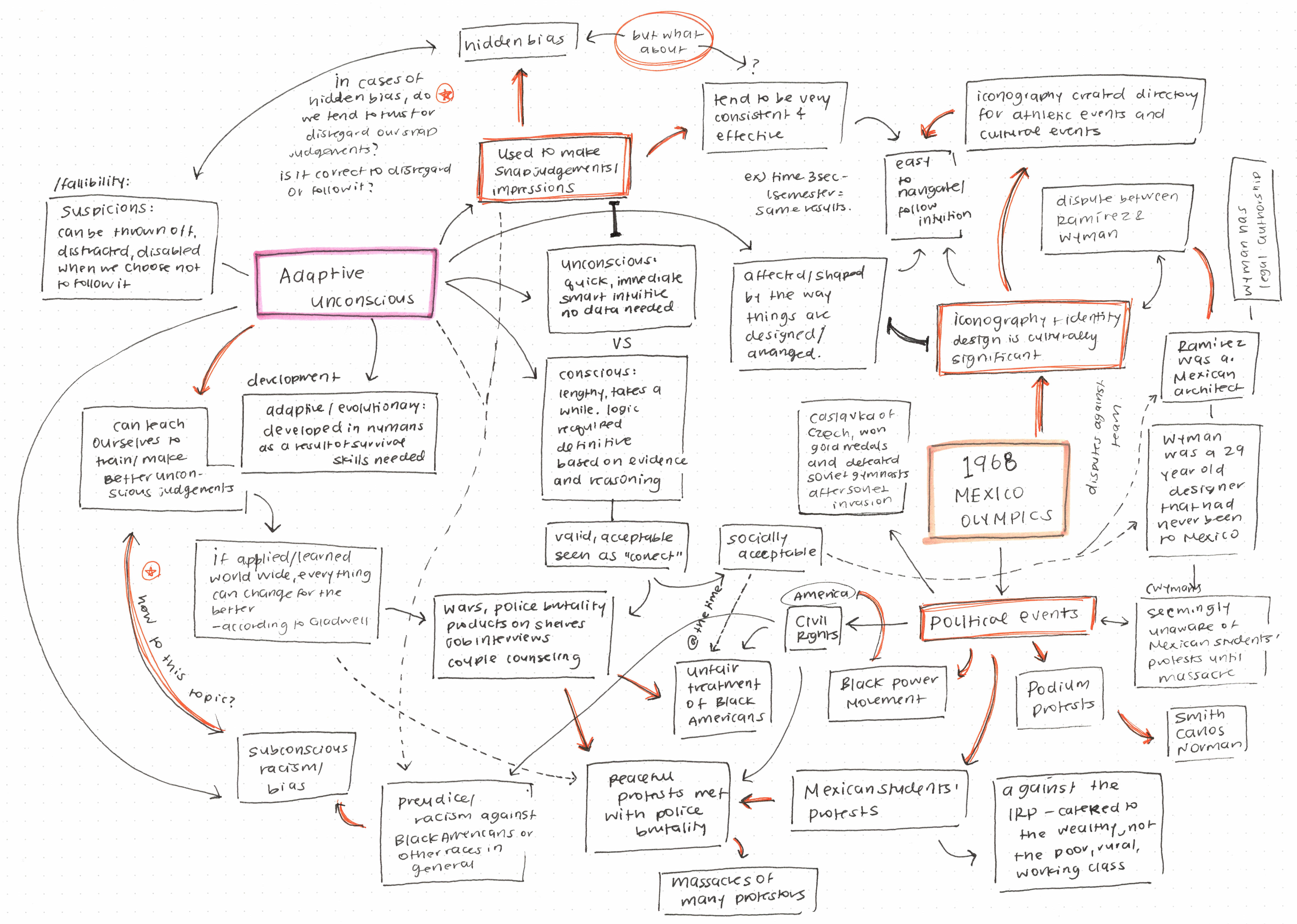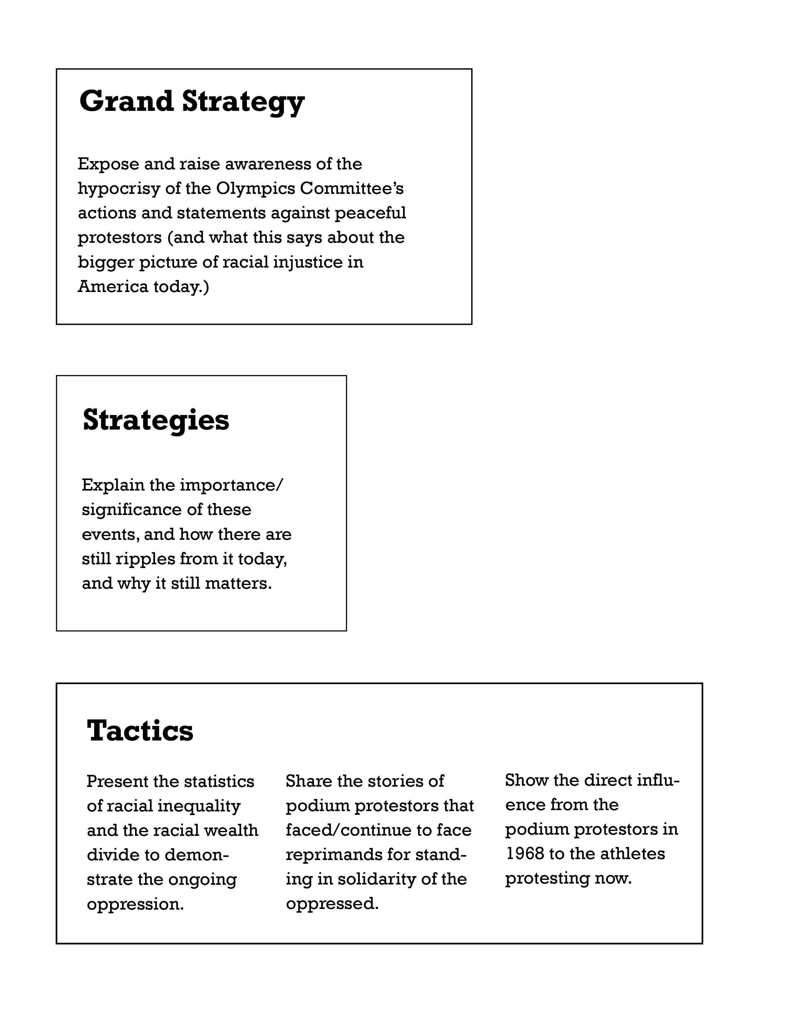 Brainstorm: my given topic was the 1968 Olympics. From there, I delved into the Civil Rights Movement, the records set in that year, the branding design of the Olympics, and the podium protests that sparked that year.