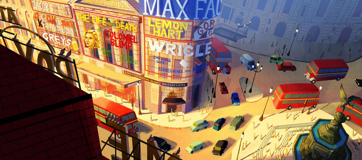 This is a painting of London's Piccadilly Circus and the London Pavilion from the 1950s. It highlights the golden hour sunlight by pushing warm yellow lights and contrasting with the cool shade of the shadow.